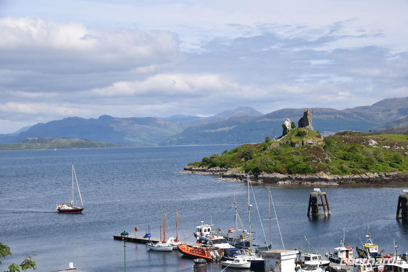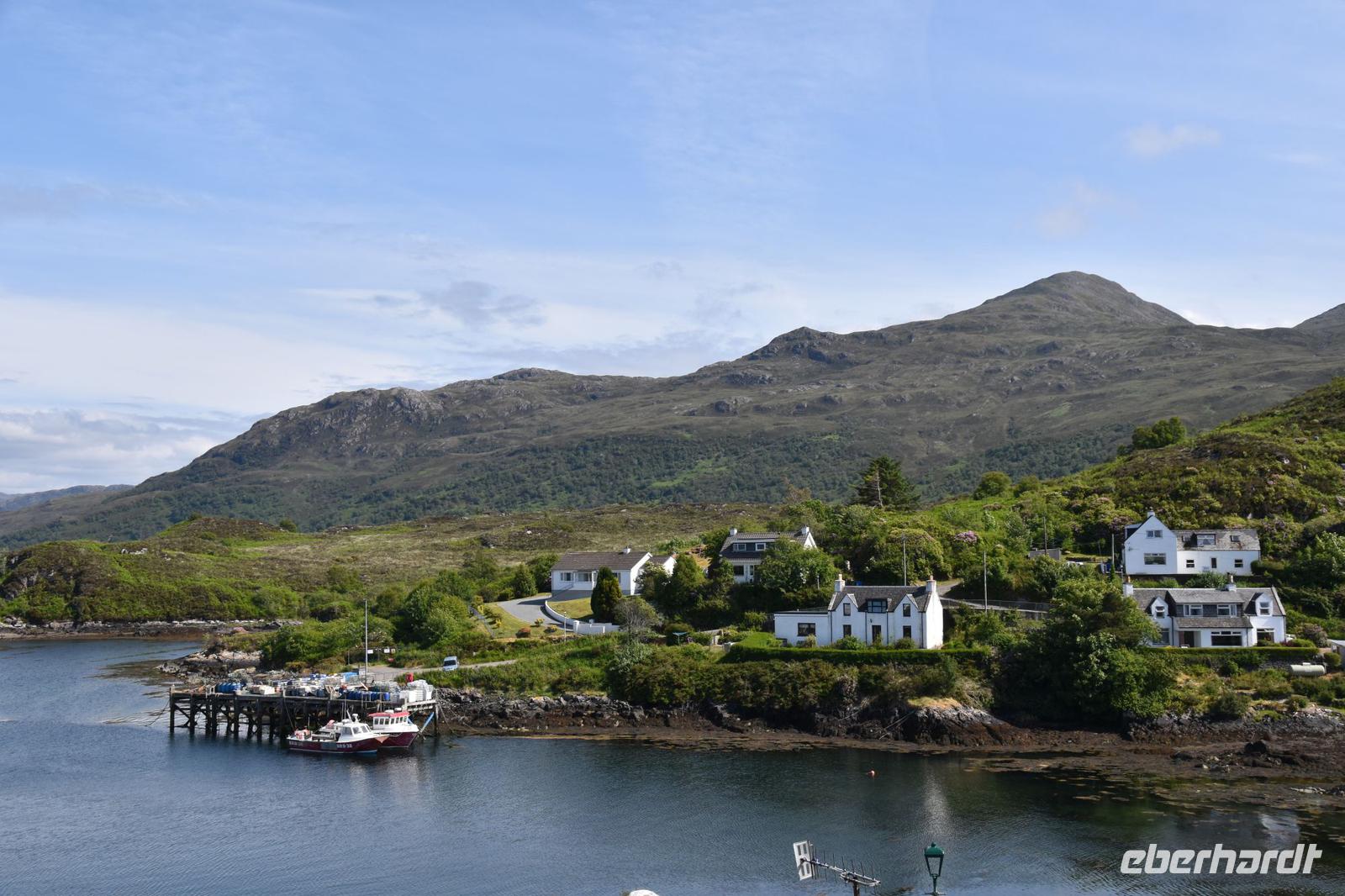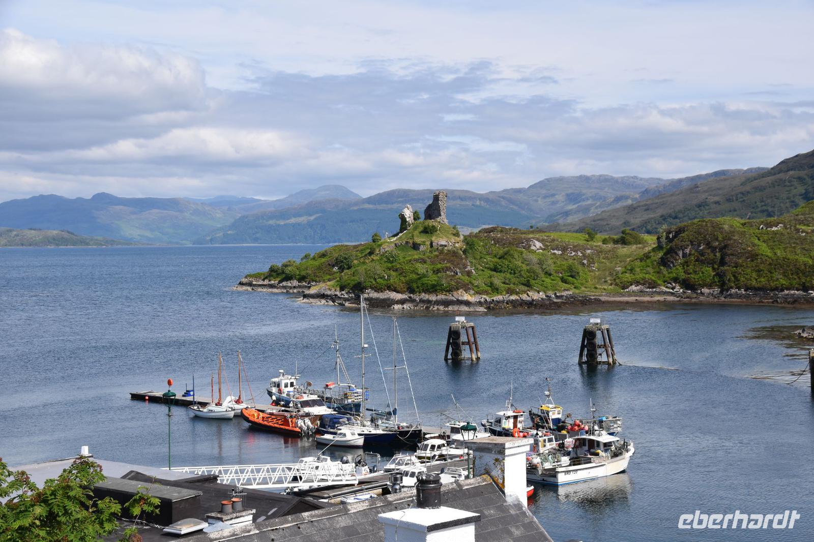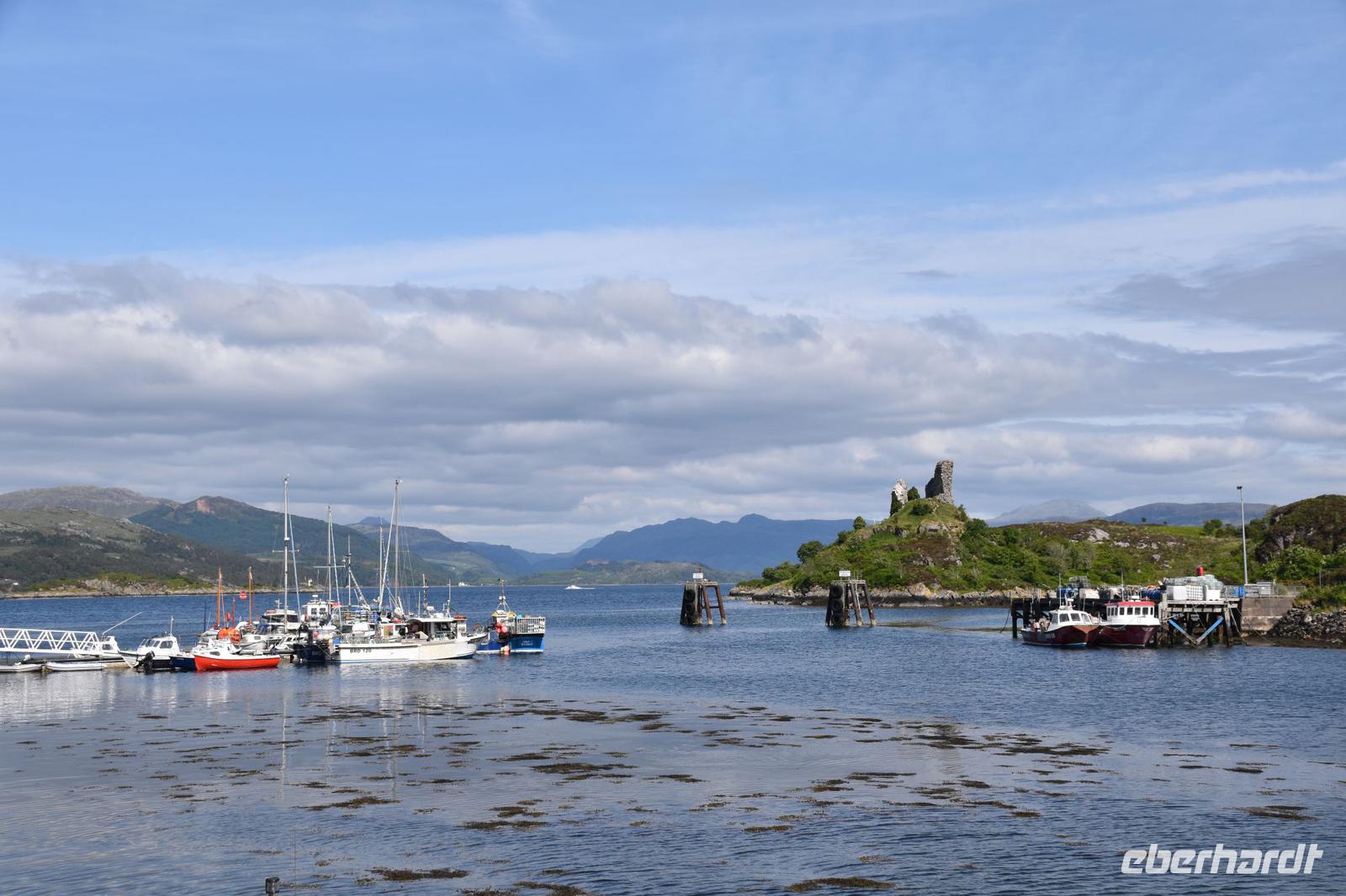 Am Nachmittag fahren wir durch die Landschaft der nahen der Cuillin Hills nach Sligachan, wo wir beide Massive dieser Berge bewundern können, die Roten und die Schwarzen. In Kyleakin, direkt neben der Skyebridge, am Loch Alsh liegt unser Kings Arms Hotel. Gegenüber die kleine Burgruine Moan des Ortes.