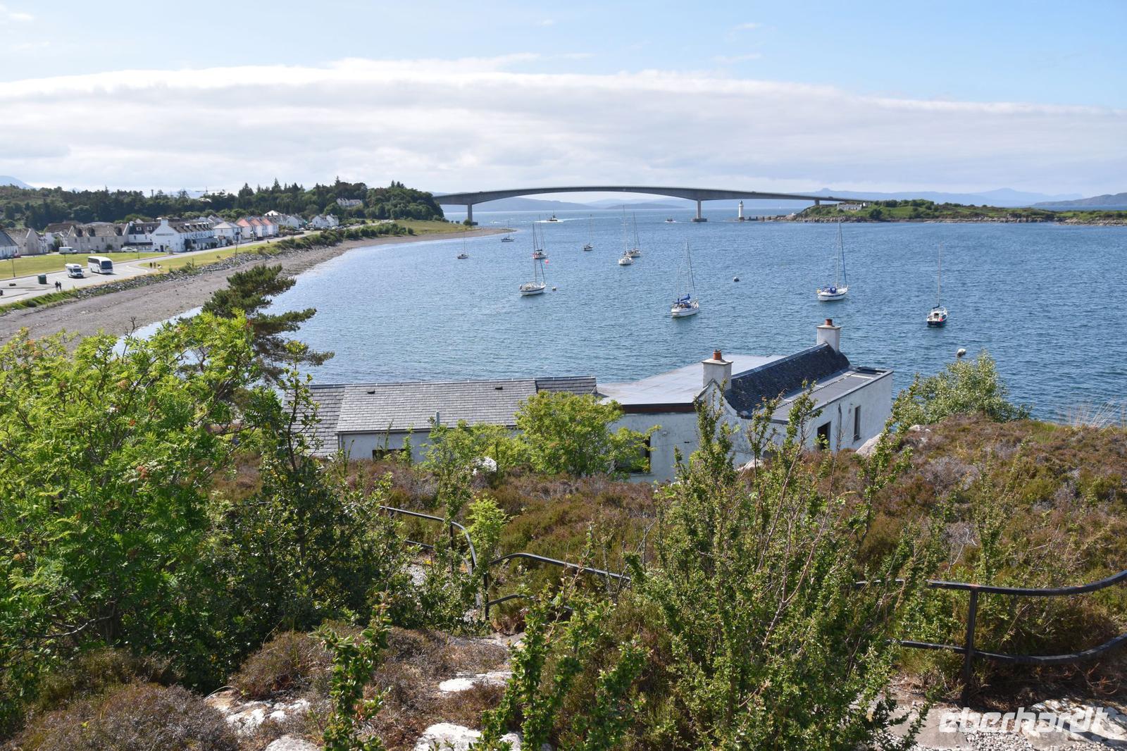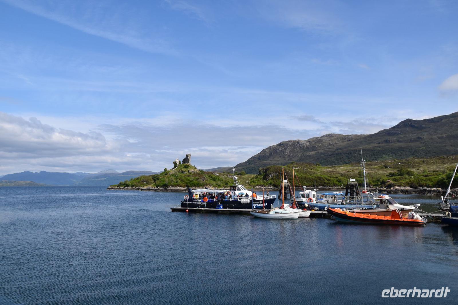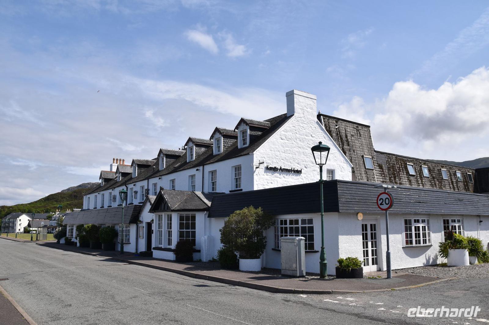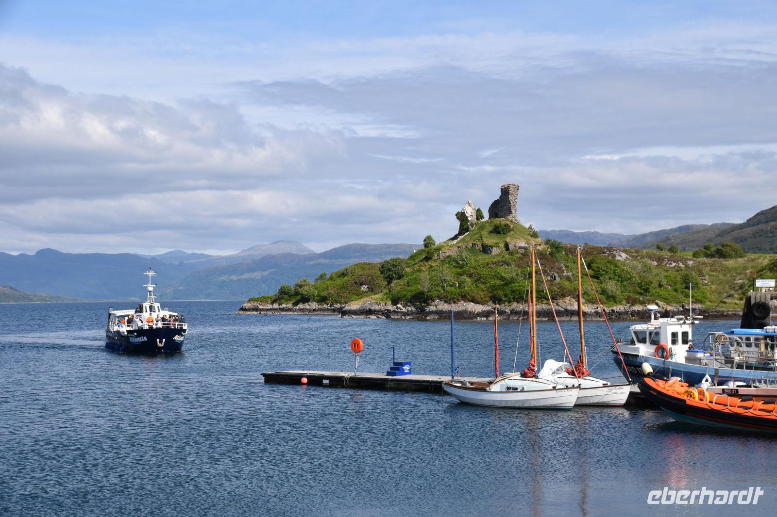 Am Nachmittag fahren wir durch die Landschaft der nahen der Cuillin Hills nach Sligachan, wo wir beide Massive dieser Berge bewundern können, die Roten und die Schwarzen. In Kyleakin, direkt neben der Skyebridge, am Loch Alsh liegt unser Kings Arms Hotel. Gegenüber die kleine Burgruine Moan des Ortes.