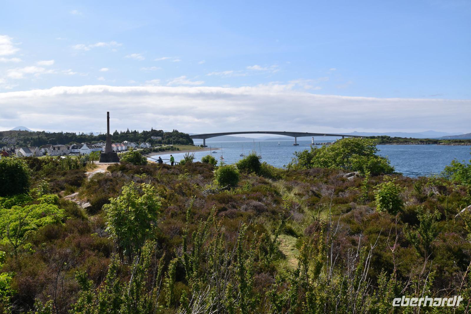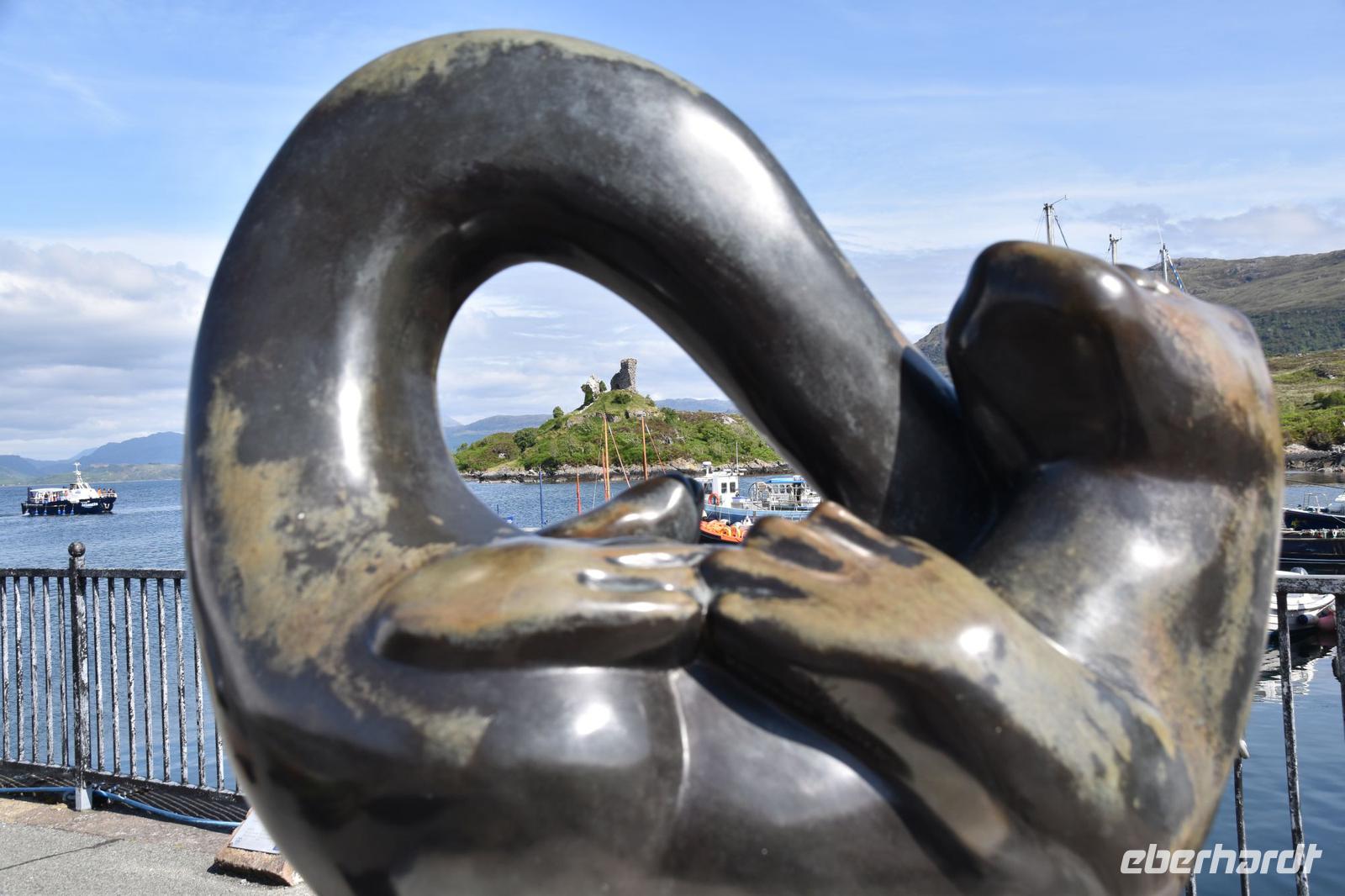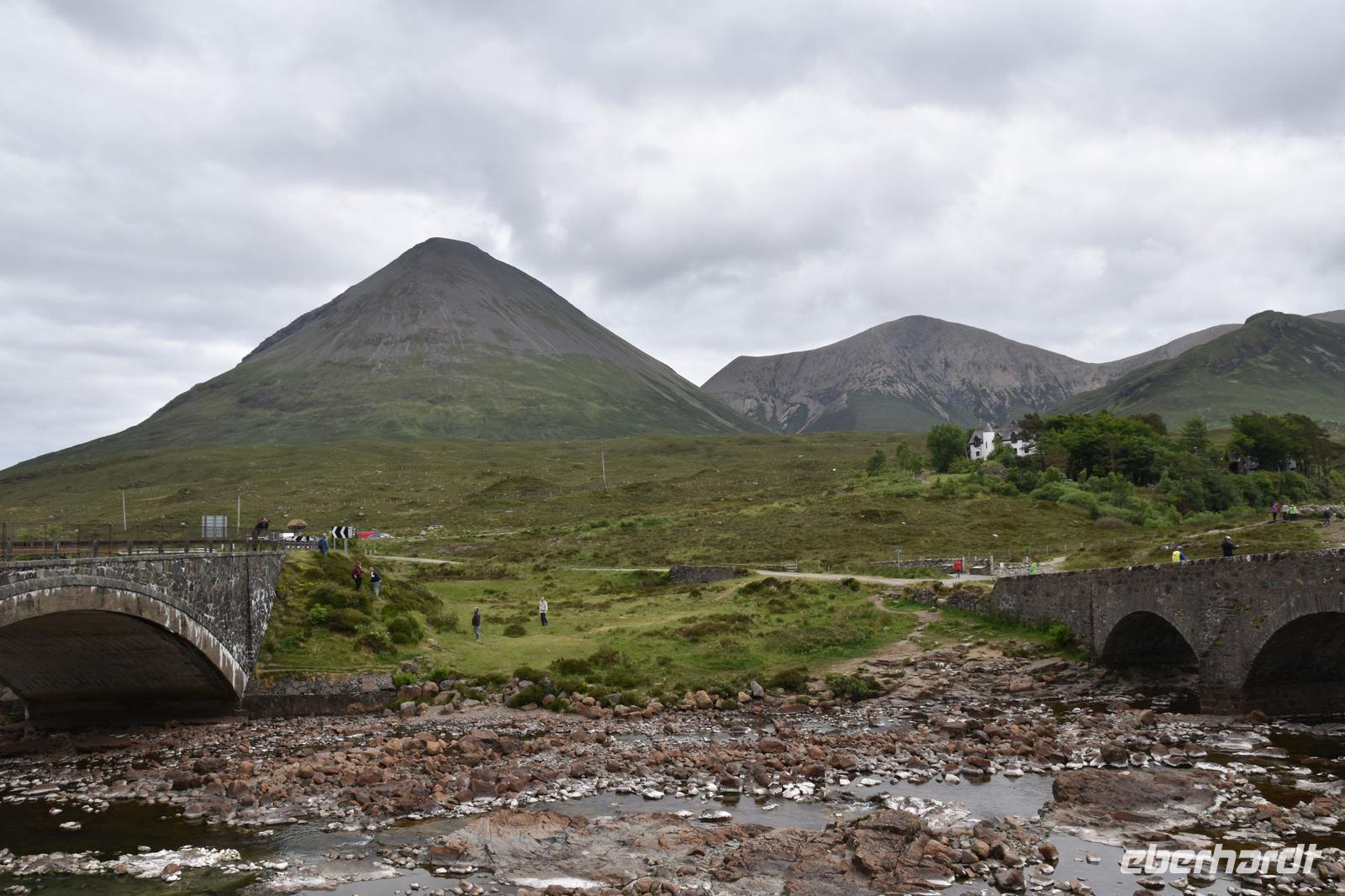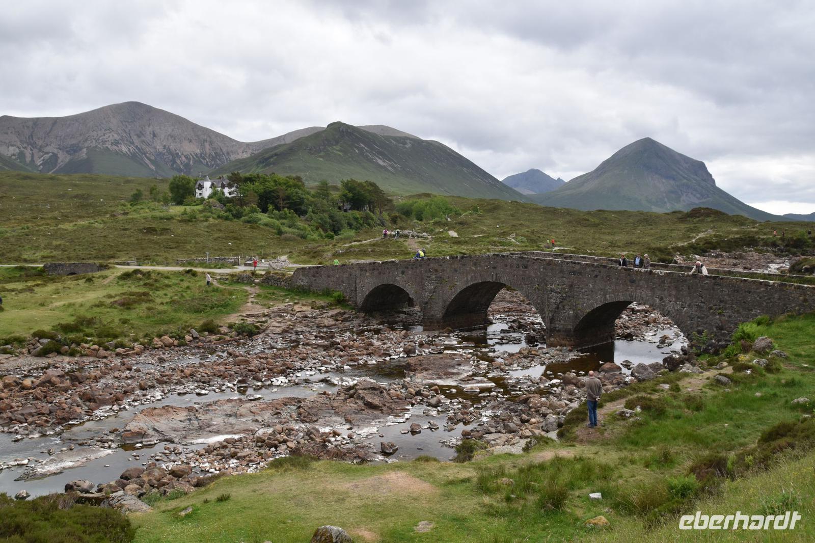 Am Nachmittag fahren wir durch die Landschaft der nahen der Cuillin Hills nach Sligachan, wo wir beide Massive dieser Berge bewundern können, die Roten und die Schwarzen. In Kyleakin, direkt neben der Skyebridge, am Loch Alsh liegt unser Kings Arms Hotel. Gegenüber die kleine Burgruine Moan des Ortes.
