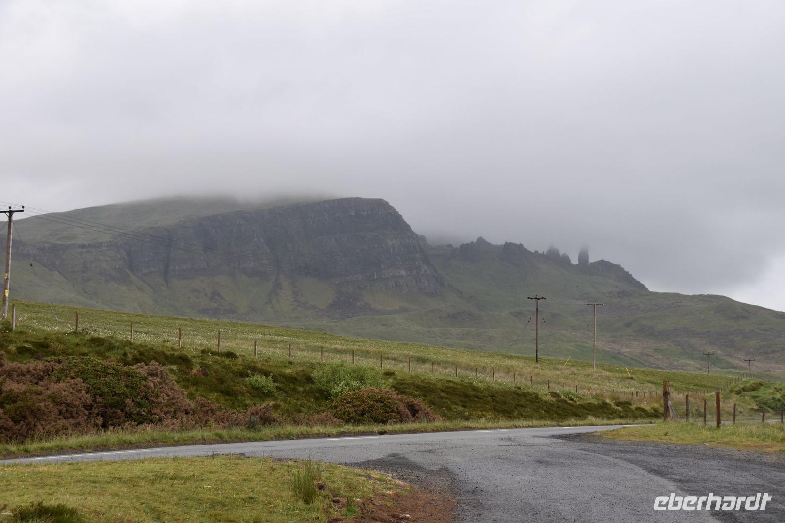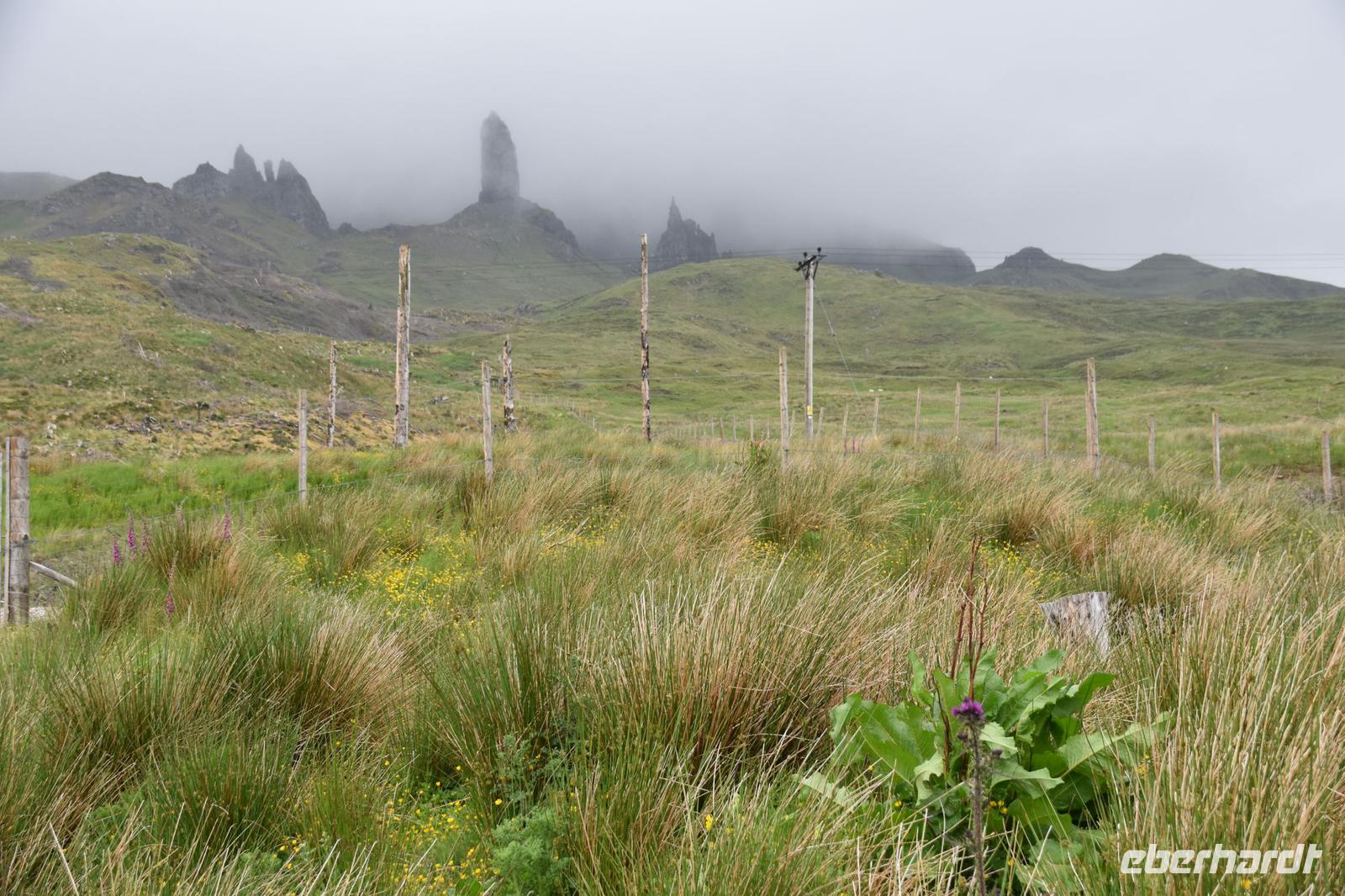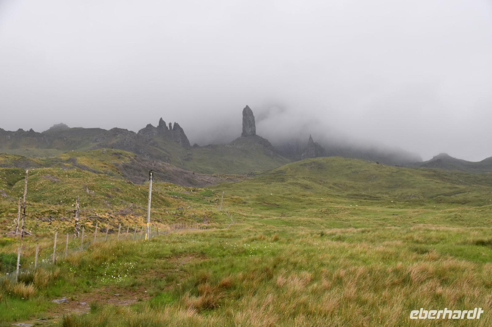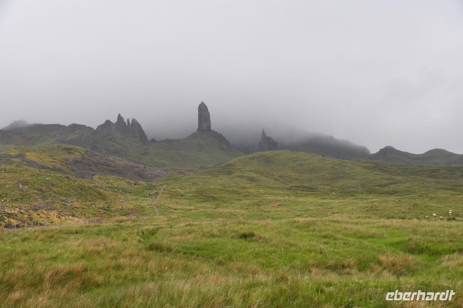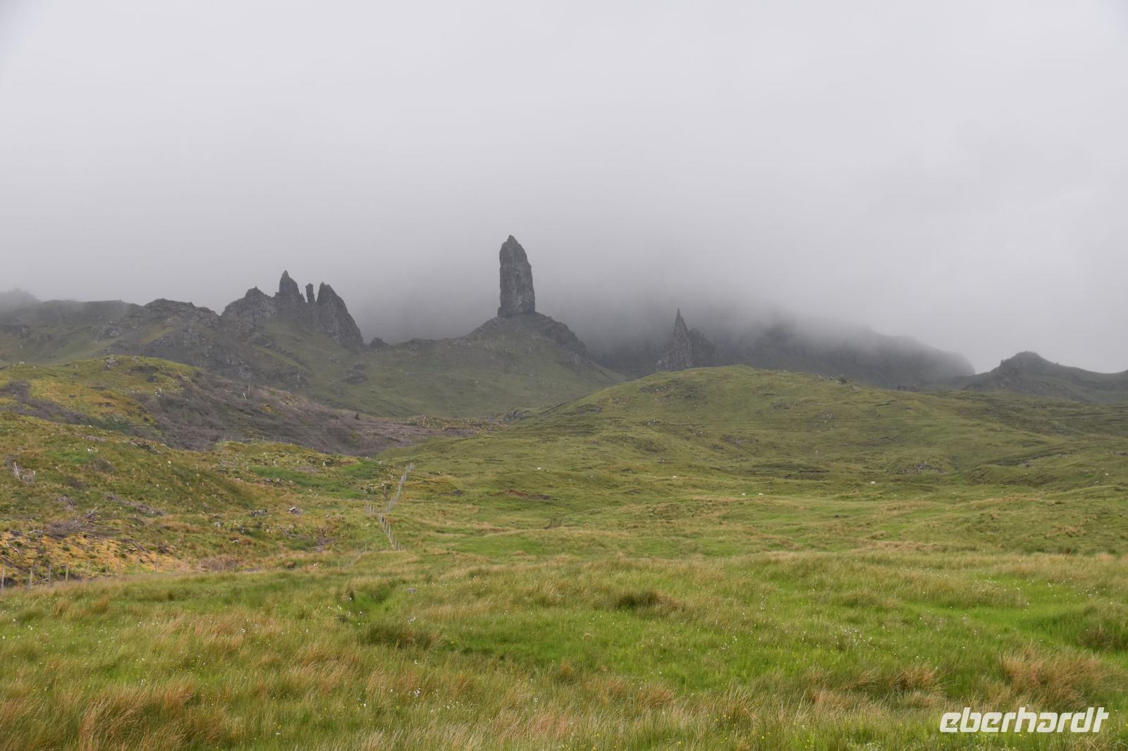 Die Wolken kommen immer weiter herab, und ziehen um den Old Man of Storr, der glücklicherweise immer wieder aus Ihnen auftaucht.