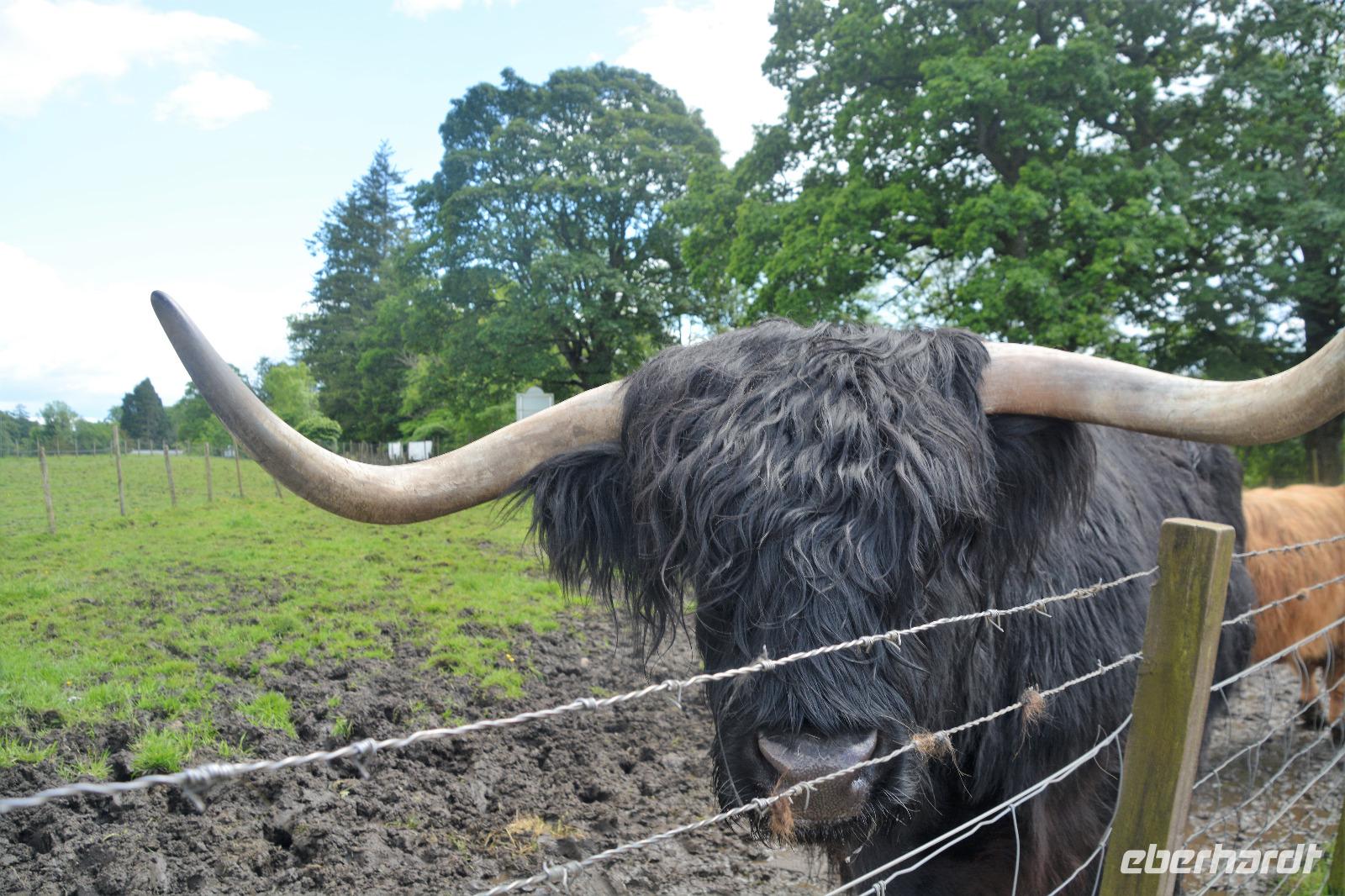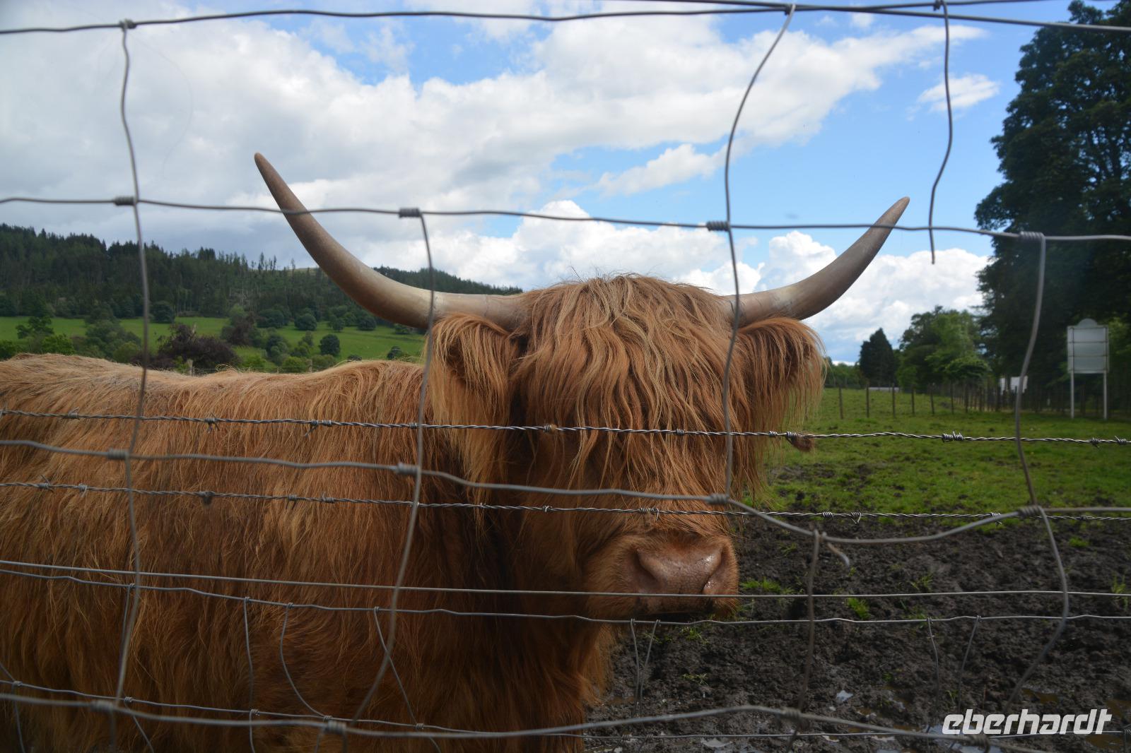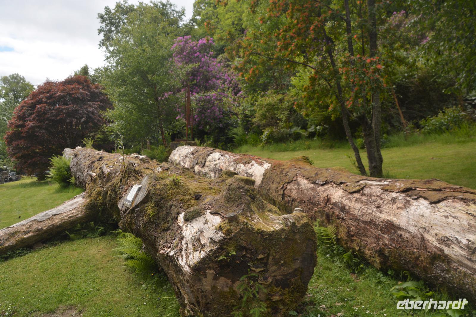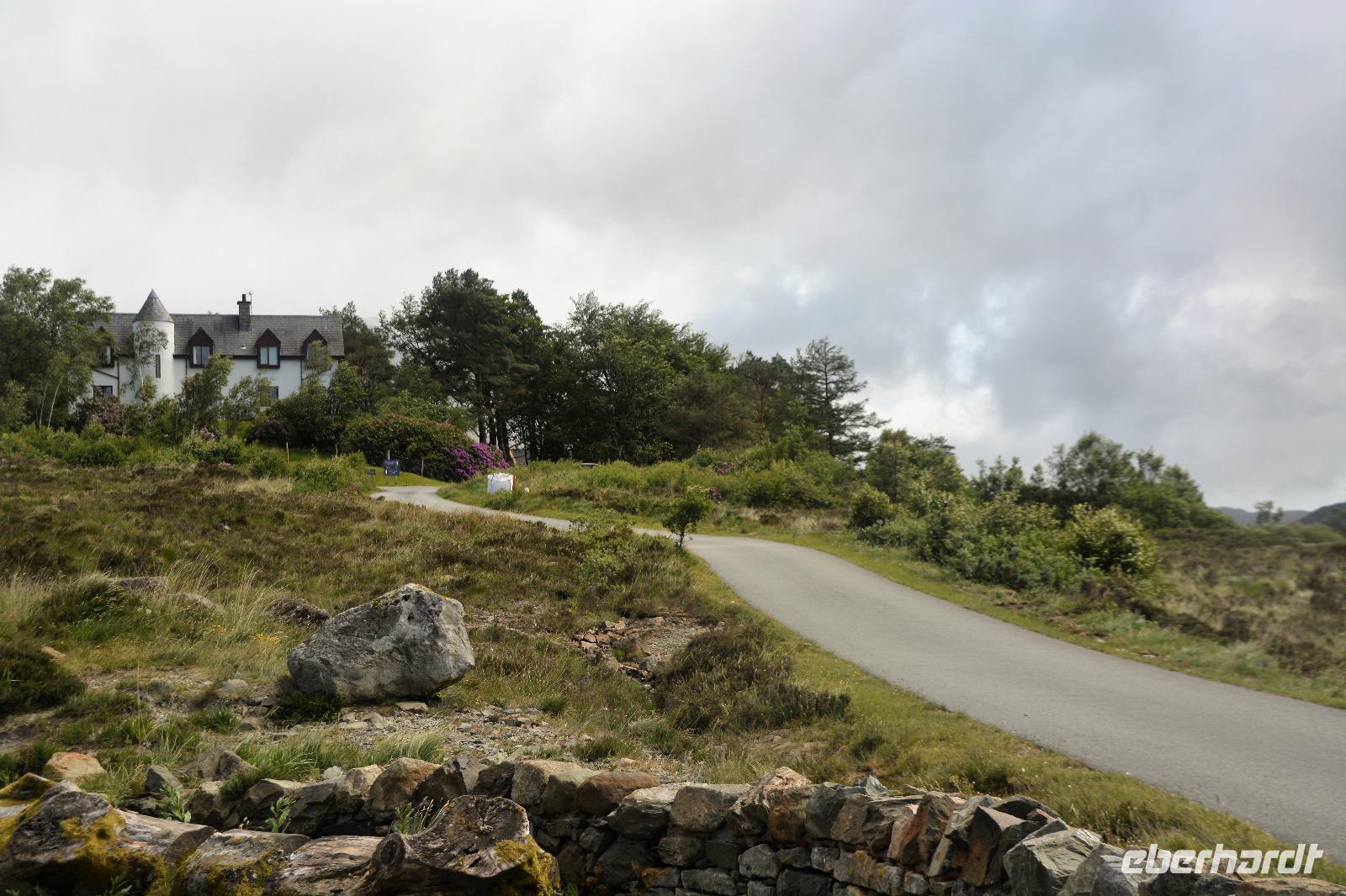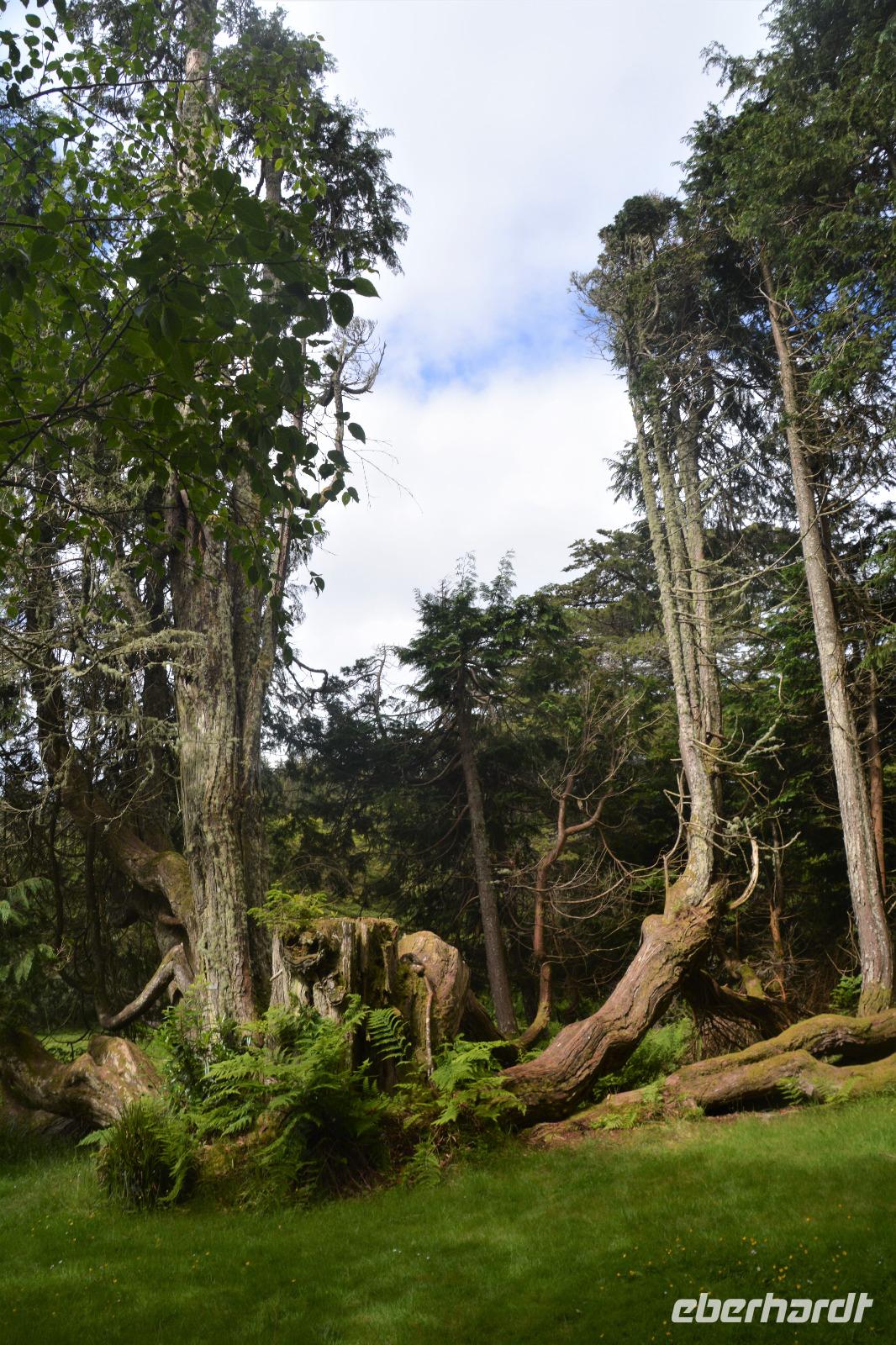 Heute geht es etwas früher los, da wir eine lange Strecke zurückzulegen haben und die Straßen sich ziemlich durch die Landschaft schlängeln. Wir fahren über die "Skye Bridge", die im Jahr 1995 eröffnet wurde und zu Beginn durch ihre hohen Mautgebühren zu vielen Kontroversen führte. Das war mit dem Kauf der Brücke durch die schott. Exekutive mit 27 Mio. Pfund erledigt. Heute fährt man ohne Zahlung hinüber auf das Festland. Die Brücke hat eine maximale Spannweite von 250 m und ist insgesamt 5oo m lang. So sind wir wieder auf dem Festland und werfen noch einmal einen Blick zurück zur einsamen Insel Skye. Gleich sind wir am Silean Donan Castle welches der Stammsitz des Clans der MacRae gehört. So stellt man sich eine schottische Burg vor. Trutzig beherrscht sie die Szenerie. Sie liegt wie es scheint auf einer Insel, gibt es doch eine kleine Brücke zu ihr. Bei Flut könnte man nicht trockenen Fusses zu ihr gelangen, bei Ebbe schon - könnten wir, wenn das Schloss schon geöffnet hätte. Aber wir sind zu früh und so fahren wir weiter. Wir fahren durch die heute sehr feuchte schottiscche Landschaft. Dunkle Wolken lassen nicht Gutes ahnen aber das Wetter ändert sich hier ständig. Wir fahren durch schöne Heidelandschaft zum Loch Maree und finden vor unserem nächsten Haltepunkt eine Möglichkeit zur Befriedigung einiger dringender Bedürfnisse. Gut dass wir gehalten haben, denn an der folgenden "Beinn Eight" Center sind die Toilettenanlagen kaputt.Wir machen hier eine längere Pause zum Spazieren und schauen: es gibt ein kleines Museum und wir können durch eine Kamera Vögel an Futterröhren beobachten. Ein schöner Weg führt zu durch einen dichten Wald zu einem Aussichtspunkt und es herrscht eine friedliche Atmosphäre. Bald geht es weiter in Richtung Gairloch. Die Fotostopps sind wegen dem regnerischen Wetter heute nicht so zahlreich, wir passieren Gairloch und fiebern unserem Highlight von heute entgegen, dem "Inverewe Garten" am Loch Ewe. Er soll einer der nörlichsten botanischen Gärten weltweit sein und er liegt im Golfstrom, der Meeresstrom aus dem Golf von Mexiko der das Klima Westeuropas und besonders einiger Gebiet im Nordwesten Europas maßgeblich beeinflusst. Es wird nicht zuviel versprochen. Der Inverewe Garten wurde von Osgood Mackenzie und seiner Tochter angelegt. Sie verwandelten wohl ein ziemlich ödes Gebiet in ein Paradies. Das Klima und auch architektonische Rafinesse sorgen für ein besonders Klima und die Bedingungen sorgen dafür dass sich Pflanzen aus Australien, Neuseeland und sogar Tasmanien hier wohl fühlen. Man wandelt unter Urwaldriesen. Das Haus der Mackenzies kann besichtigt werden und man hat das Gefühl, man würde von den Bewohnern gleich begrüßt. Liebevoll wurden Souvenirs aus der ganzen Welt zusammengetragen und man bekommt ein Gefühl für die Wohnkultur der wohlhabenden Schotten des 19. Jahrhunderts.Wir müssen leider weiter und machen noch eine kleine Wanderung in der "Corrieshalloch Gorge" zu einem Wasserfall. Eine wackelige Hängebrücke gehört auch dazu. Wir überstehen alles gut und so langsam freuen wir uns auf ein nettes Hotel. Es geht noch ein wenig durch schottische Landschaft und schließlich kommen wir in Beauly im "Lovat Arms Hotel" an. Ein niedliches Hotel mit unverwechselbarem britischen Charme. Schottenkaros, Viktorianisches und sogar einige Himmelbetten erwarten uns. Und da ist auch ein leibhaftiger Kamin. Das Essen schmeckt vorzüglich und so beenden wir einen fast perfekten Tag (warum fast? nun die Sonne hätte schon ein klein wenig mehr scheinen können!)