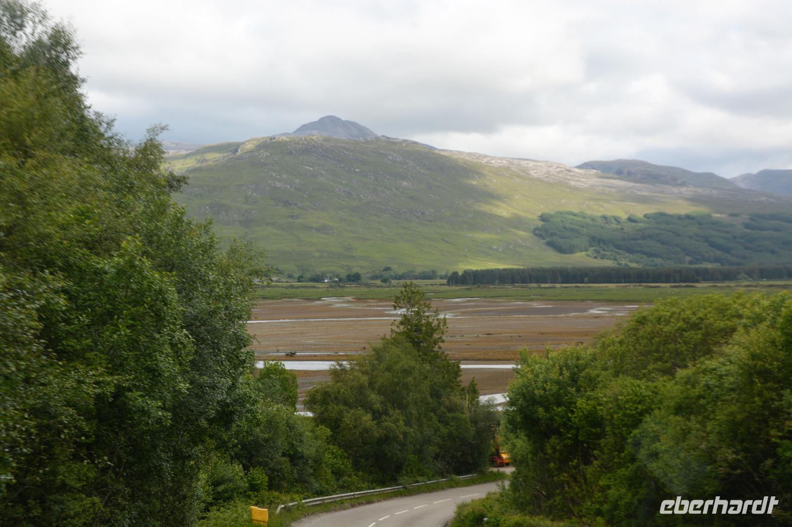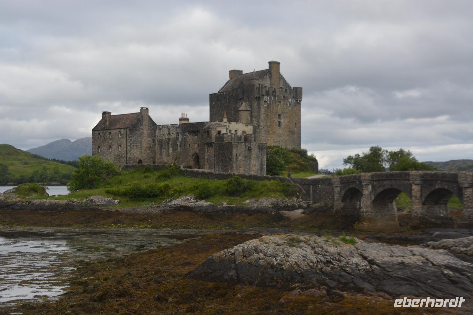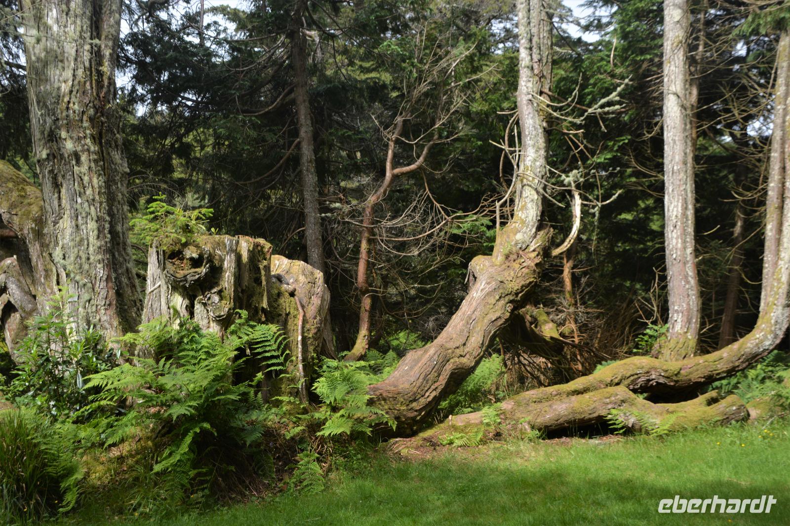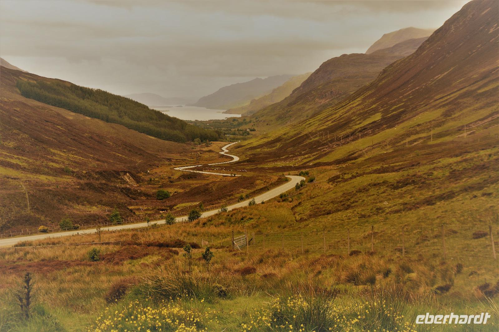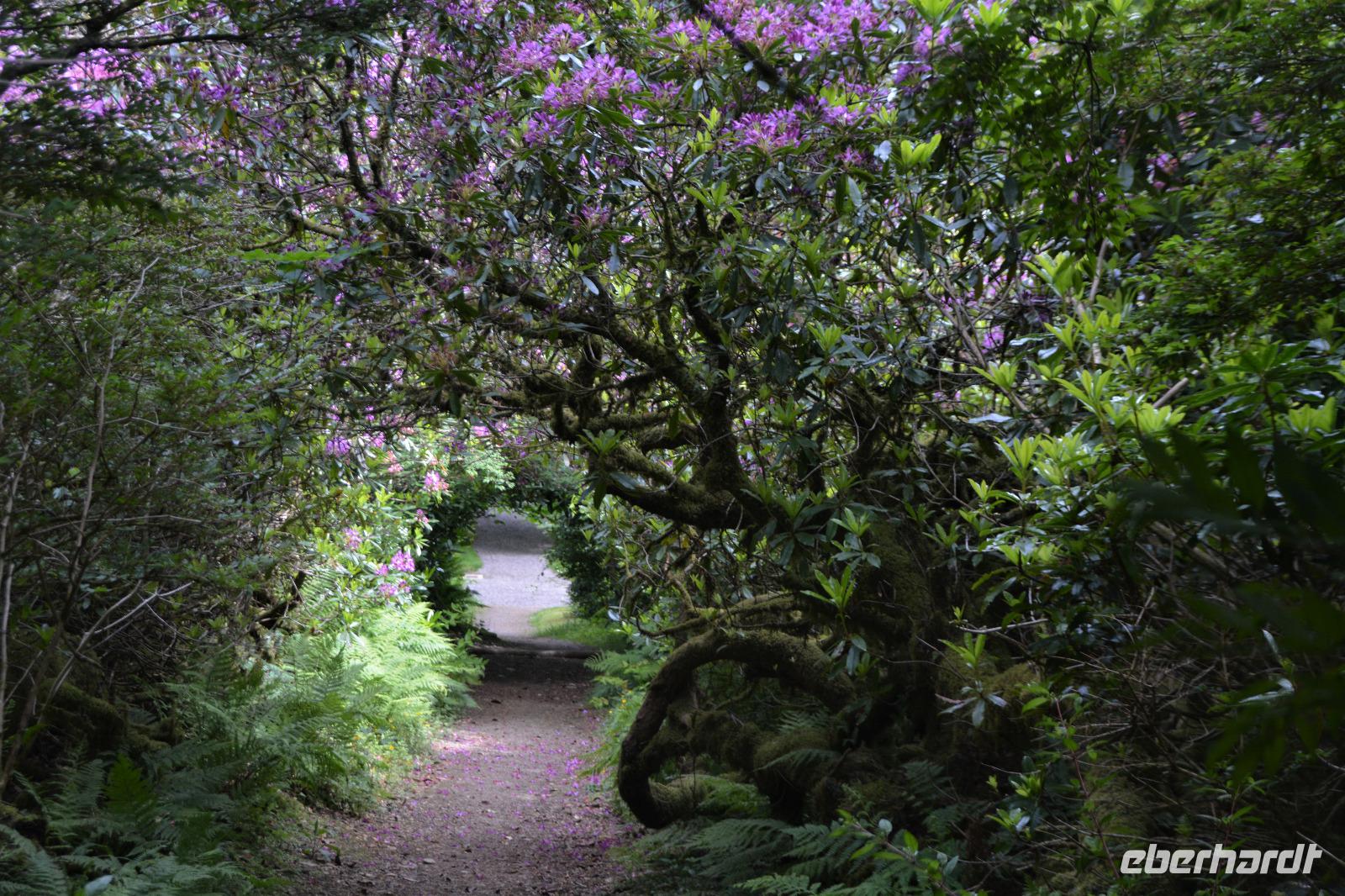 Heute geht es etwas früher los, da wir eine lange Strecke zurückzulegen haben und die Straßen sich ziemlich durch die Landschaft schlängeln. Wir fahren über die "Skye Bridge", die im Jahr 1995 eröffnet wurde und zu Beginn durch ihre hohen Mautgebühren zu vielen Kontroversen führte. Das war mit dem Kauf der Brücke durch die schott. Exekutive mit 27 Mio. Pfund erledigt. Heute fährt man ohne Zahlung hinüber auf das Festland. Die Brücke hat eine maximale Spannweite von 250 m und ist insgesamt 5oo m lang. So sind wir wieder auf dem Festland und werfen noch einmal einen Blick zurück zur einsamen Insel Skye. Gleich sind wir am Silean Donan Castle welches der Stammsitz des Clans der MacRae gehört. So stellt man sich eine schottische Burg vor. Trutzig beherrscht sie die Szenerie. Sie liegt wie es scheint auf einer Insel, gibt es doch eine kleine Brücke zu ihr. Bei Flut könnte man nicht trockenen Fusses zu ihr gelangen, bei Ebbe schon - könnten wir, wenn das Schloss schon geöffnet hätte. Aber wir sind zu früh und so fahren wir weiter. Wir fahren durch die heute sehr feuchte schottiscche Landschaft. Dunkle Wolken lassen nicht Gutes ahnen aber das Wetter ändert sich hier ständig. Wir fahren durch schöne Heidelandschaft zum Loch Maree und finden vor unserem nächsten Haltepunkt eine Möglichkeit zur Befriedigung einiger dringender Bedürfnisse. Gut dass wir gehalten haben, denn an der folgenden "Beinn Eight" Center sind die Toilettenanlagen kaputt.Wir machen hier eine längere Pause zum Spazieren und schauen: es gibt ein kleines Museum und wir können durch eine Kamera Vögel an Futterröhren beobachten. Ein schöner Weg führt zu durch einen dichten Wald zu einem Aussichtspunkt und es herrscht eine friedliche Atmosphäre. Bald geht es weiter in Richtung Gairloch. Die Fotostopps sind wegen dem regnerischen Wetter heute nicht so zahlreich, wir passieren Gairloch und fiebern unserem Highlight von heute entgegen, dem "Inverewe Garten" am Loch Ewe. Er soll einer der nörlichsten botanischen Gärten weltweit sein und er liegt im Golfstrom, der Meeresstrom aus dem Golf von Mexiko der das Klima Westeuropas und besonders einiger Gebiet im Nordwesten Europas maßgeblich beeinflusst. Es wird nicht zuviel versprochen. Der Inverewe Garten wurde von Osgood Mackenzie und seiner Tochter angelegt. Sie verwandelten wohl ein ziemlich ödes Gebiet in ein Paradies. Das Klima und auch architektonische Rafinesse sorgen für ein besonders Klima und die Bedingungen sorgen dafür dass sich Pflanzen aus Australien, Neuseeland und sogar Tasmanien hier wohl fühlen. Man wandelt unter Urwaldriesen. Das Haus der Mackenzies kann besichtigt werden und man hat das Gefühl, man würde von den Bewohnern gleich begrüßt. Liebevoll wurden Souvenirs aus der ganzen Welt zusammengetragen und man bekommt ein Gefühl für die Wohnkultur der wohlhabenden Schotten des 19. Jahrhunderts.Wir müssen leider weiter und machen noch eine kleine Wanderung in der "Corrieshalloch Gorge" zu einem Wasserfall. Eine wackelige Hängebrücke gehört auch dazu. Wir überstehen alles gut und so langsam freuen wir uns auf ein nettes Hotel. Es geht noch ein wenig durch schottische Landschaft und schließlich kommen wir in Beauly im "Lovat Arms Hotel" an. Ein niedliches Hotel mit unverwechselbarem britischen Charme. Schottenkaros, Viktorianisches und sogar einige Himmelbetten erwarten uns. Und da ist auch ein leibhaftiger Kamin. Das Essen schmeckt vorzüglich und so beenden wir einen fast perfekten Tag (warum fast? nun die Sonne hätte schon ein klein wenig mehr scheinen können!)