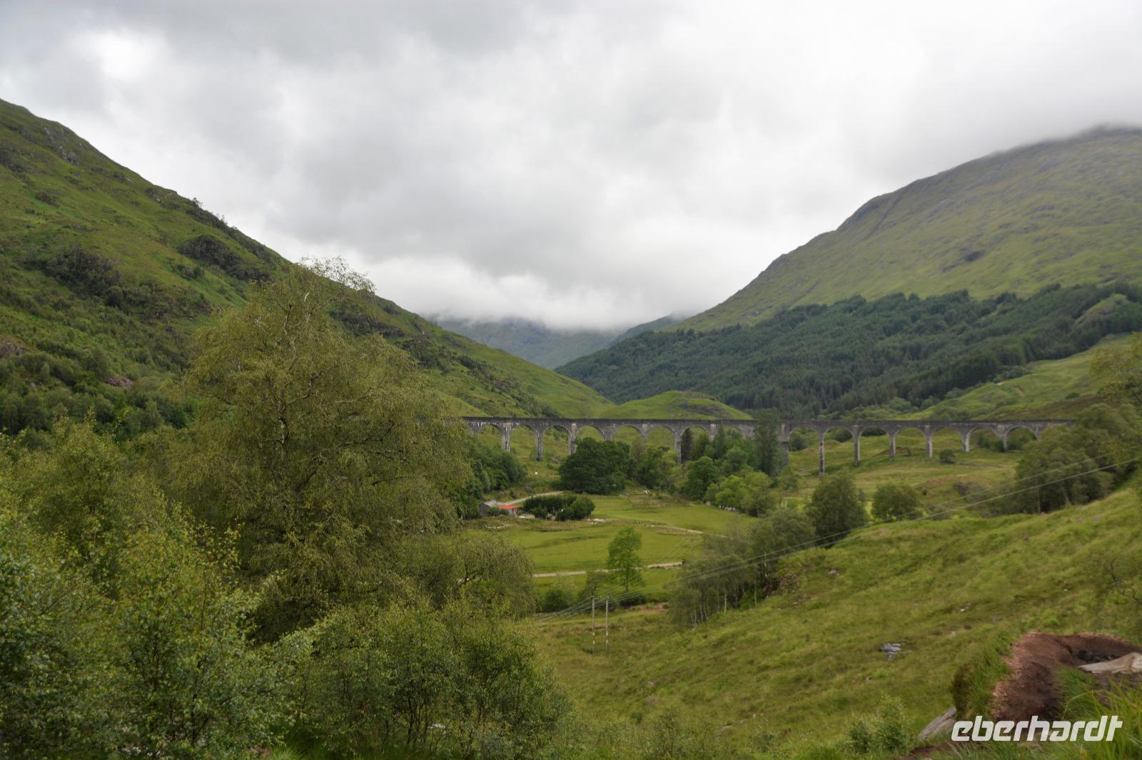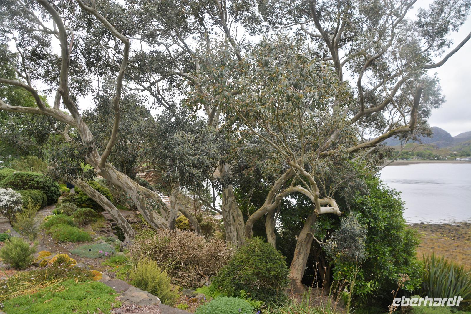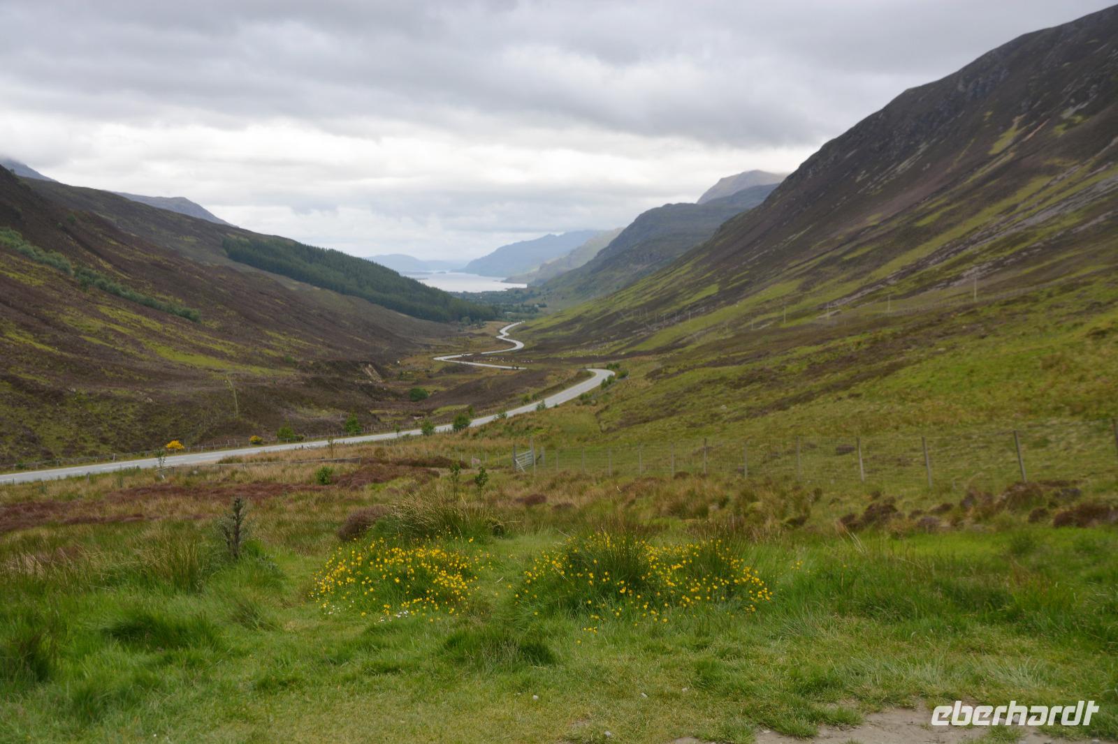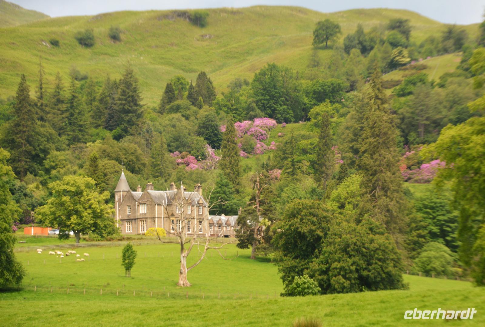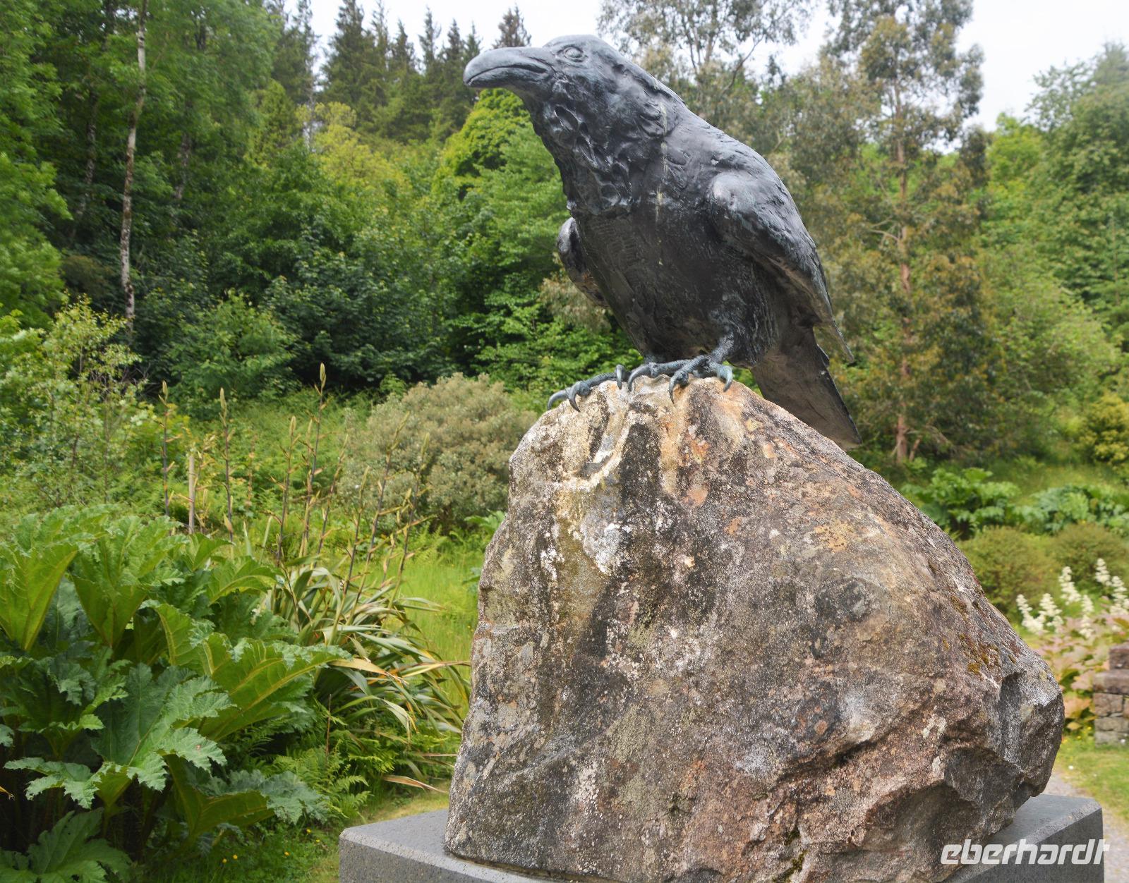 Heute geht es etwas früher los, da wir eine lange Strecke zurückzulegen haben und die Straßen sich ziemlich durch die Landschaft schlängeln. Wir fahren über die "Skye Bridge", die im Jahr 1995 eröffnet wurde und zu Beginn durch ihre hohen Mautgebühren zu vielen Kontroversen führte. Das war mit dem Kauf der Brücke durch die schott. Exekutive mit 27 Mio. Pfund erledigt. Heute fährt man ohne Zahlung hinüber auf das Festland. Die Brücke hat eine maximale Spannweite von 250 m und ist insgesamt 5oo m lang. So sind wir wieder auf dem Festland und werfen noch einmal einen Blick zurück zur einsamen Insel Skye. Gleich sind wir am Silean Donan Castle welches der Stammsitz des Clans der MacRae gehört. So stellt man sich eine schottische Burg vor. Trutzig beherrscht sie die Szenerie. Sie liegt wie es scheint auf einer Insel, gibt es doch eine kleine Brücke zu ihr. Bei Flut könnte man nicht trockenen Fusses zu ihr gelangen, bei Ebbe schon - könnten wir, wenn das Schloss schon geöffnet hätte. Aber wir sind zu früh und so fahren wir weiter. Wir fahren durch die heute sehr feuchte schottiscche Landschaft. Dunkle Wolken lassen nicht Gutes ahnen aber das Wetter ändert sich hier ständig. Wir fahren durch schöne Heidelandschaft zum Loch Maree und finden vor unserem nächsten Haltepunkt eine Möglichkeit zur Befriedigung einiger dringender Bedürfnisse. Gut dass wir gehalten haben, denn an der folgenden "Beinn Eight" Center sind die Toilettenanlagen kaputt.Wir machen hier eine längere Pause zum Spazieren und schauen: es gibt ein kleines Museum und wir können durch eine Kamera Vögel an Futterröhren beobachten. Ein schöner Weg führt zu durch einen dichten Wald zu einem Aussichtspunkt und es herrscht eine friedliche Atmosphäre. Bald geht es weiter in Richtung Gairloch. Die Fotostopps sind wegen dem regnerischen Wetter heute nicht so zahlreich, wir passieren Gairloch und fiebern unserem Highlight von heute entgegen, dem "Inverewe Garten" am Loch Ewe. Er soll einer der nörlichsten botanischen Gärten weltweit sein und er liegt im Golfstrom, der Meeresstrom aus dem Golf von Mexiko der das Klima Westeuropas und besonders einiger Gebiet im Nordwesten Europas maßgeblich beeinflusst. Es wird nicht zuviel versprochen. Der Inverewe Garten wurde von Osgood Mackenzie und seiner Tochter angelegt. Sie verwandelten wohl ein ziemlich ödes Gebiet in ein Paradies. Das Klima und auch architektonische Rafinesse sorgen für ein besonders Klima und die Bedingungen sorgen dafür dass sich Pflanzen aus Australien, Neuseeland und sogar Tasmanien hier wohl fühlen. Man wandelt unter Urwaldriesen. Das Haus der Mackenzies kann besichtigt werden und man hat das Gefühl, man würde von den Bewohnern gleich begrüßt. Liebevoll wurden Souvenirs aus der ganzen Welt zusammengetragen und man bekommt ein Gefühl für die Wohnkultur der wohlhabenden Schotten des 19. Jahrhunderts.Wir müssen leider weiter und machen noch eine kleine Wanderung in der "Corrieshalloch Gorge" zu einem Wasserfall. Eine wackelige Hängebrücke gehört auch dazu. Wir überstehen alles gut und so langsam freuen wir uns auf ein nettes Hotel. Es geht noch ein wenig durch schottische Landschaft und schließlich kommen wir in Beauly im "Lovat Arms Hotel" an. Ein niedliches Hotel mit unverwechselbarem britischen Charme. Schottenkaros, Viktorianisches und sogar einige Himmelbetten erwarten uns. Und da ist auch ein leibhaftiger Kamin. Das Essen schmeckt vorzüglich und so beenden wir einen fast perfekten Tag (warum fast? nun die Sonne hätte schon ein klein wenig mehr scheinen können!)