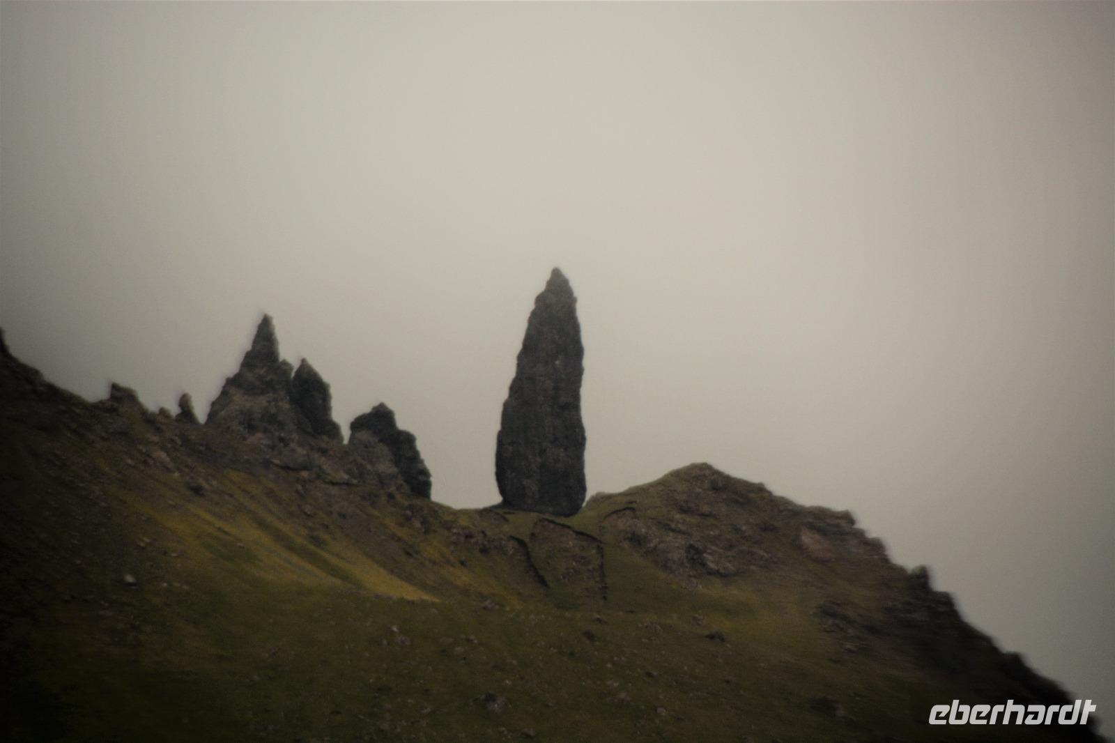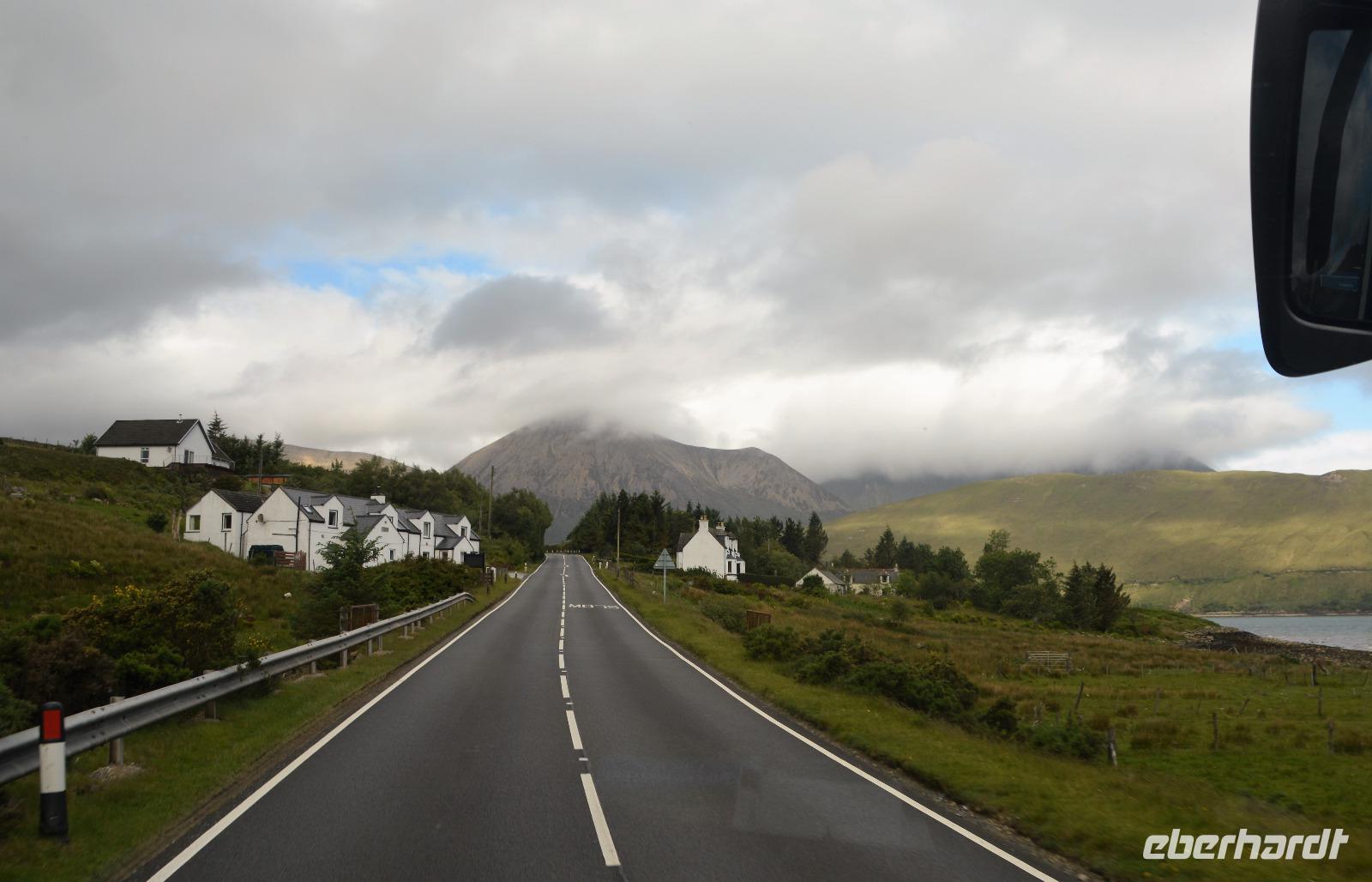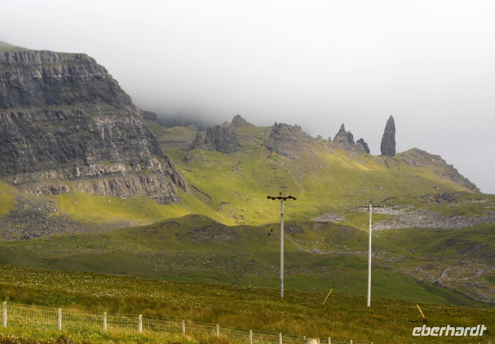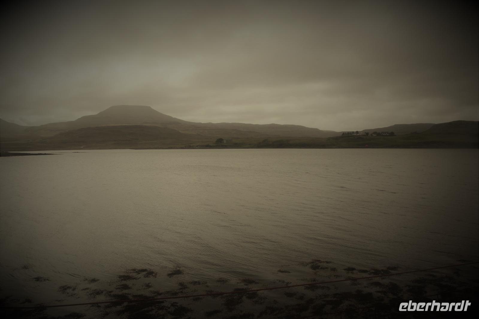 Wir bummeln heute ein wenig und lassen den Tag ruhig angehen. Damit hat unser Frühstücksservice nicht gerechnet. Aber wir bekommen alle unser Frühstück und das Programm kann beginnen. Wir haben heute eine Inselrundfahrt auf unserem Programm die uns in den äußersten Norden der Isle of Skye bringen wird. Wir fahren entlang der Ostküste in Richtung Norden. Die Stimmung ist gut und wird sich im Laufe des Tages noch steigern. Macht das vielleicht der wirklich kalte und unangenehme Nordwind. Wow um eine Frisur brauchen wir uns nicht mehr zu kümmern: einmal im Freien und die Sache ist erledigt. Als wollten uns die alten Bewohner von Skye zeigen was es heisst, hier zu überleben. Unser Bus erweist sich als sichere Insel vor den Nordwinden, aber auch er wird im Laufe des Tages zu schwanken beginnen. In Fahrtrichtung türmen sich dunkle Wolken auf, der Himmel ändert seinen Zustand in Minutenschnelle. Eine dramatische Landschaft liegt vor uns. Wie muss es gewesen sein, als hier im Tertiär die vorletzte Phase der Erdgeschichte einsetzte mit Vulkanausbrüchen und Verschiebungen der Erdkruste. Das Gestein der Isle of Sky ist vielfältig. Wir fahren an dem Gebirge der "Cullins" vorbei. Berge über 3000 ft (entspricht 914,4 m) werden in Schottland Munros benannt und alleine 12 der 13 Munros der Hebriden befinden sich auf Skye in den "Cullins". Sehen können wir davon heute nicht viel, sind doch die größeren Höhen in dichten Wolken. Bald sind wir im Hauptort Portree, dem "Hafen des Königs" angekommen. Wir laufen zu diesem Hafen mit seinen schönen bunten Häusern und können in der Hautpstraße des Ortes die Auslagen in den vielfältigen Geschäften sehen. Es werden hauptsächlich Produkte aus Naturmaterialien der Insel angeboten, wie Wolle und Schafsfelle. Auch hochwertige, warme Kleidung findet man in den Geschäften. Wir fahren weiter und sind gespannt auf eine der Hauptattraktionen von Skye: den 50 Meter hohen Basaltfelsen welcher in den Himmel ragt. Da es sehr windig ist können wir die geplante Wanderung leider nicht machen. Wir würden damit viel Zeit verlieren. Auch ist der Fels heute etwas in Nebel gehüllt. Wir begnügen uns deshalb mit einem Foto von der Straße aus. Schon bei diesem kurzen Ausstieg weht uns ein heftiger Wind um die Nase. Bei unserem nächsten Halt am "Kilt-Rock" werden wir aber mit großartigen Aussichten und Fotos entschädigt. Immer weiter geht es bis (fast) ans Ende der Welt, so fühlen wir uns jedenfalls hier am nördlichen Ende der Insel Skye. Wie muss es aber den armen Schotten des 17. und 18. Jahrhunderts ergangen sein, die weder Elektrizität, geschweige denn Zentralheizung hatten, von den Teerstraßen mal ganz abgesehen. Denen wurde dann auch noch ihr Land genommen in den Highland Clearances. So manche Gedanken kommen einem dazu. Worüber wir und manchmal beklagen! 1792 wurden viele der Pächter gewaltsam aus ihren Häusern vertrieben da das Land für die Schafszucht gebraucht wurde. Manche versuchten Ihr Glück in der Ferne..... und fanden es! In einem kleinen Museum, auch ganz im Norden, kann man den Lebensalltag dieser Menschen nachvollziehen. Hier ist auch das Grab der Flora MacDonald zu besuchen, die einst im Jahr 1745 dem letzten Stuart "Bonnie Prince Charlie" , zur Flucht verhalf da er vernichtend geschlagen wurde. Sie soll im Betttuch des hübschen Prinzen begraben sein. Wir brauchen jetzt langsam einen kleinen Imbiss und nutzen die Pause hier am Museum. Danach geht es weiter über schmale Straßen wieder in den Süden. Ziemlich schnell ändert sich die Landschaft. Sie ist immer noch grün aber ein wenig dichter besiedelt, was nicht heißen soll dass wir schon von dichter Besiedlung sprechen können. So mancher hat ein Boot in seinem Garten stehen. Auf unserer Rückreise kommen wir wieder an den "Collins" vorbei und machen noch einmal Halt an einer schönen Steinbrücke. Hier in den "Collins" gab es auch Schotten die in den Bergen ihr Glück suchten und es wohl fanden. Wenn sie heute vom sog. "Munro-Bagging" erfahren würden, würden sie sich wohl freuen? Es ist das Bestreben, alle Munros (also Berge Schottlands die höher als 3000 Fuss sind) zu besteigen. Nun wir haben keinen bestiegen und sind trotzdem zufrieden mit diesem Tag an dem wir einige Naturschönheiten Schottlands sehen durften. Wir krönen das ganze am Abend mit einer guten Mahlzeit in unserem Hotel und schauen dem morgigen Tag entgegen, der wieder einige "Highlights" bieten soll.