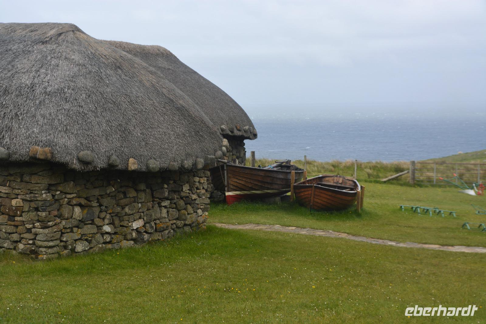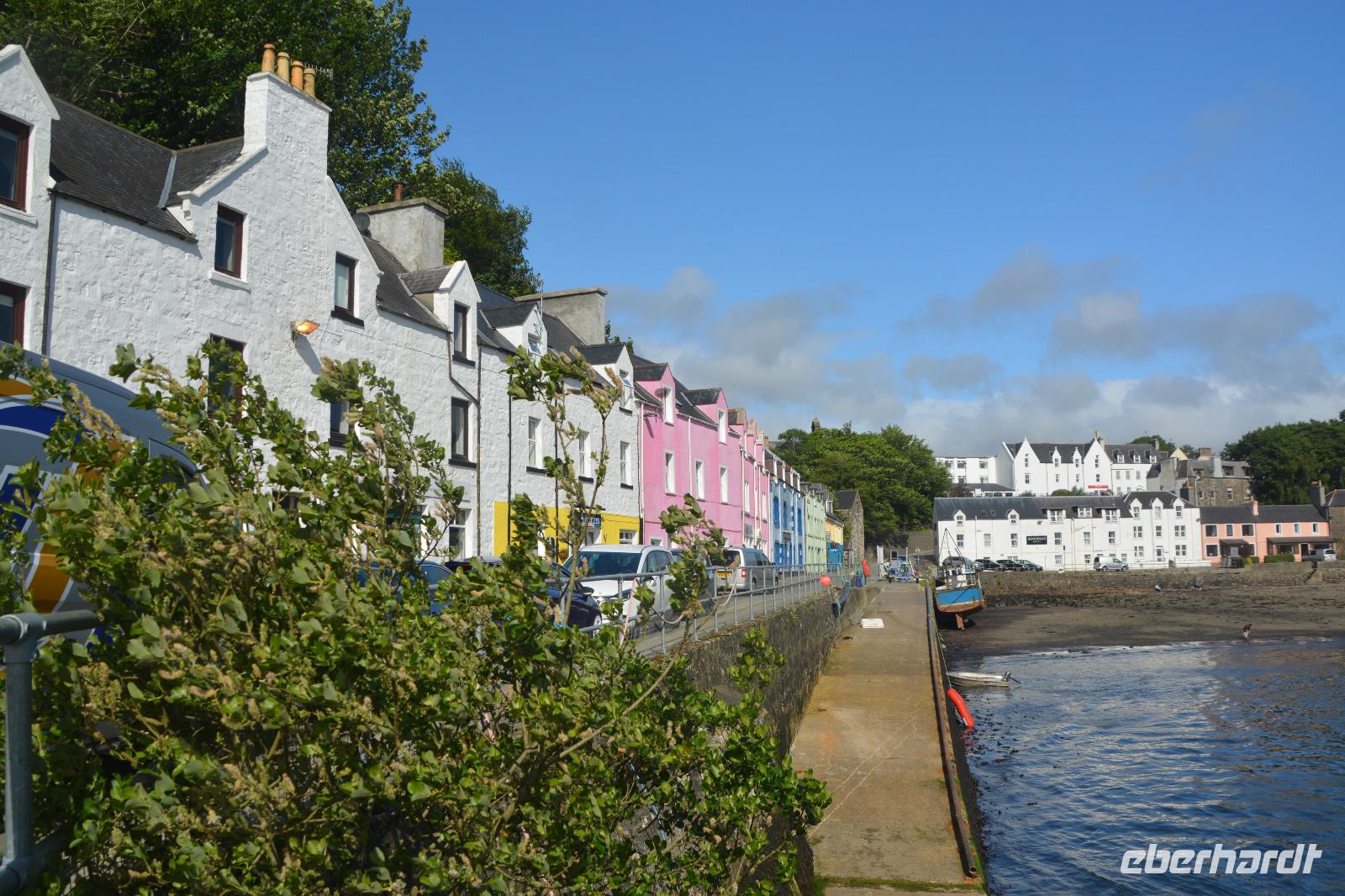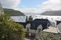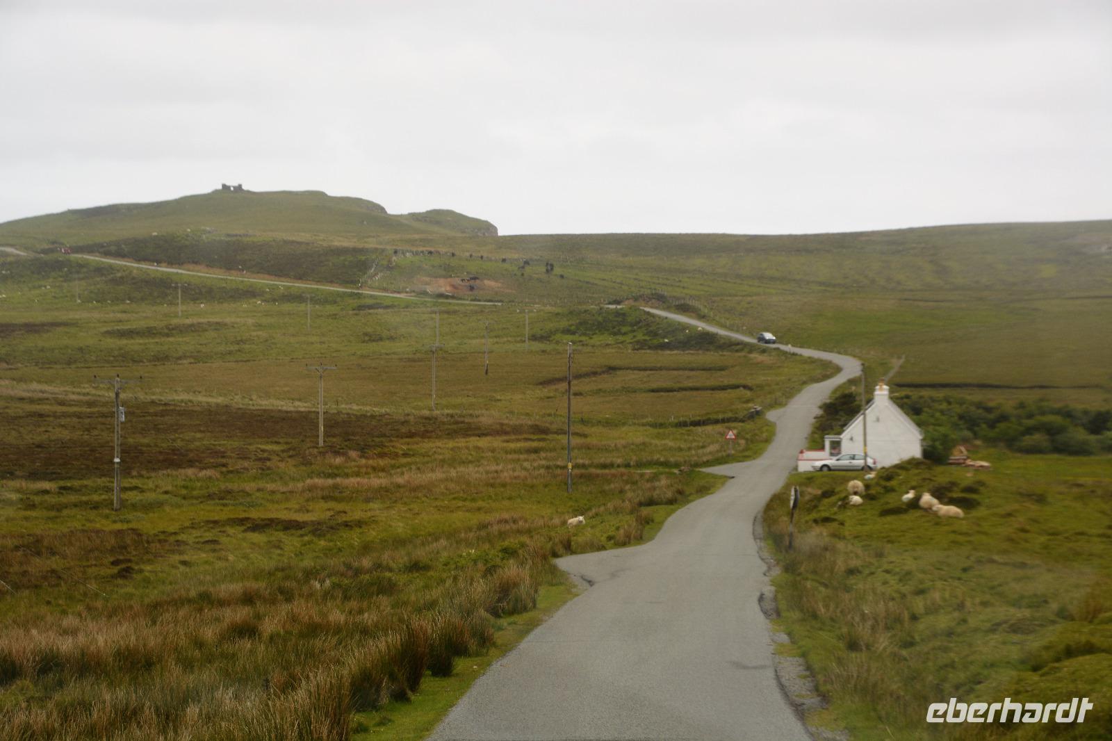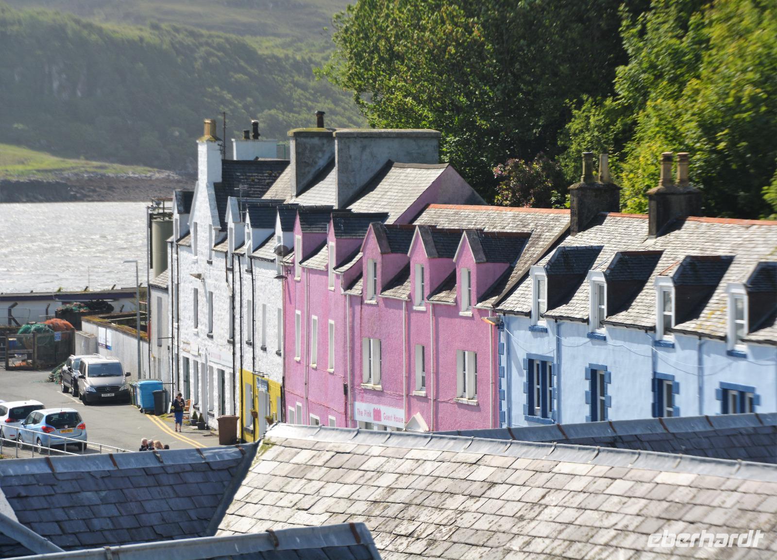 Wir bummeln heute ein wenig und lassen den Tag ruhig angehen. Damit hat unser Frühstücksservice nicht gerechnet. Aber wir bekommen alle unser Frühstück und das Programm kann beginnen. Wir haben heute eine Inselrundfahrt auf unserem Programm die uns in den äußersten Norden der Isle of Skye bringen wird. Wir fahren entlang der Ostküste in Richtung Norden. Die Stimmung ist gut und wird sich im Laufe des Tages noch steigern. Macht das vielleicht der wirklich kalte und unangenehme Nordwind. Wow um eine Frisur brauchen wir uns nicht mehr zu kümmern: einmal im Freien und die Sache ist erledigt. Als wollten uns die alten Bewohner von Skye zeigen was es heisst, hier zu überleben. Unser Bus erweist sich als sichere Insel vor den Nordwinden, aber auch er wird im Laufe des Tages zu schwanken beginnen. In Fahrtrichtung türmen sich dunkle Wolken auf, der Himmel ändert seinen Zustand in Minutenschnelle. Eine dramatische Landschaft liegt vor uns. Wie muss es gewesen sein, als hier im Tertiär die vorletzte Phase der Erdgeschichte einsetzte mit Vulkanausbrüchen und Verschiebungen der Erdkruste. Das Gestein der Isle of Sky ist vielfältig. Wir fahren an dem Gebirge der "Cullins" vorbei. Berge über 3000 ft (entspricht 914,4 m) werden in Schottland Munros benannt und alleine 12 der 13 Munros der Hebriden befinden sich auf Skye in den "Cullins". Sehen können wir davon heute nicht viel, sind doch die größeren Höhen in dichten Wolken. Bald sind wir im Hauptort Portree, dem "Hafen des Königs" angekommen. Wir laufen zu diesem Hafen mit seinen schönen bunten Häusern und können in der Hautpstraße des Ortes die Auslagen in den vielfältigen Geschäften sehen. Es werden hauptsächlich Produkte aus Naturmaterialien der Insel angeboten, wie Wolle und Schafsfelle. Auch hochwertige, warme Kleidung findet man in den Geschäften. Wir fahren weiter und sind gespannt auf eine der Hauptattraktionen von Skye: den 50 Meter hohen Basaltfelsen welcher in den Himmel ragt. Da es sehr windig ist können wir die geplante Wanderung leider nicht machen. Wir würden damit viel Zeit verlieren. Auch ist der Fels heute etwas in Nebel gehüllt. Wir begnügen uns deshalb mit einem Foto von der Straße aus. Schon bei diesem kurzen Ausstieg weht uns ein heftiger Wind um die Nase. Bei unserem nächsten Halt am "Kilt-Rock" werden wir aber mit großartigen Aussichten und Fotos entschädigt. Immer weiter geht es bis (fast) ans Ende der Welt, so fühlen wir uns jedenfalls hier am nördlichen Ende der Insel Skye. Wie muss es aber den armen Schotten des 17. und 18. Jahrhunderts ergangen sein, die weder Elektrizität, geschweige denn Zentralheizung hatten, von den Teerstraßen mal ganz abgesehen. Denen wurde dann auch noch ihr Land genommen in den Highland Clearances. So manche Gedanken kommen einem dazu. Worüber wir und manchmal beklagen! 1792 wurden viele der Pächter gewaltsam aus ihren Häusern vertrieben da das Land für die Schafszucht gebraucht wurde. Manche versuchten Ihr Glück in der Ferne..... und fanden es! In einem kleinen Museum, auch ganz im Norden, kann man den Lebensalltag dieser Menschen nachvollziehen. Hier ist auch das Grab der Flora MacDonald zu besuchen, die einst im Jahr 1745 dem letzten Stuart "Bonnie Prince Charlie" , zur Flucht verhalf da er vernichtend geschlagen wurde. Sie soll im Betttuch des hübschen Prinzen begraben sein. Wir brauchen jetzt langsam einen kleinen Imbiss und nutzen die Pause hier am Museum. Danach geht es weiter über schmale Straßen wieder in den Süden. Ziemlich schnell ändert sich die Landschaft. Sie ist immer noch grün aber ein wenig dichter besiedelt, was nicht heißen soll dass wir schon von dichter Besiedlung sprechen können. So mancher hat ein Boot in seinem Garten stehen. Auf unserer Rückreise kommen wir wieder an den "Collins" vorbei und machen noch einmal Halt an einer schönen Steinbrücke. Hier in den "Collins" gab es auch Schotten die in den Bergen ihr Glück suchten und es wohl fanden. Wenn sie heute vom sog. "Munro-Bagging" erfahren würden, würden sie sich wohl freuen? Es ist das Bestreben, alle Munros (also Berge Schottlands die höher als 3000 Fuss sind) zu besteigen. Nun wir haben keinen bestiegen und sind trotzdem zufrieden mit diesem Tag an dem wir einige Naturschönheiten Schottlands sehen durften. Wir krönen das ganze am Abend mit einer guten Mahlzeit in unserem Hotel und schauen dem morgigen Tag entgegen, der wieder einige "Highlights" bieten soll.