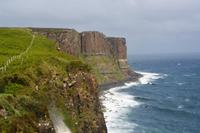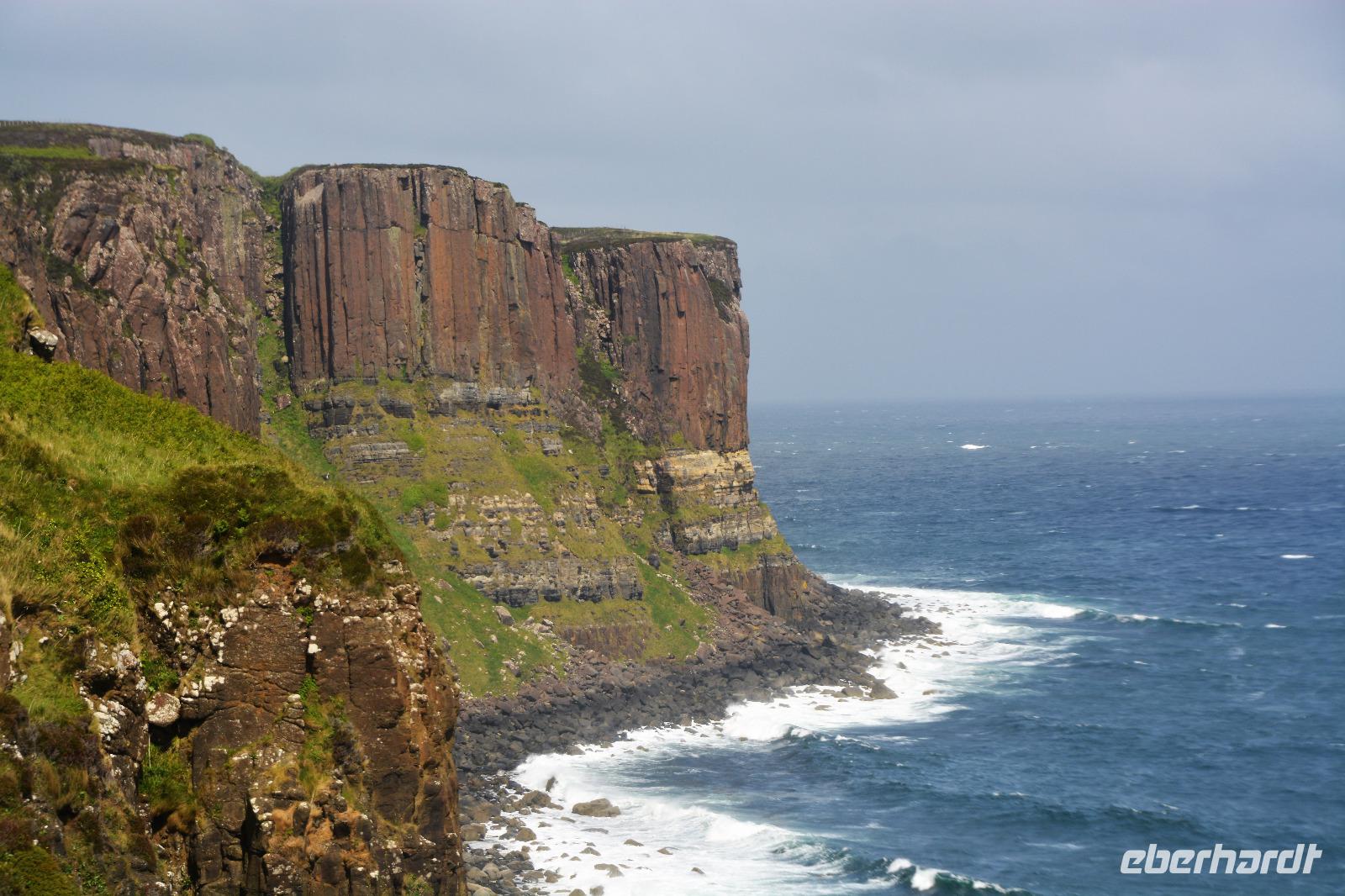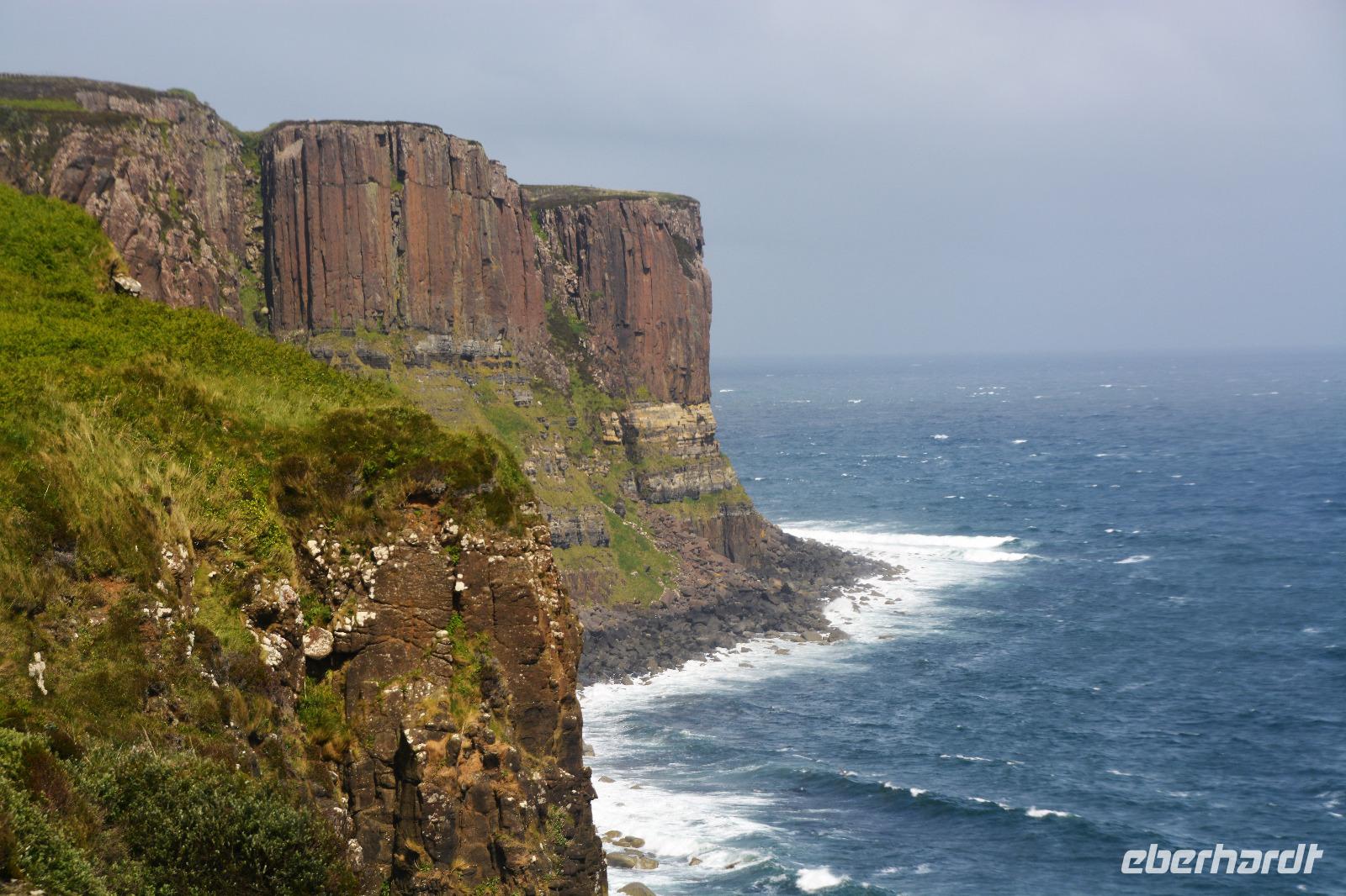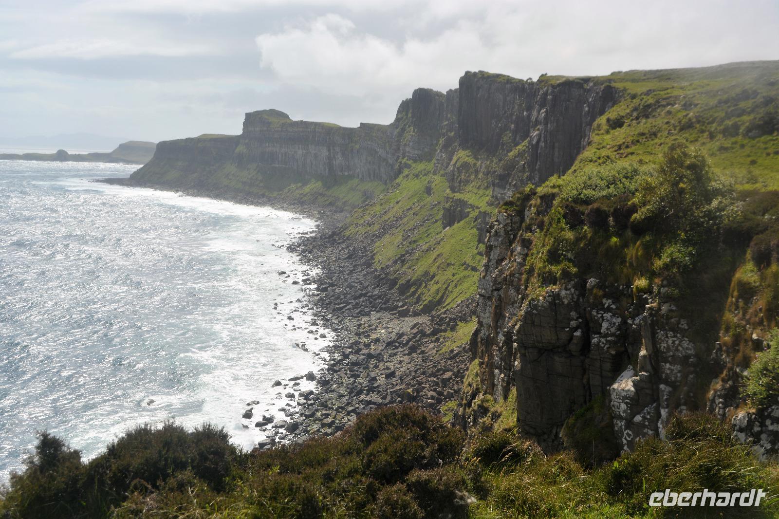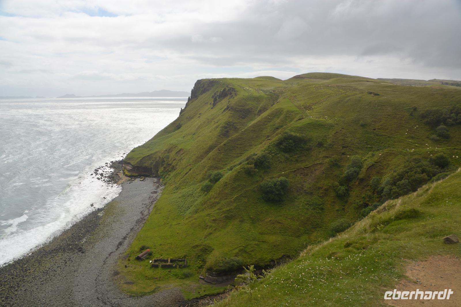 Wir bummeln heute ein wenig und lassen den Tag ruhig angehen. Damit hat unser Frühstücksservice nicht gerechnet. Aber wir bekommen alle unser Frühstück und das Programm kann beginnen. Wir haben heute eine Inselrundfahrt auf unserem Programm die uns in den äußersten Norden der Isle of Skye bringen wird. Wir fahren entlang der Ostküste in Richtung Norden. Die Stimmung ist gut und wird sich im Laufe des Tages noch steigern. Macht das vielleicht der wirklich kalte und unangenehme Nordwind. Wow um eine Frisur brauchen wir uns nicht mehr zu kümmern: einmal im Freien und die Sache ist erledigt. Als wollten uns die alten Bewohner von Skye zeigen was es heisst, hier zu überleben. Unser Bus erweist sich als sichere Insel vor den Nordwinden, aber auch er wird im Laufe des Tages zu schwanken beginnen. In Fahrtrichtung türmen sich dunkle Wolken auf, der Himmel ändert seinen Zustand in Minutenschnelle. Eine dramatische Landschaft liegt vor uns. Wie muss es gewesen sein, als hier im Tertiär die vorletzte Phase der Erdgeschichte einsetzte mit Vulkanausbrüchen und Verschiebungen der Erdkruste. Das Gestein der Isle of Sky ist vielfältig. Wir fahren an dem Gebirge der "Cullins" vorbei. Berge über 3000 ft (entspricht 914,4 m) werden in Schottland Munros benannt und alleine 12 der 13 Munros der Hebriden befinden sich auf Skye in den "Cullins". Sehen können wir davon heute nicht viel, sind doch die größeren Höhen in dichten Wolken. Bald sind wir im Hauptort Portree, dem "Hafen des Königs" angekommen. Wir laufen zu diesem Hafen mit seinen schönen bunten Häusern und können in der Hautpstraße des Ortes die Auslagen in den vielfältigen Geschäften sehen. Es werden hauptsächlich Produkte aus Naturmaterialien der Insel angeboten, wie Wolle und Schafsfelle. Auch hochwertige, warme Kleidung findet man in den Geschäften. Wir fahren weiter und sind gespannt auf eine der Hauptattraktionen von Skye: den 50 Meter hohen Basaltfelsen welcher in den Himmel ragt. Da es sehr windig ist können wir die geplante Wanderung leider nicht machen. Wir würden damit viel Zeit verlieren. Auch ist der Fels heute etwas in Nebel gehüllt. Wir begnügen uns deshalb mit einem Foto von der Straße aus. Schon bei diesem kurzen Ausstieg weht uns ein heftiger Wind um die Nase. Bei unserem nächsten Halt am "Kilt-Rock" werden wir aber mit großartigen Aussichten und Fotos entschädigt. Immer weiter geht es bis (fast) ans Ende der Welt, so fühlen wir uns jedenfalls hier am nördlichen Ende der Insel Skye. Wie muss es aber den armen Schotten des 17. und 18. Jahrhunderts ergangen sein, die weder Elektrizität, geschweige denn Zentralheizung hatten, von den Teerstraßen mal ganz abgesehen. Denen wurde dann auch noch ihr Land genommen in den Highland Clearances. So manche Gedanken kommen einem dazu. Worüber wir und manchmal beklagen! 1792 wurden viele der Pächter gewaltsam aus ihren Häusern vertrieben da das Land für die Schafszucht gebraucht wurde. Manche versuchten Ihr Glück in der Ferne..... und fanden es! In einem kleinen Museum, auch ganz im Norden, kann man den Lebensalltag dieser Menschen nachvollziehen. Hier ist auch das Grab der Flora MacDonald zu besuchen, die einst im Jahr 1745 dem letzten Stuart "Bonnie Prince Charlie" , zur Flucht verhalf da er vernichtend geschlagen wurde. Sie soll im Betttuch des hübschen Prinzen begraben sein. Wir brauchen jetzt langsam einen kleinen Imbiss und nutzen die Pause hier am Museum. Danach geht es weiter über schmale Straßen wieder in den Süden. Ziemlich schnell ändert sich die Landschaft. Sie ist immer noch grün aber ein wenig dichter besiedelt, was nicht heißen soll dass wir schon von dichter Besiedlung sprechen können. So mancher hat ein Boot in seinem Garten stehen. Auf unserer Rückreise kommen wir wieder an den "Collins" vorbei und machen noch einmal Halt an einer schönen Steinbrücke. Hier in den "Collins" gab es auch Schotten die in den Bergen ihr Glück suchten und es wohl fanden. Wenn sie heute vom sog. "Munro-Bagging" erfahren würden, würden sie sich wohl freuen? Es ist das Bestreben, alle Munros (also Berge Schottlands die höher als 3000 Fuss sind) zu besteigen. Nun wir haben keinen bestiegen und sind trotzdem zufrieden mit diesem Tag an dem wir einige Naturschönheiten Schottlands sehen durften. Wir krönen das ganze am Abend mit einer guten Mahlzeit in unserem Hotel und schauen dem morgigen Tag entgegen, der wieder einige "Highlights" bieten soll.