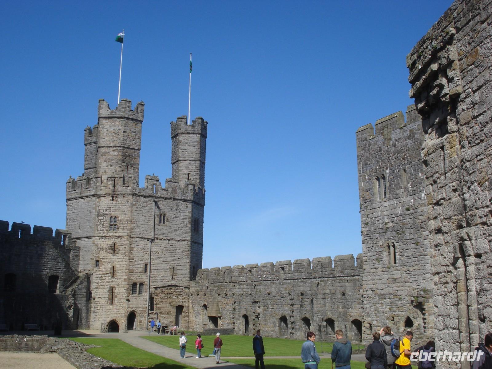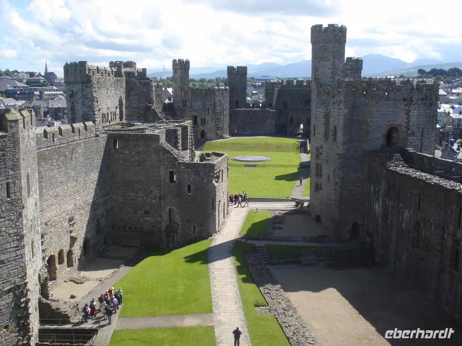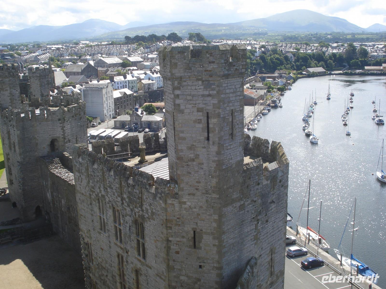 Unser nächstes Ziel war Caernarfon. Die von Türmen bekrönte Burg liegt strategisch günstig an der Menai Strait, der Meerenge zur Insel Anglesey. Bereits die Römer errichteten hier ein Lager, die Normannen erbauen ein hölzernes Fort und unter Eduard I. entstand der heute noch bestehende Bau. Hier wurde 1284 der erste Prinz von Wales, Edwarde of Caernarfon, der spätere Eduard II. geboren. Seit 1301 wird dem ältesten Sohn des britischen Monarchen der Titel Prinz of Wales verliehen. Über die Investitur von Prinz Charles zum Prince of Wales 1969 informierte uns eine Ausstellung im Adlerturm. Von diesem genossen wir auch eine phantastische Aussicht auf die gesamte Burganlage, Stadtmauer sowie die Küste. Im Anschluss fuhren wir nach Porthmadog. Mit der Ffestiniog Railway, einer 1836 in Betrieb genommenen Eisenbahn, mit der einst der Schiefer vom Steinbruck zur Küste transportiert wurde, fuhren wir nach Blaenau Ffestiniog. Wir genossen einen schönen Blick auf den Mount Snowdon, zahlreiche Seen und herrliche Wälder. In Betws-y-Coed besuchten wir die Miniausgabe der Golden-Gate-Bridge. Unseren letzten Stopp legten wir im Conwy ein. Hier wurde Stefanie´s fahrerisches Können wieder auf die Probe gestellt.