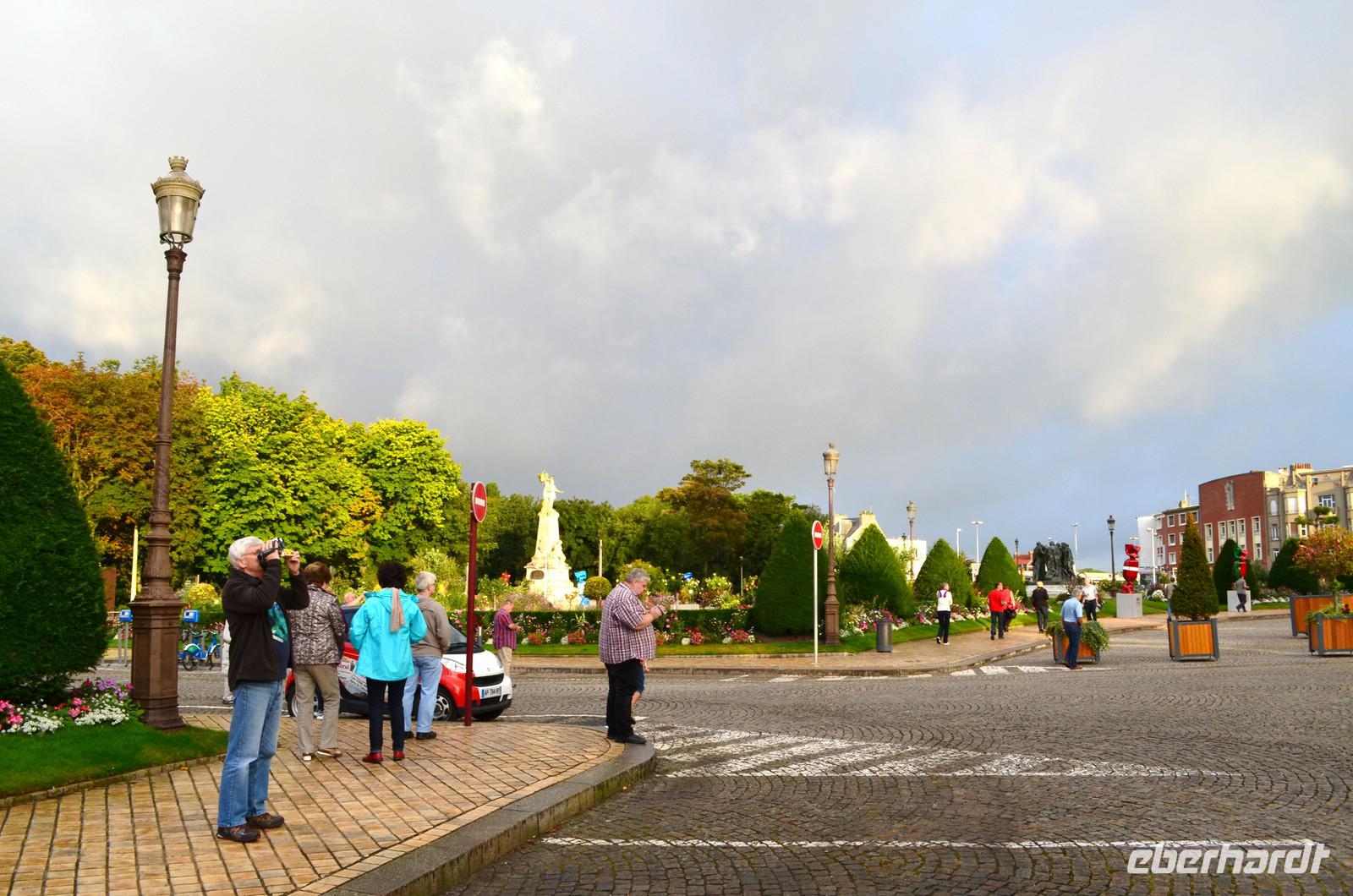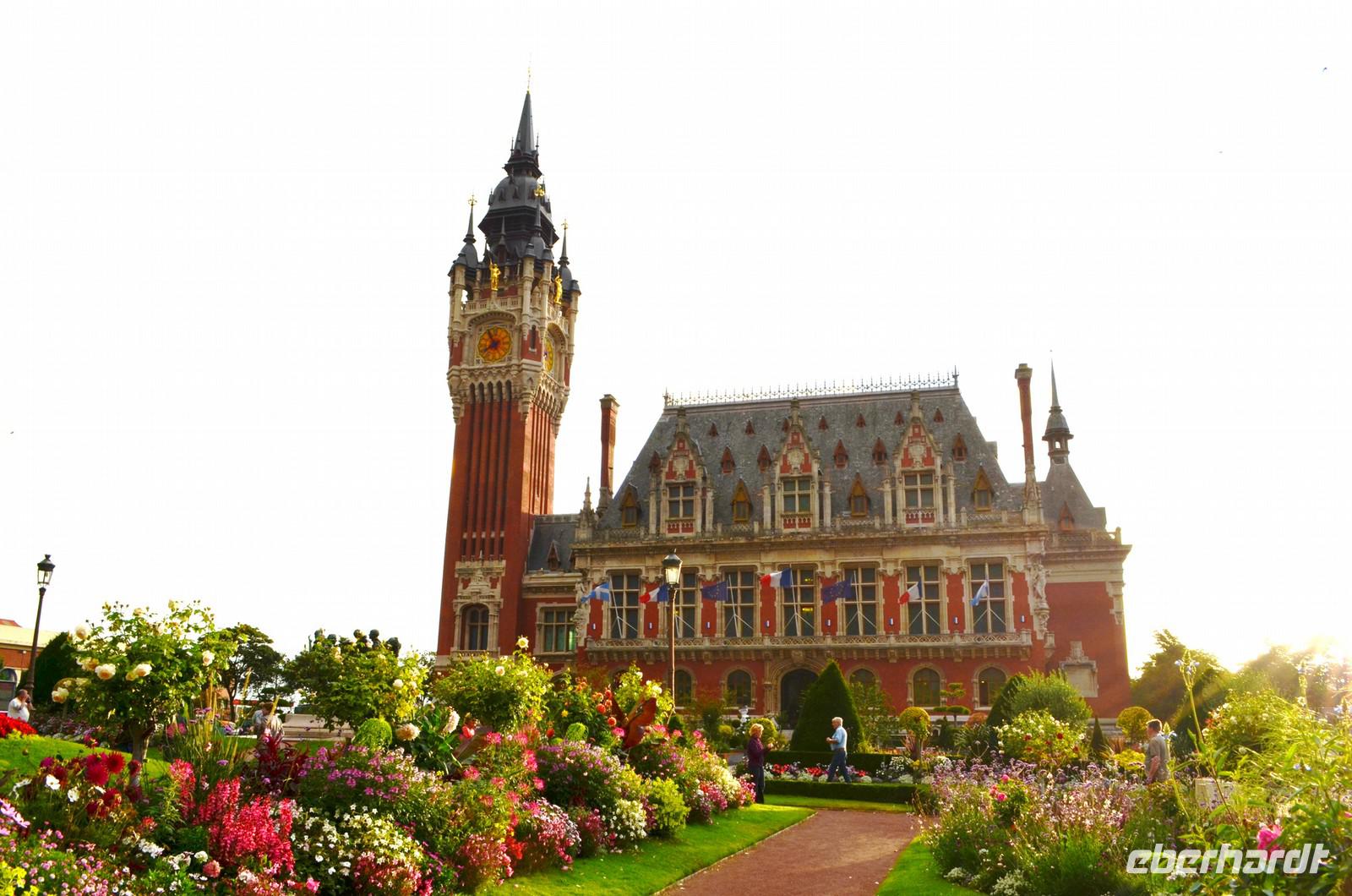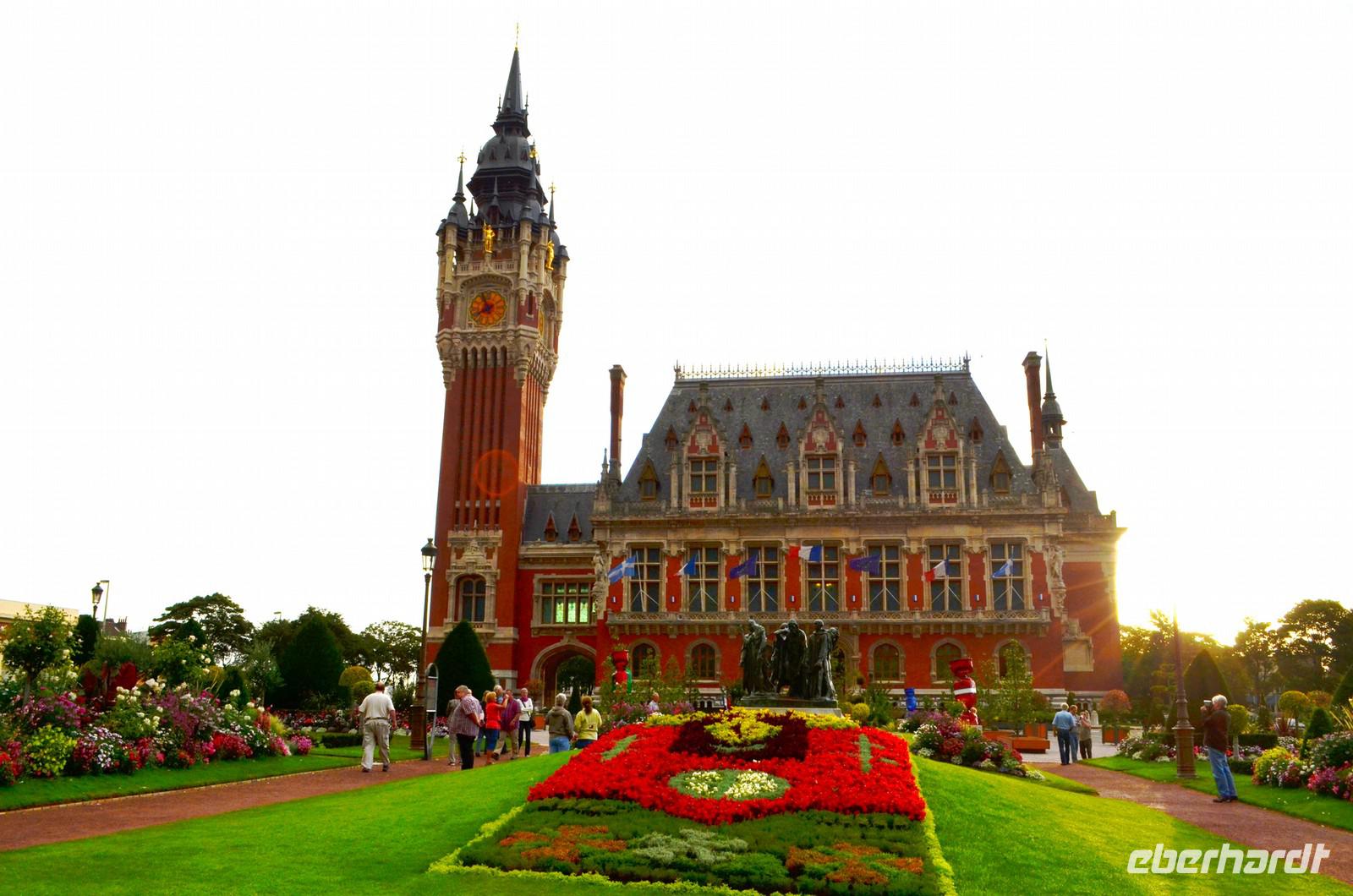 Nach sehr gutem Frühstück starteten wir bei schönem Wetter zu einer kurzen Besichtigung von Calais. In Richtung Fährhafen fuhren wir aber zuerst direkt in die Innenstadt, vorbei am Theater und die Hauptstraße hinauf zum Rathaus. Hier musste ein längerer Fotostopp sein, denn der flämische Neorenaissancebau ist sehr sehenswert und die herrlich bepflanzten Anlagen rings um Rodin´s Denkmal der 6 Bürger von Calais sind eine Augenweide.