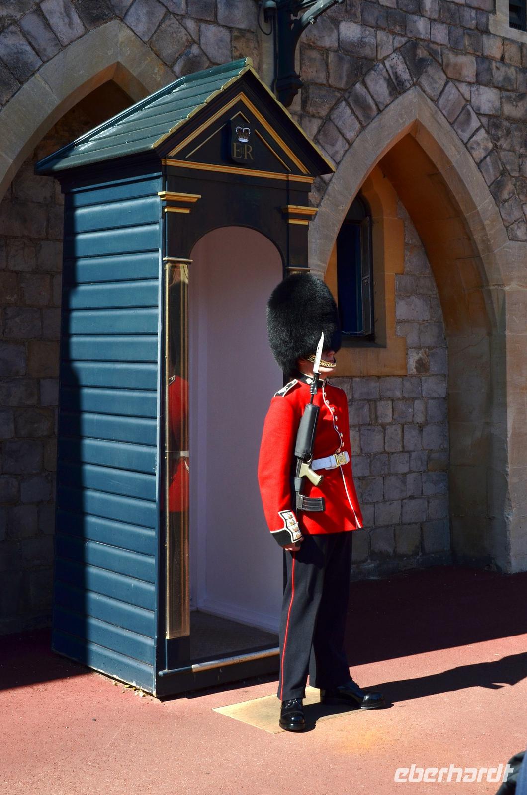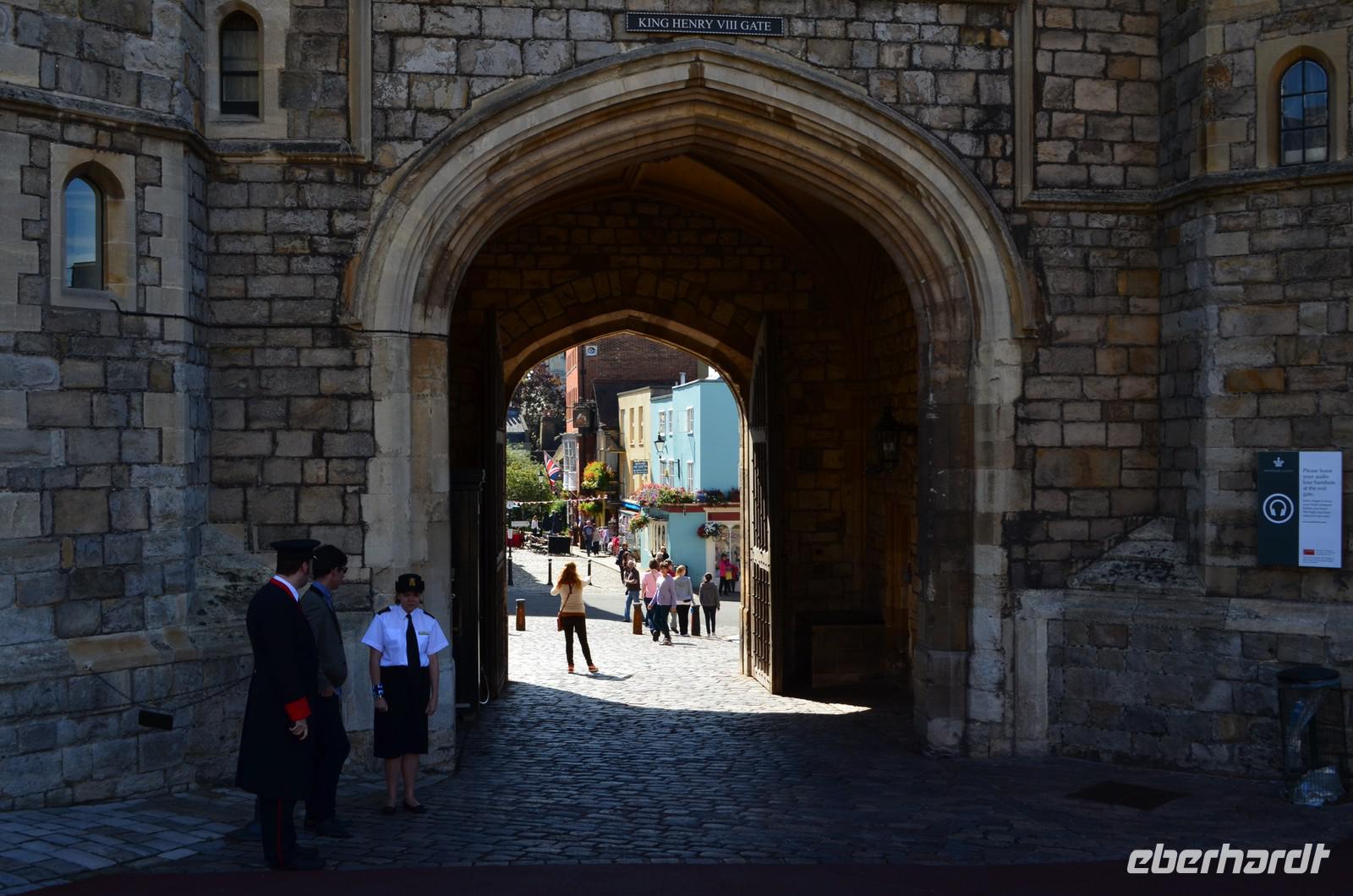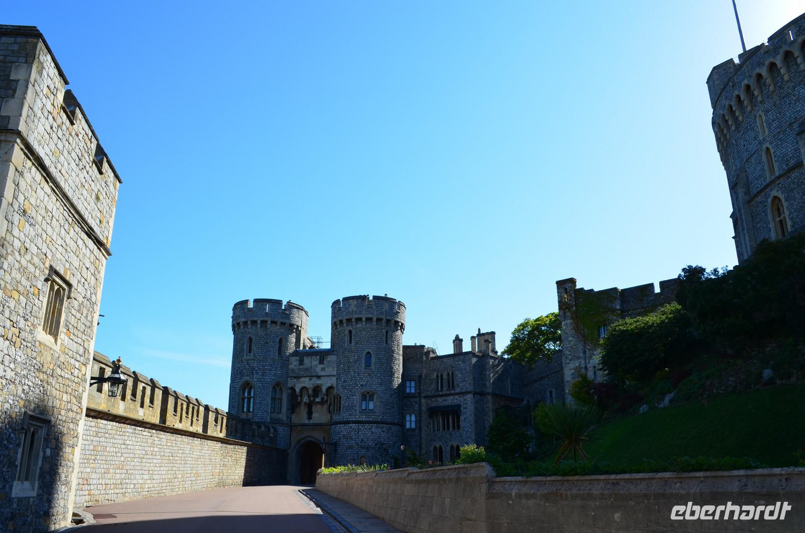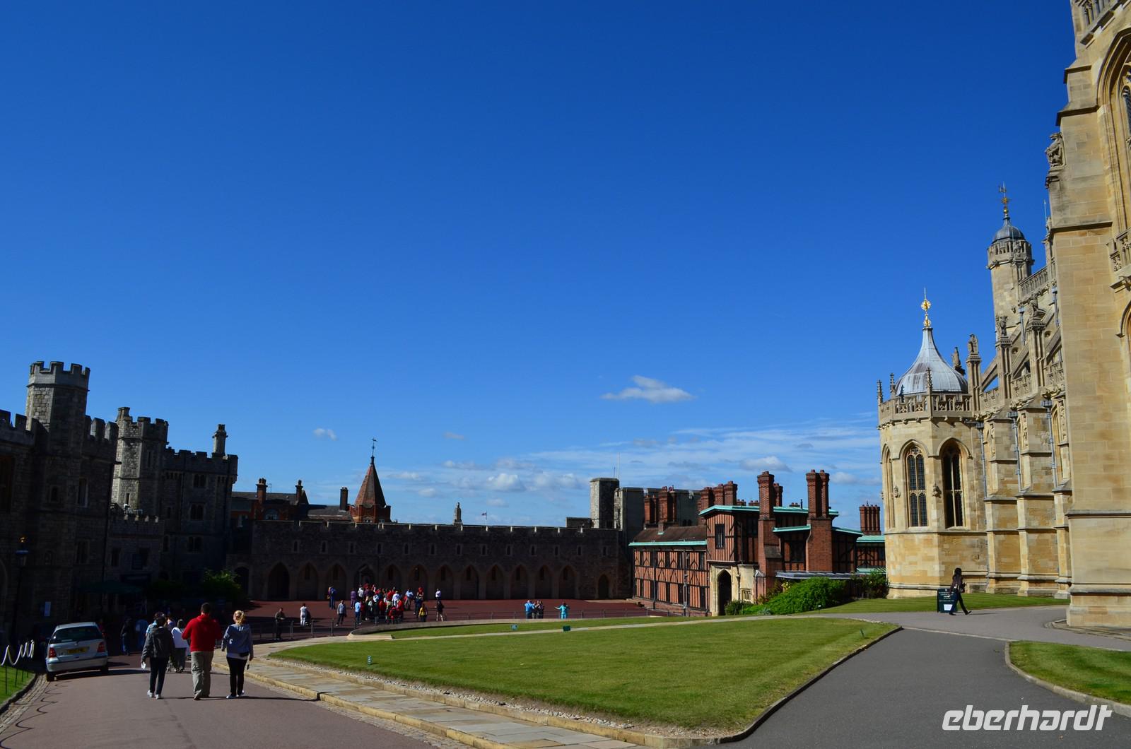 Durch den Bahnhof und vorbei an der Lokomotive, die den Reisezug von Queen Victoria gezogen hatte, ging es durch die Fußgängerzone Richtung Castle, jetzt aber erst durch die Gassen der Stadt und den Sehenswürdigkeiten, schließlich zum Besucherzentrum. Wir statteten uns mit Orientierungsplänen und deutsch-sprachige Audioguides aus und traten durch das Tor in die weitläufige Schlossanlage von Windsor Castle.