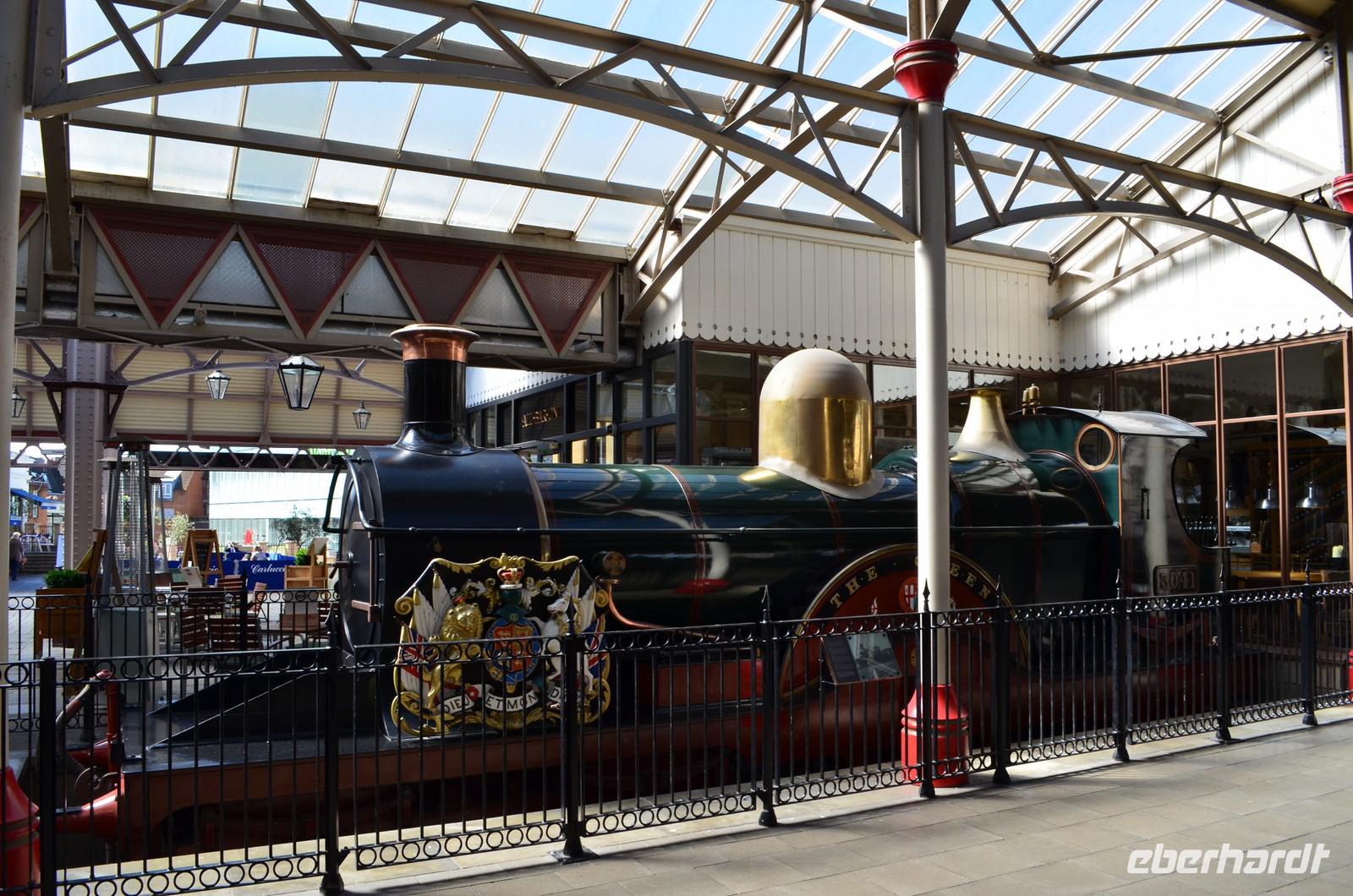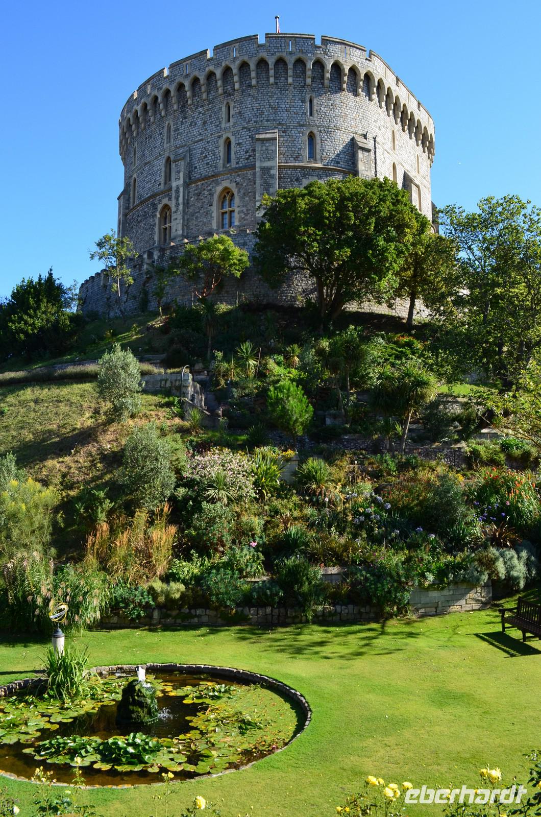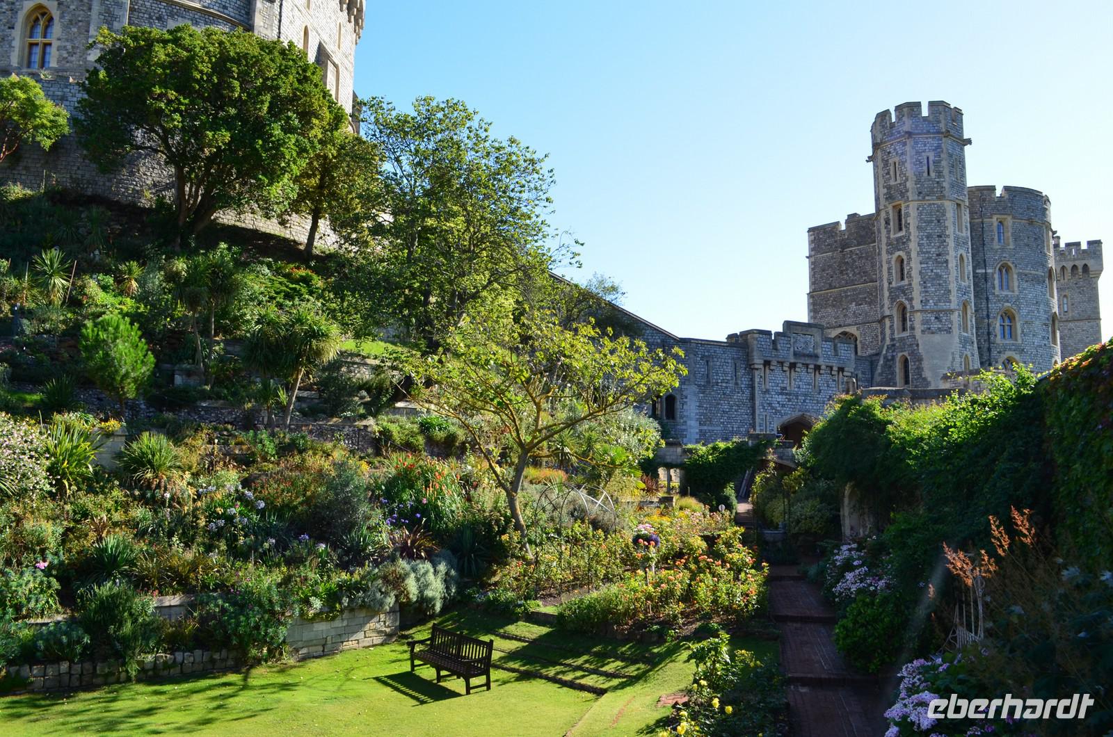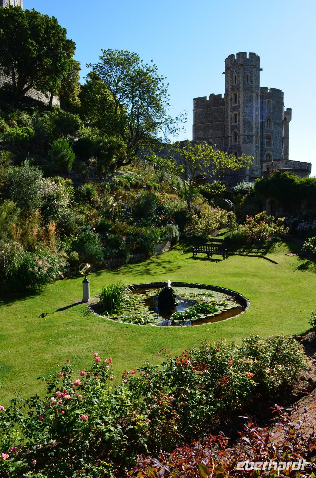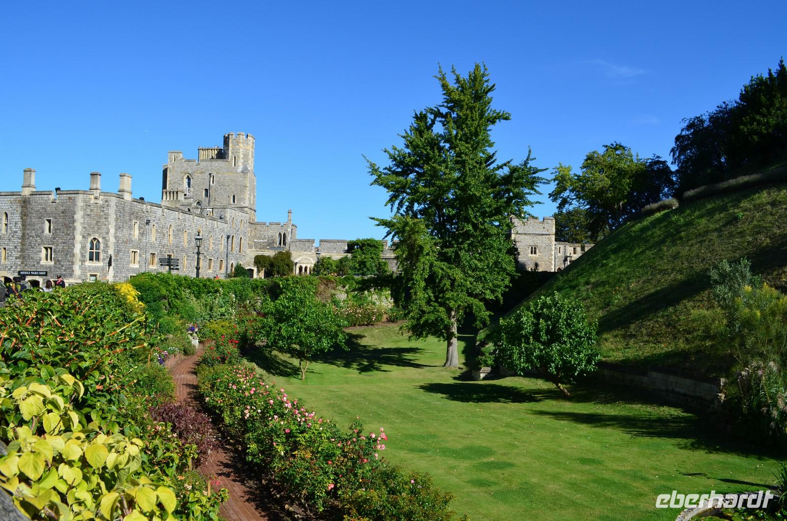 Durch den Bahnhof und vorbei an der Lokomotive, die den Reisezug von Queen Victoria gezogen hatte, ging es durch die Fußgängerzone Richtung Castle, jetzt aber erst durch die Gassen der Stadt und den Sehenswürdigkeiten, schließlich zum Besucherzentrum. Wir statteten uns mit Orientierungsplänen und deutsch-sprachige Audioguides aus und traten durch das Tor in die weitläufige Schlossanlage von Windsor Castle.