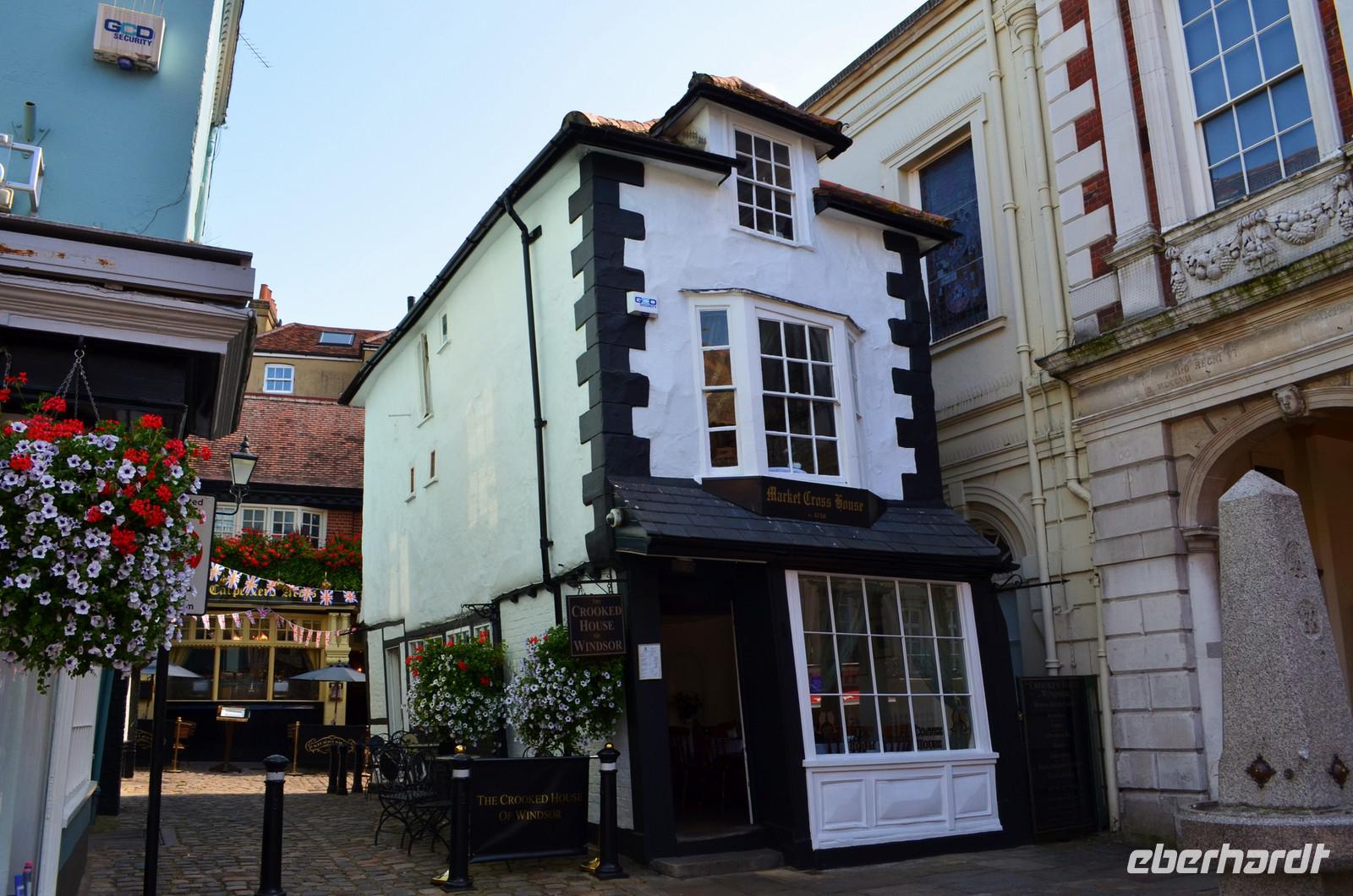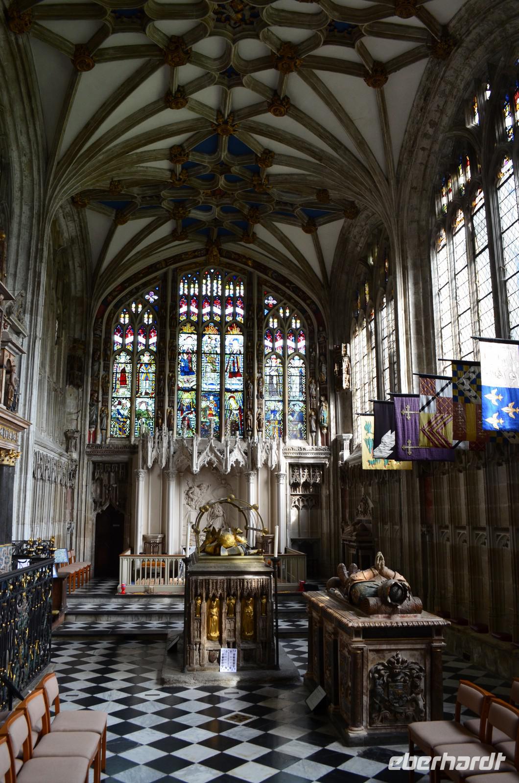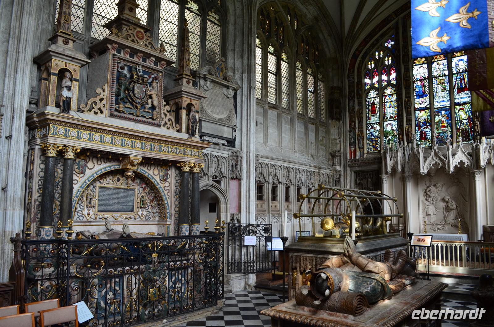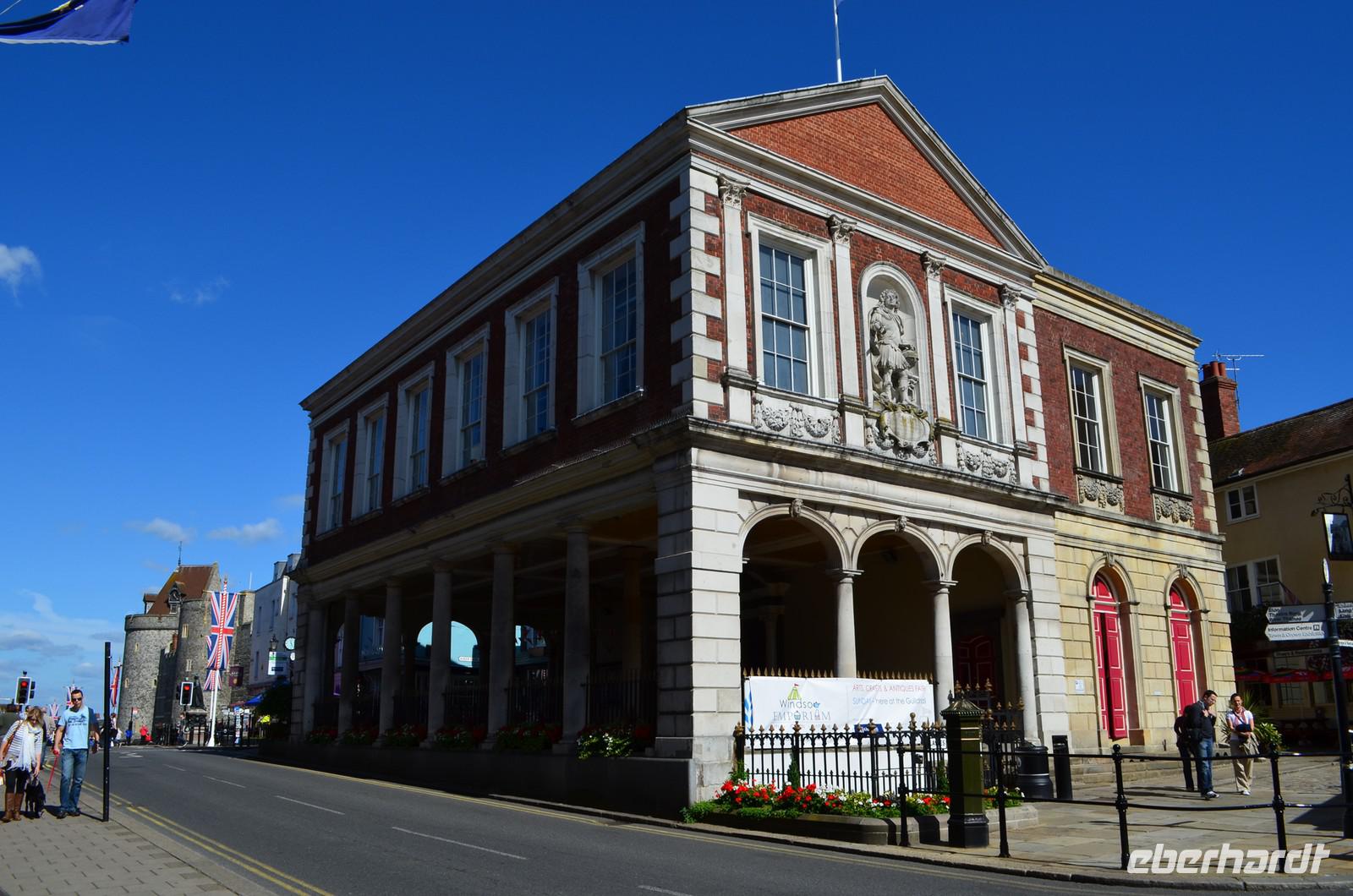 Durch den Bahnhof und vorbei an der Lokomotive, die den Reisezug von Queen Victoria gezogen hatte, ging es durch die Fußgängerzone Richtung Castle, jetzt aber erst durch die Gassen der Stadt und den Sehenswürdigkeiten, schließlich zum Besucherzentrum. Wir statteten uns mit Orientierungsplänen und deutsch-sprachige Audioguides aus und traten durch das Tor in die weitläufige Schlossanlage von Windsor Castle.