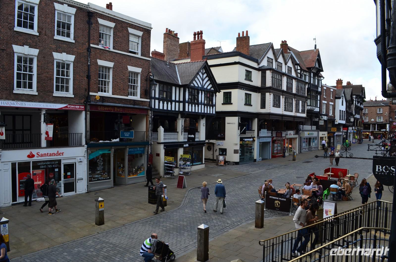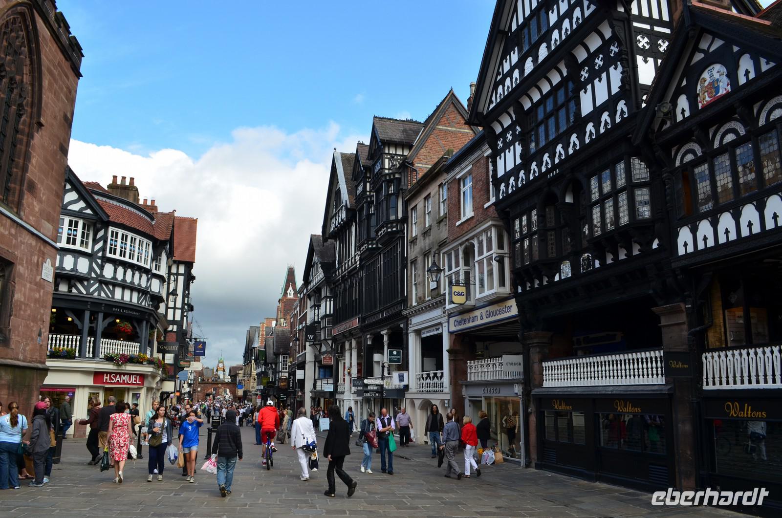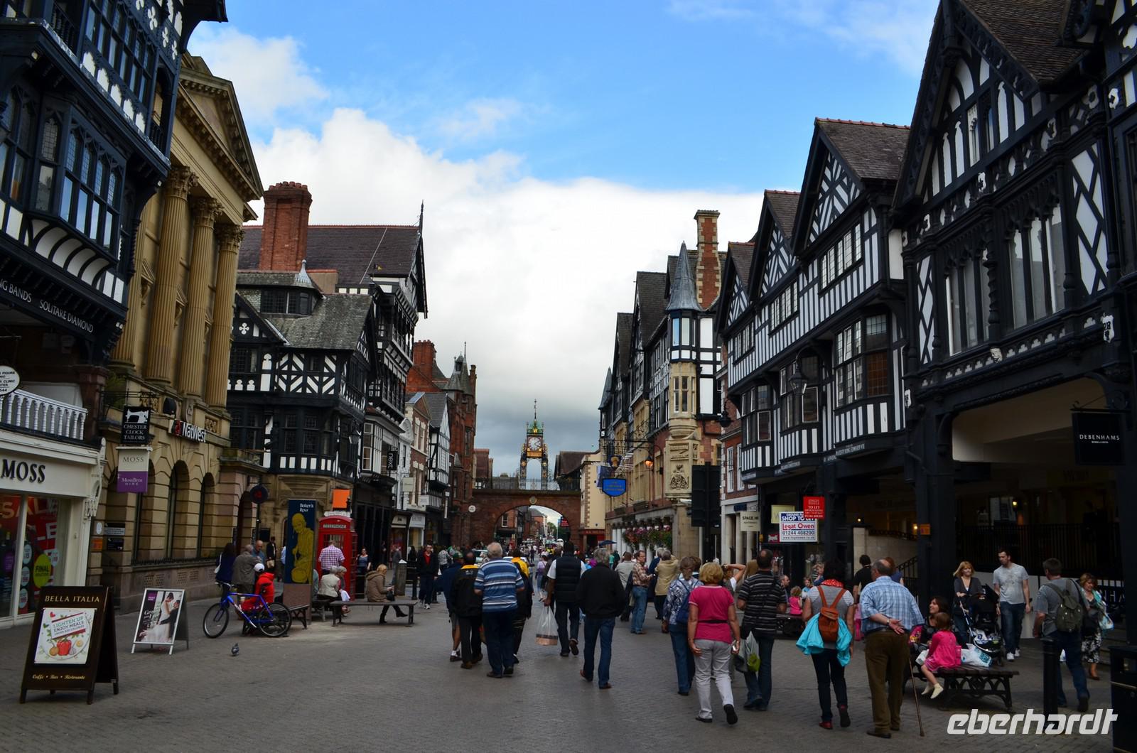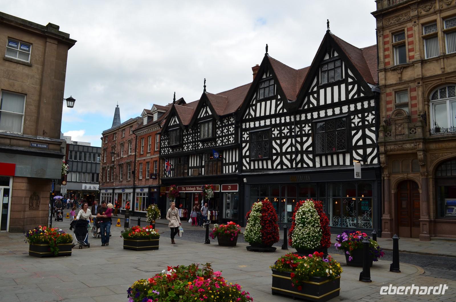Über die Landstraße geht es weiter durch das Tal des Servern nach Shrewsbury, dieser wunderschönen historischen Stadt in der Schleife des Severn. Über 600 Gebäude stehen hier unter Denkmalschutz. Von der Gästeinformation im „Alten Haus" gehen wir gemeinsam durch die malerischen Gassen der Stadt, über den Marktplatz, zum Castle und durch die Fußgängerzone. Herrlicher Blumen-schmuck in den Straßen und im Schlossgarten lässt die Geburtsstadt und den Wirkungsort von Charles Darwin erstrahlen und macht der Stadt als mehrfache englische Blumenstadt alle Ehre. Am Nachmittag das nächste schöne Ziel - die Stadt Chester. Peter, unser Gästeführer empfängt uns hier herzlich und bei seinen Erzählungen und Erläuterungen befinden wir uns umgehend im Stadtrundgang. Wunderschönes Wetter und strahlender Sonnenschein taucht die Stadt während unseres Spazierganges in besonders schönes Licht. Castle, Stadtmauer, römische Ausgrabungen, die Kathedrale und das Rathaus sind nur einige der sehenswerten Stationen. Chester ist für seine „Rows", die aus dem Mittelalter stammenden Fachwerkkolonnaden, die in Stockwerkhöhe liegen, bekannt. Wir nutzen die Freizeit und genießen den Ausblick darauf aus einem der zahlreichen Cafés.