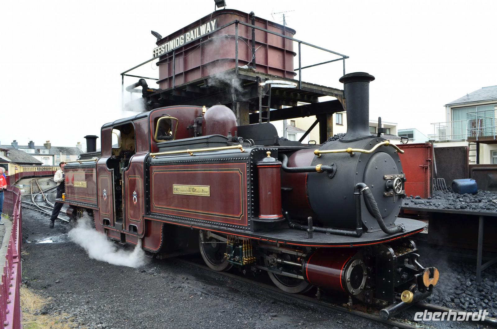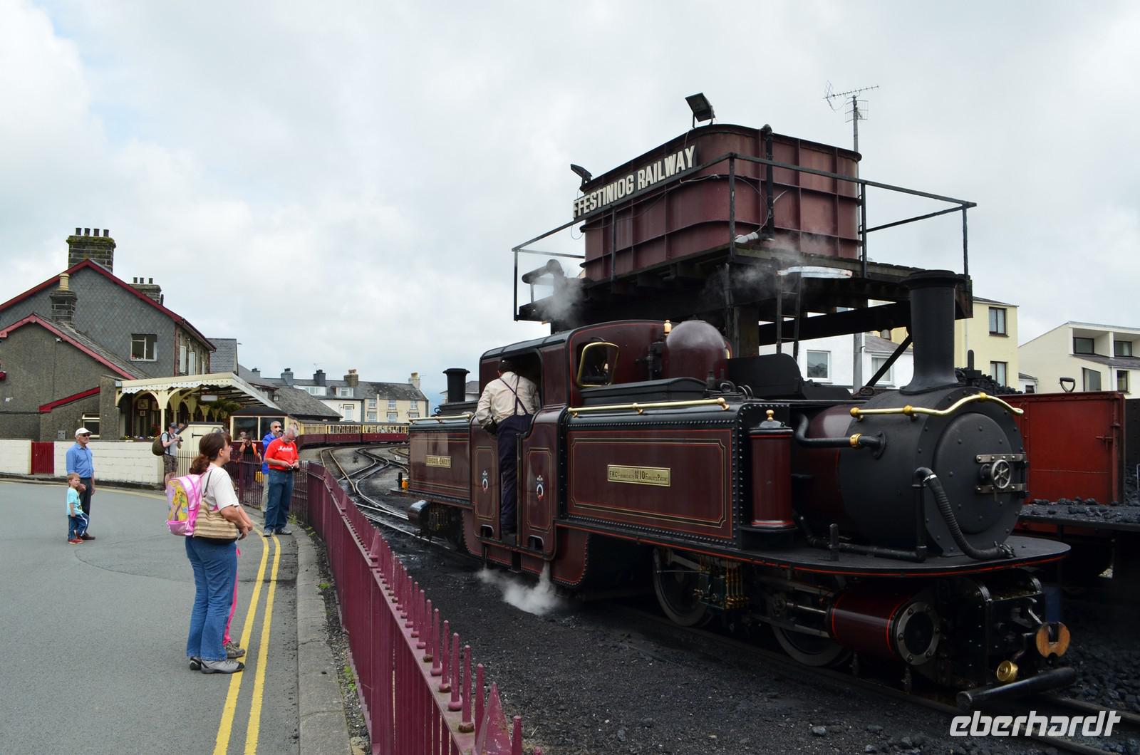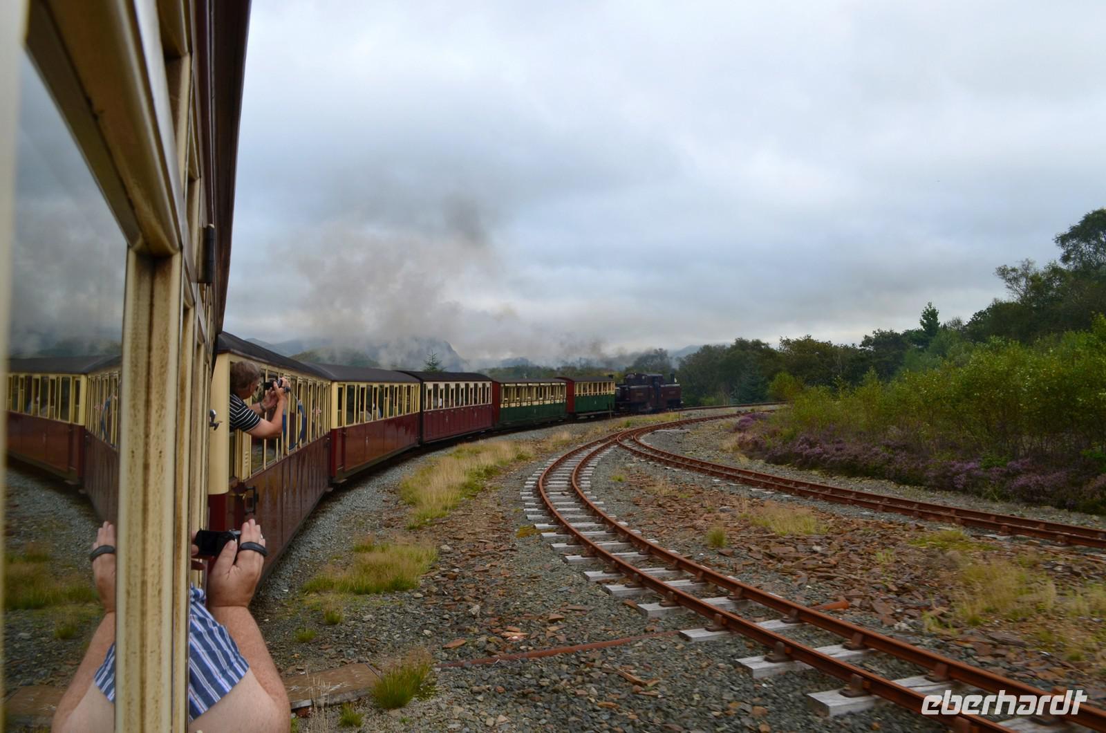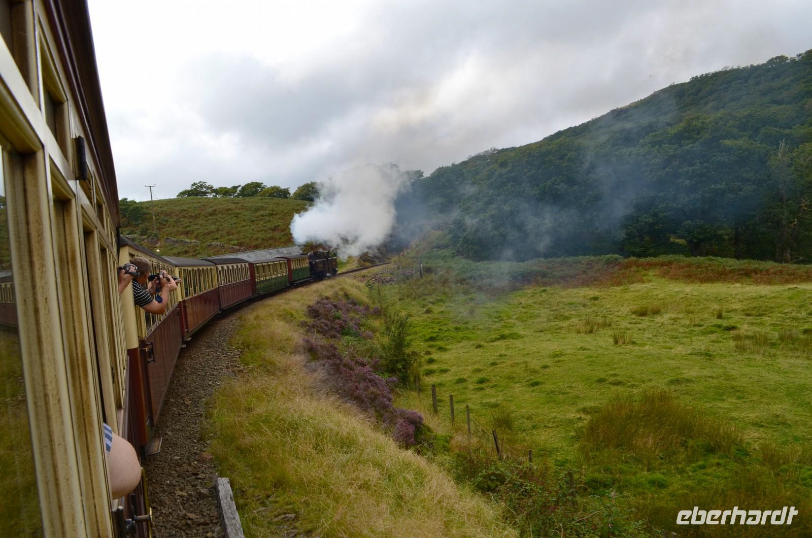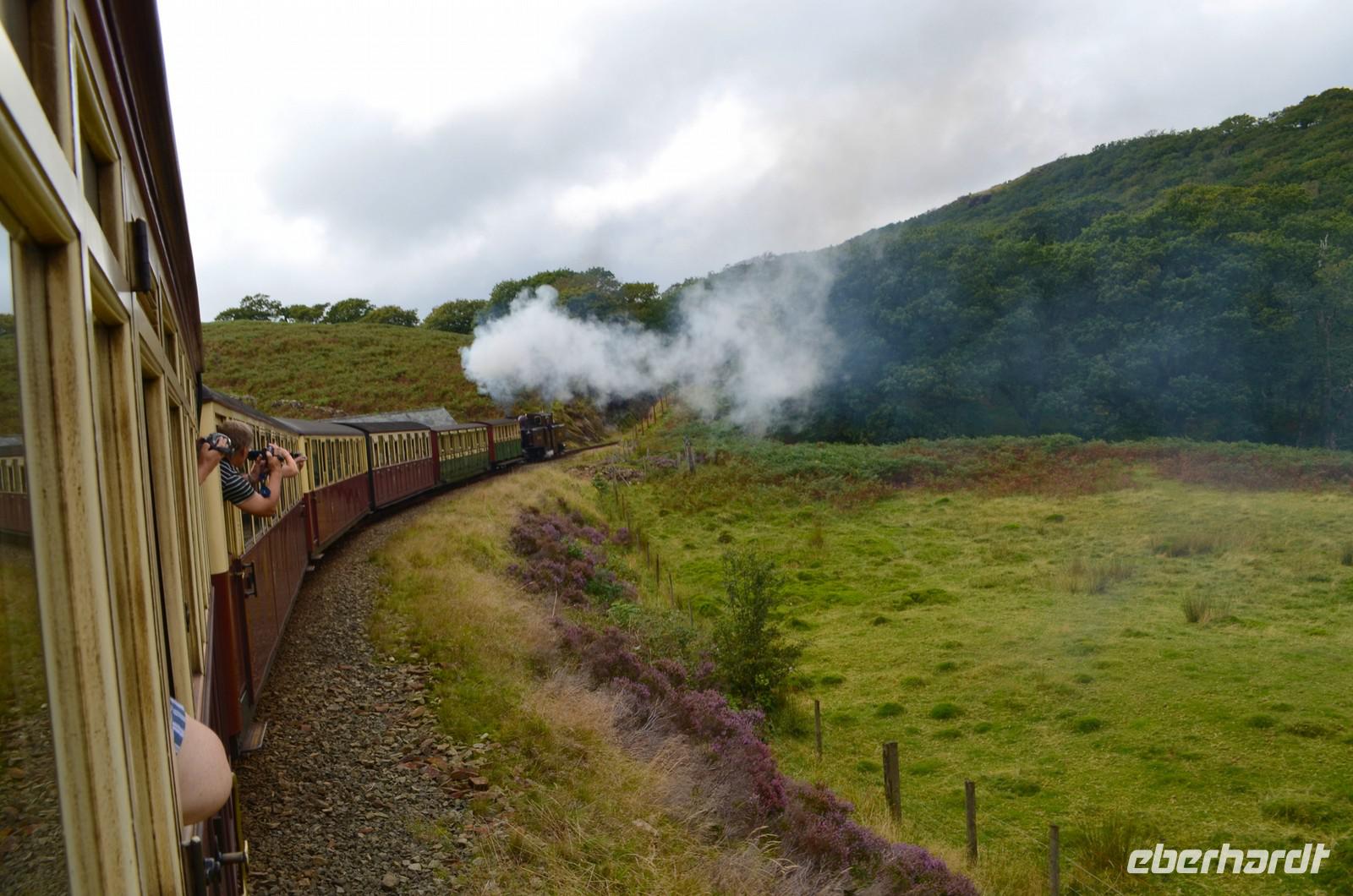 Schließlich im Hafenstädtchen Porthmadog wartet die Ffestinog Railway auf uns. Hier, im alten Verladehafen für den in den Bergen abgebauten Schiefer, startet unsere Fahrt mit dieser alten Schmalspurbahn. Die Wagen Nr. 120 und 106 sind für uns reserviert und nachdem unsere Lok mit Wasser und Kohlen aufgefüllt wurde, kann es losgehen. Eineinhalb Stunden idyllische Fahrt bis Blaneau sind ein Erlebnis an sich und lassen das Herz jedes Dampfeisenbahnfreundes höher schlagen.