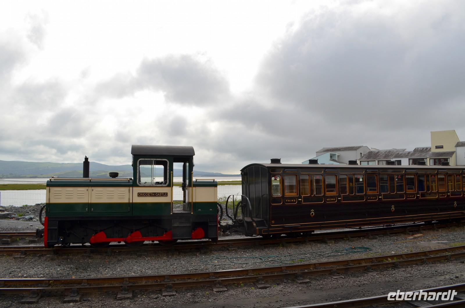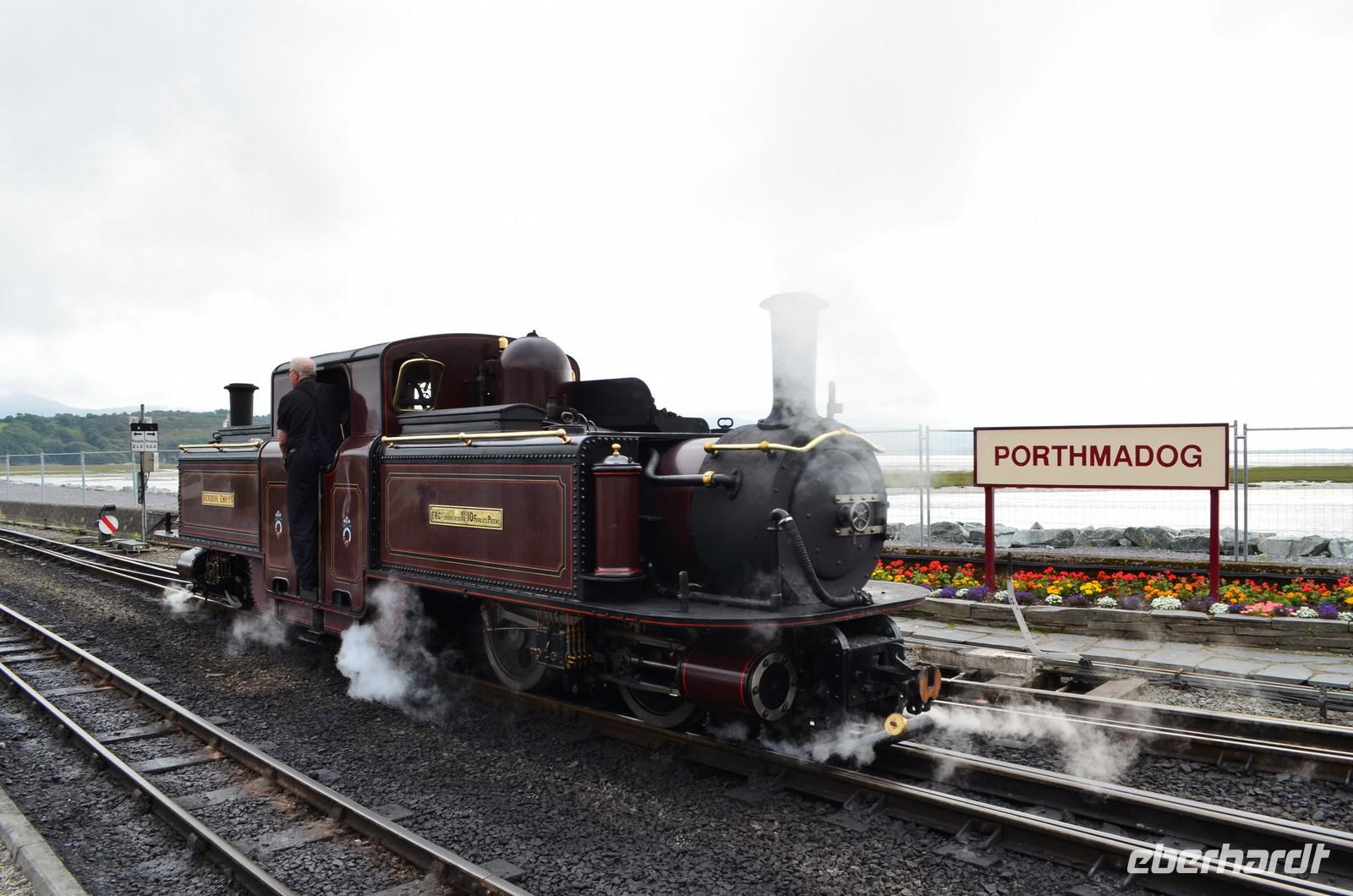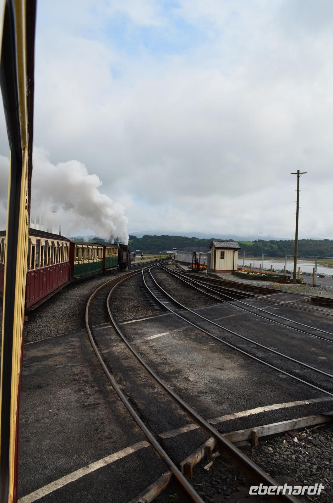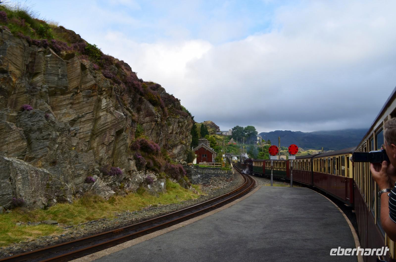 Schließlich im Hafenstädtchen Porthmadog wartet die Ffestinog Railway auf uns. Hier, im alten Verladehafen für den in den Bergen abgebauten Schiefer, startet unsere Fahrt mit dieser alten Schmalspurbahn. Die Wagen Nr. 120 und 106 sind für uns reserviert und nachdem unsere Lok mit Wasser und Kohlen aufgefüllt wurde, kann es losgehen. Eineinhalb Stunden idyllische Fahrt bis Blaneau sind ein Erlebnis an sich und lassen das Herz jedes Dampfeisenbahnfreundes höher schlagen.