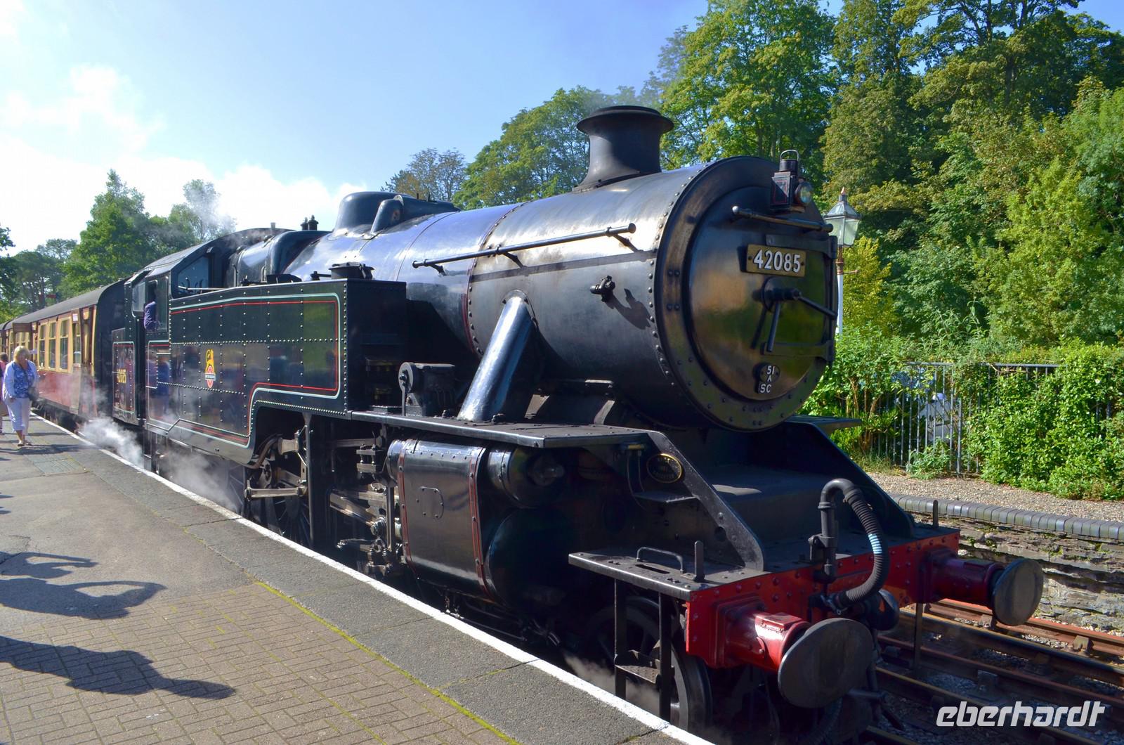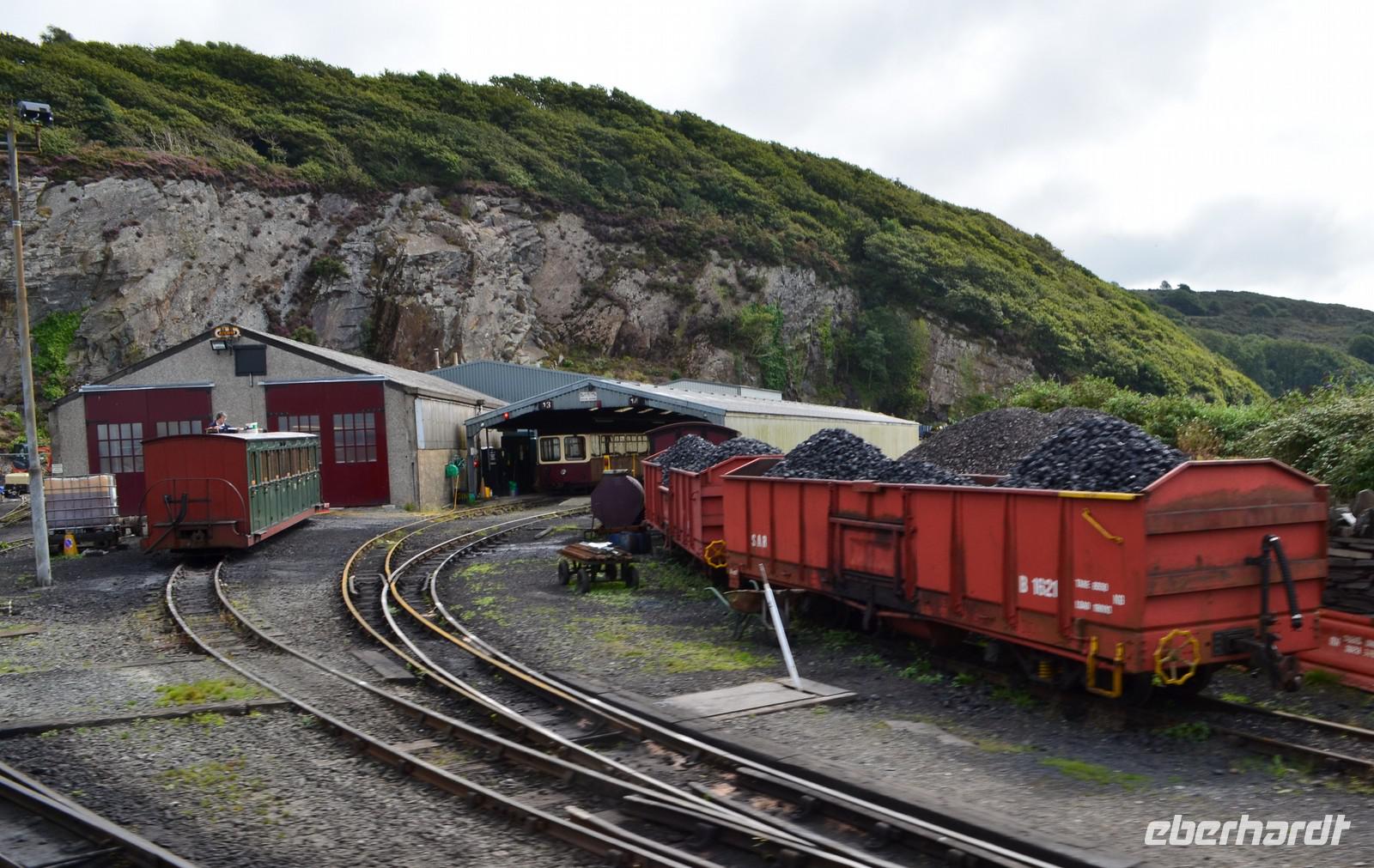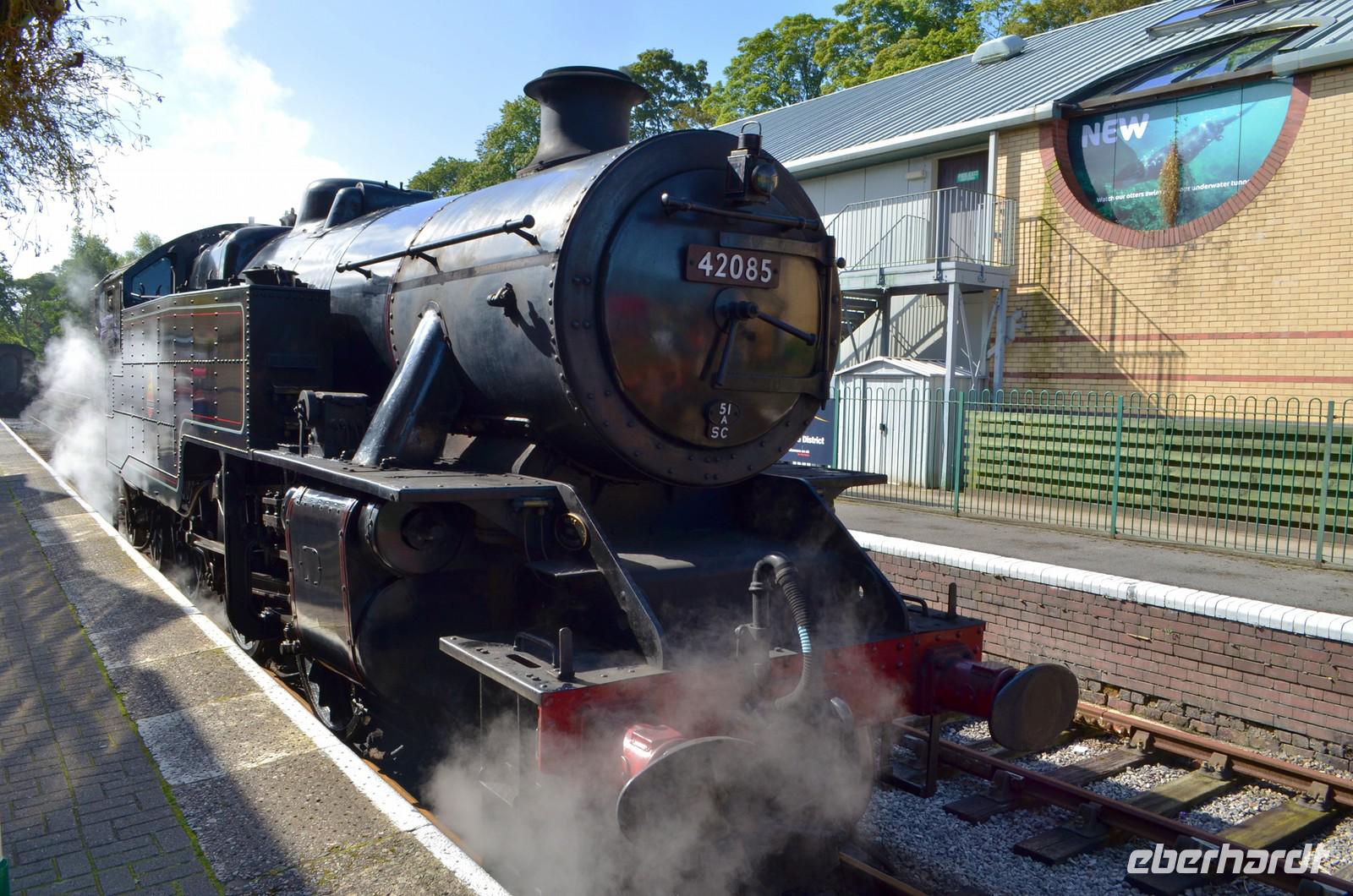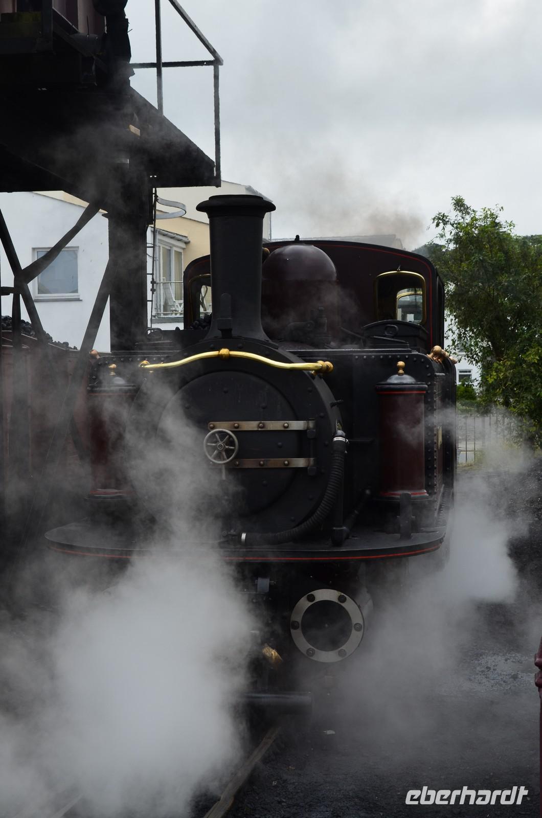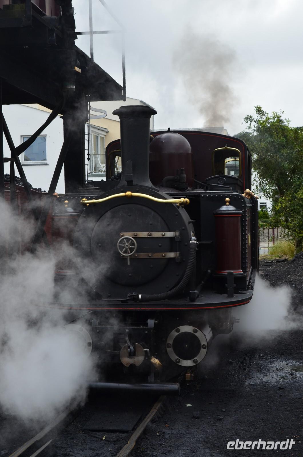 Schließlich im Hafenstädtchen Porthmadog wartet die Ffestinog Railway auf uns. Hier, im alten Verladehafen für den in den Bergen abgebauten Schiefer, startet unsere Fahrt mit dieser alten Schmalspurbahn. Die Wagen Nr. 120 und 106 sind für uns reserviert und nachdem unsere Lok mit Wasser und Kohlen aufgefüllt wurde, kann es losgehen. Eineinhalb Stunden idyllische Fahrt bis Blaneau sind ein Erlebnis an sich und lassen das Herz jedes Dampfeisenbahnfreundes höher schlagen.