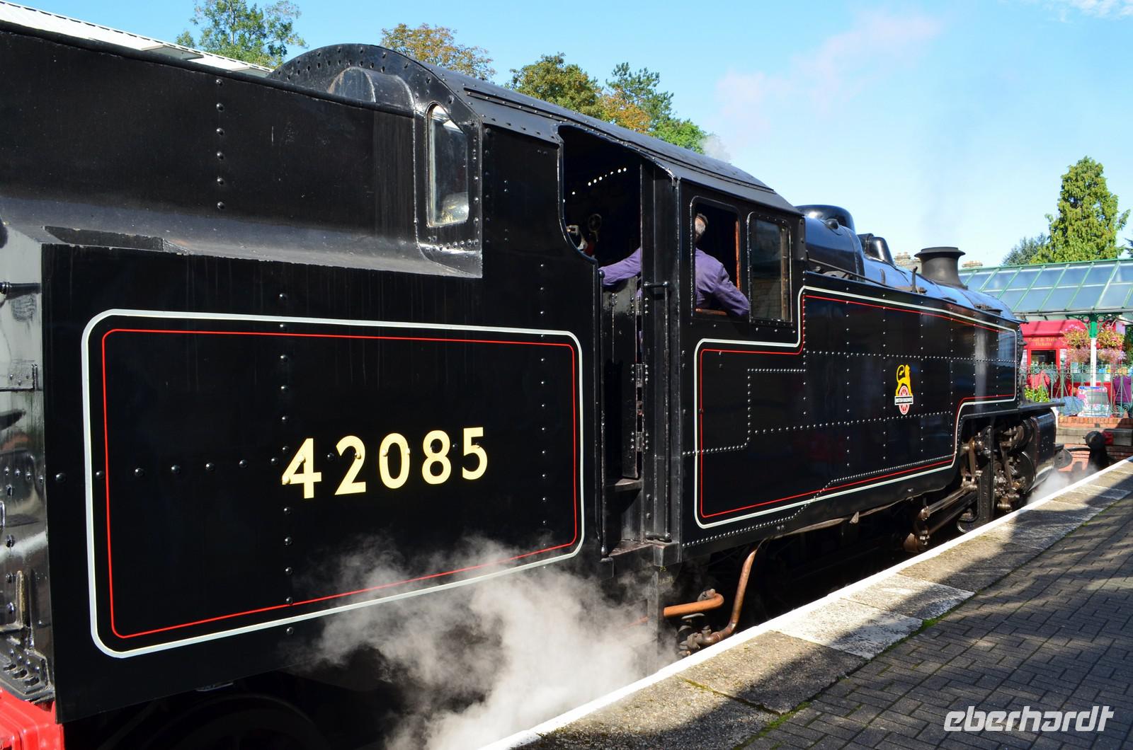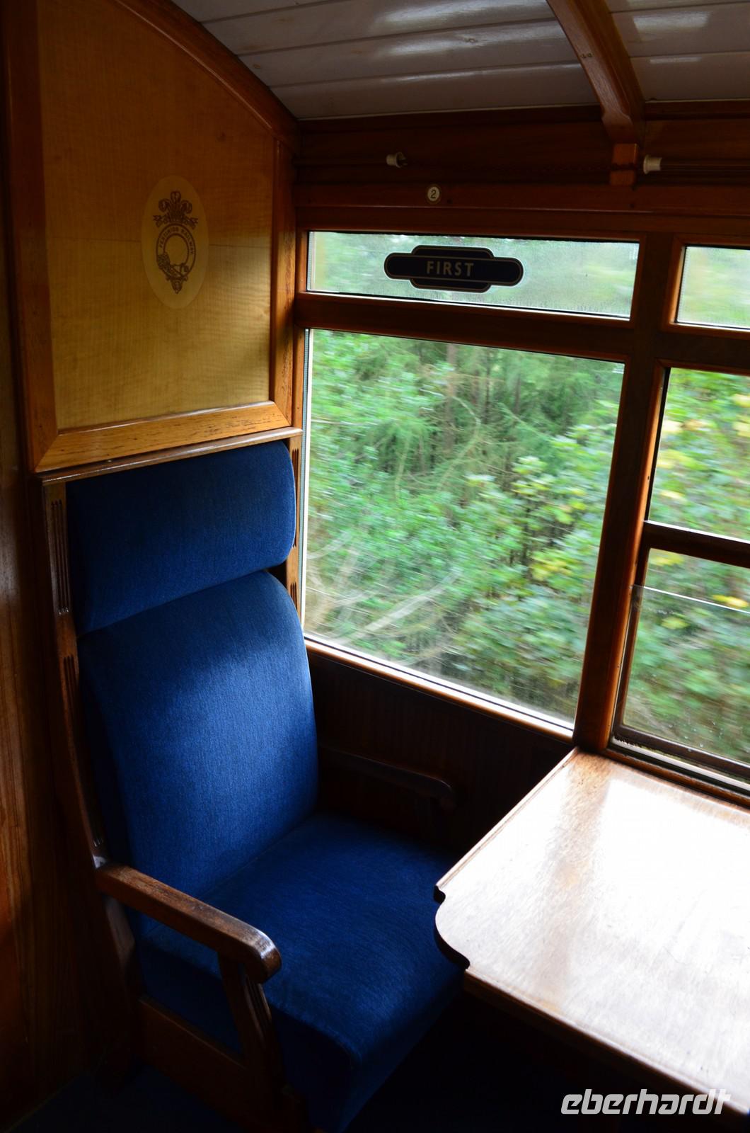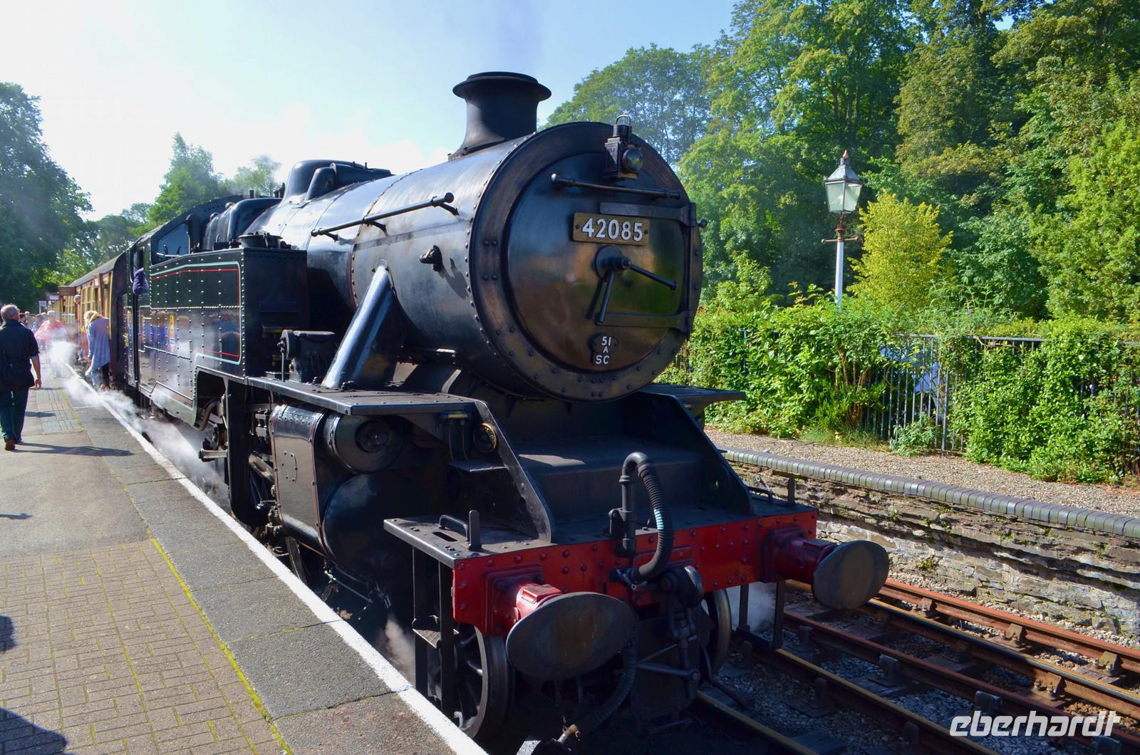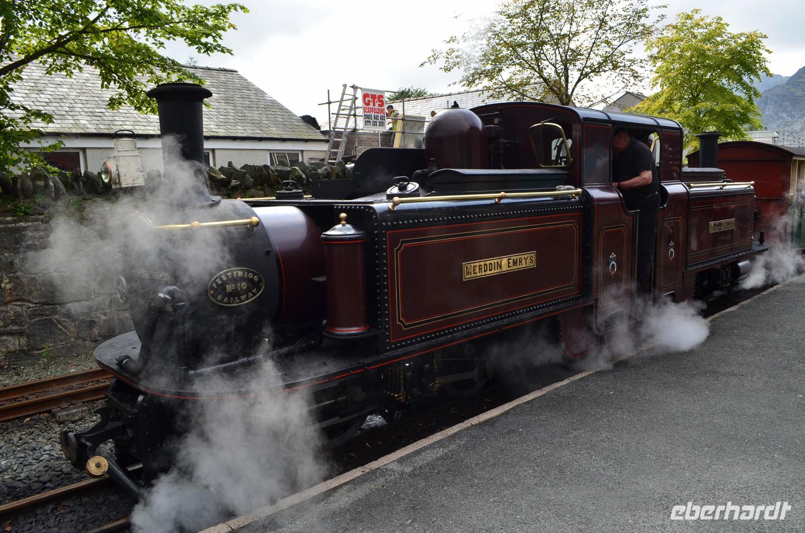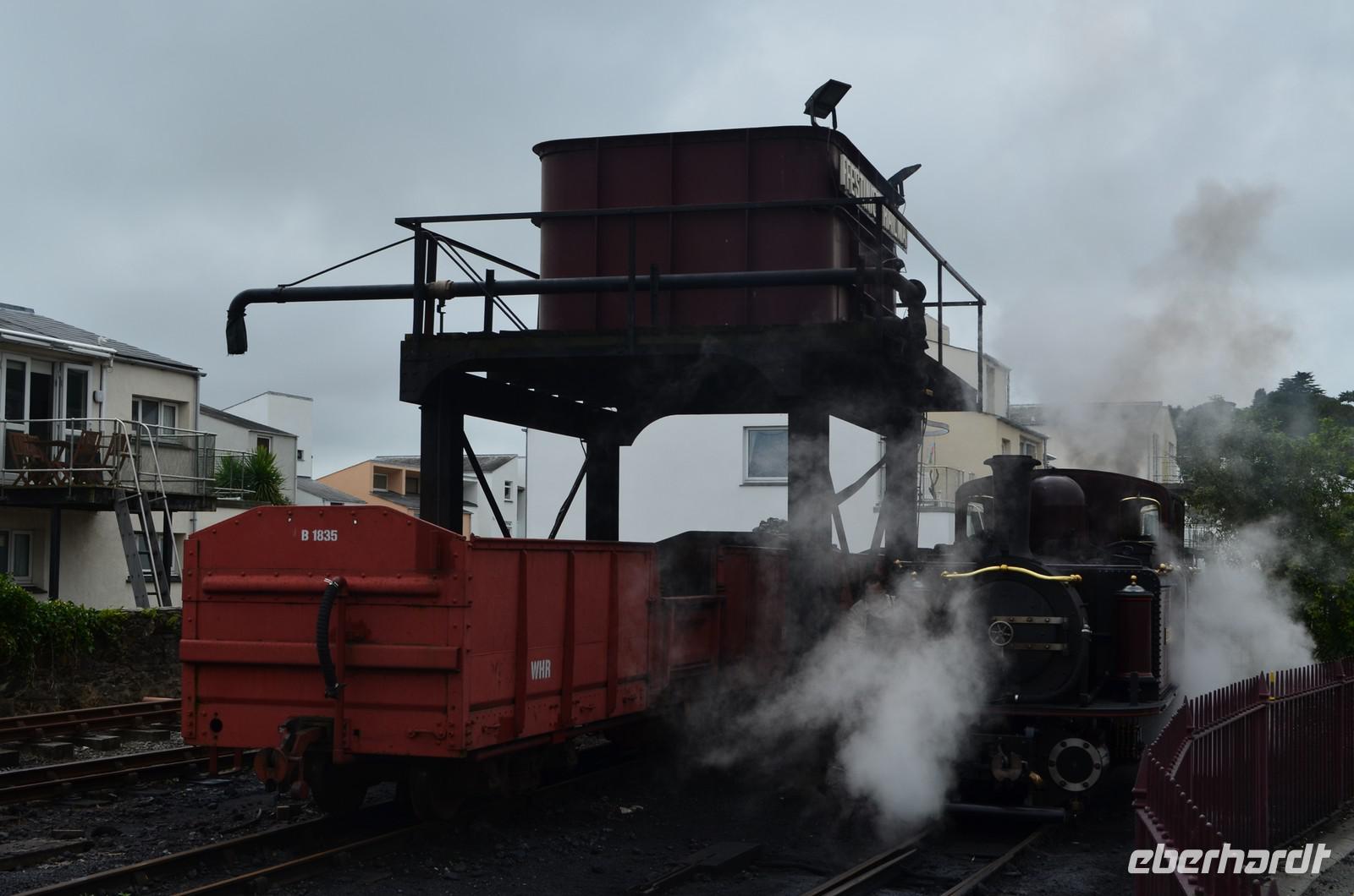 Schließlich im Hafenstädtchen Porthmadog wartet die Ffestinog Railway auf uns. Hier, im alten Verladehafen für den in den Bergen abgebauten Schiefer, startet unsere Fahrt mit dieser alten Schmalspurbahn. Die Wagen Nr. 120 und 106 sind für uns reserviert und nachdem unsere Lok mit Wasser und Kohlen aufgefüllt wurde, kann es losgehen. Eineinhalb Stunden idyllische Fahrt bis Blaneau sind ein Erlebnis an sich und lassen das Herz jedes Dampfeisenbahnfreundes höher schlagen.