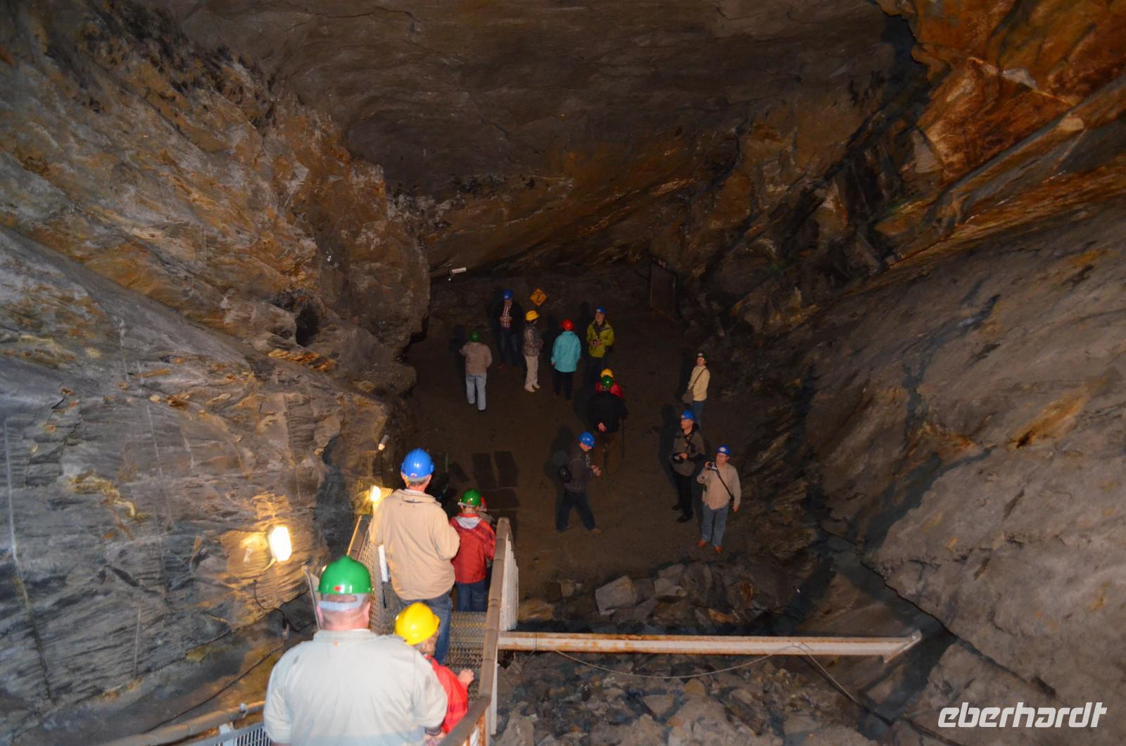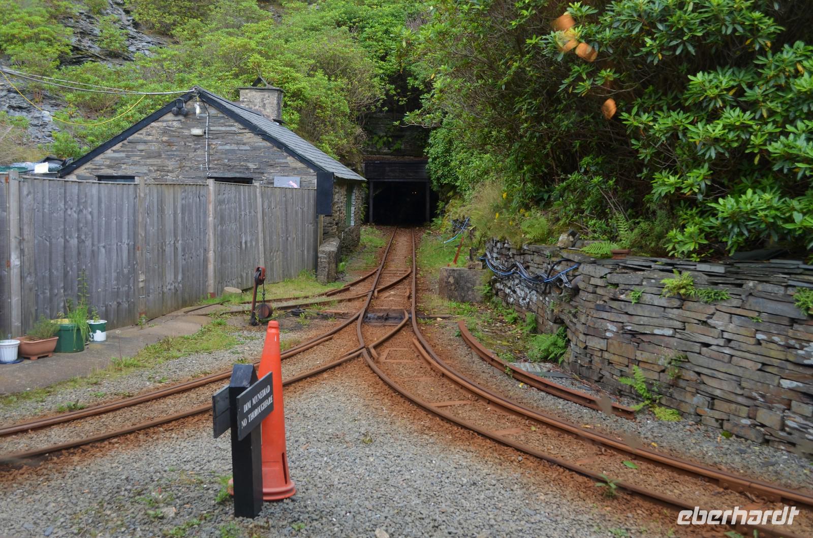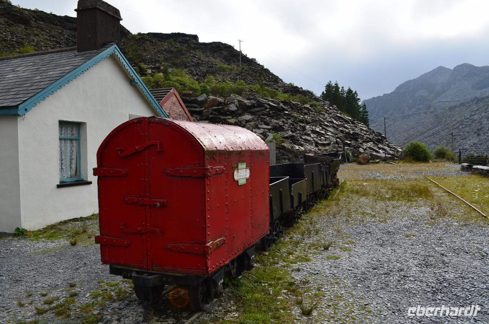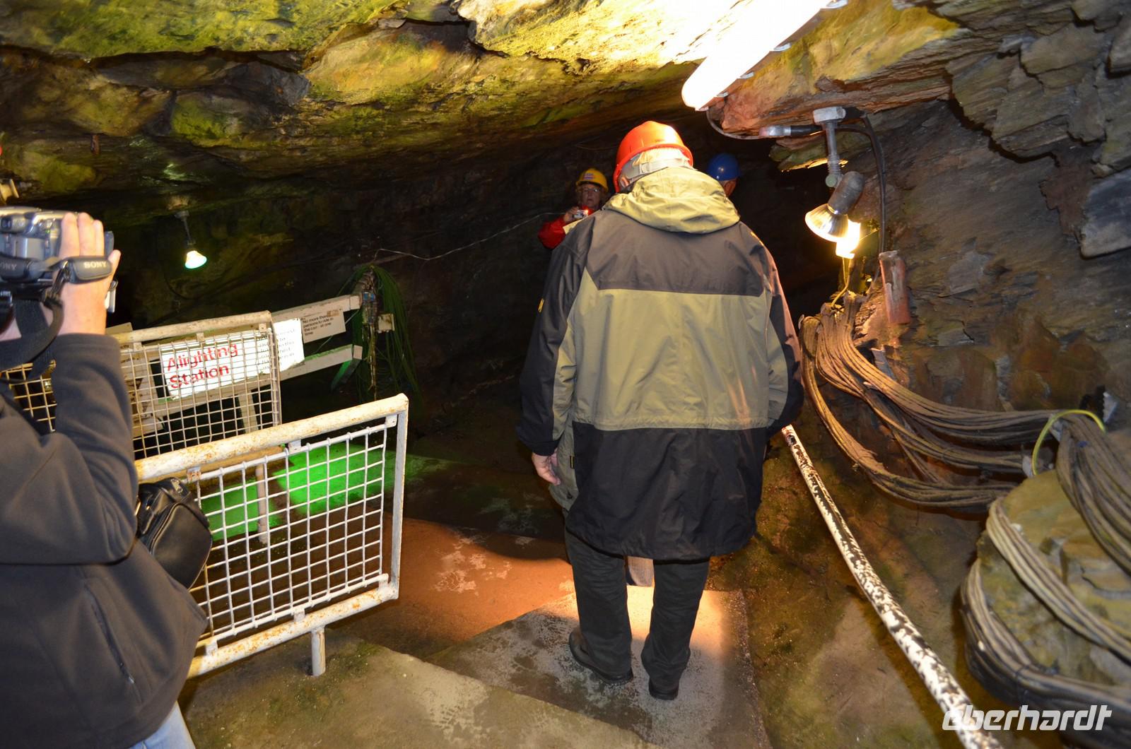 Am Nachmittag haben wir ein weiteres besonderes Abenteuer vor uns, den Besuch der Schiefermine Slate Llechwood Caverns. Mit der Minenbahn geht es hinein ins Bergwerk. Dem Steiger vor Ort schenke ich auf dessen Wunsch meinen eberhardt-Schlüsselanhänger.