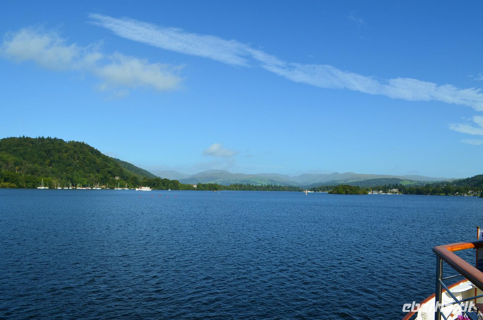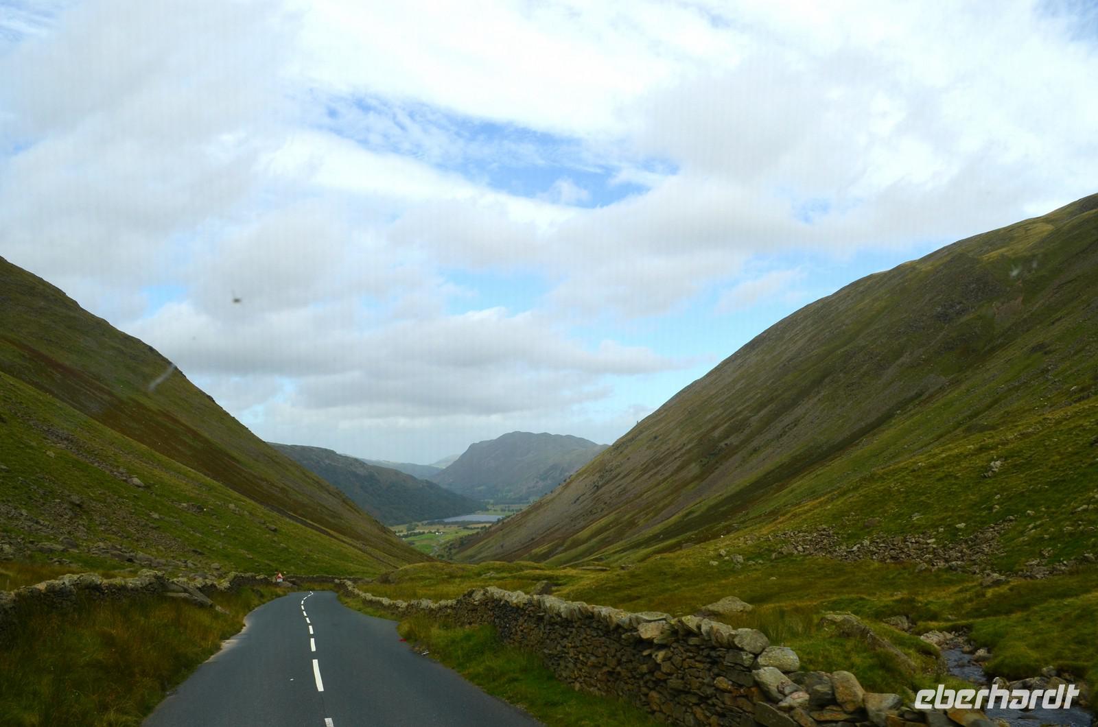 Der Windermere ist 17 km lang und zwischen 400 und 1500 Meter breit. Die tiefste Stelle liegt mit 65 Metern an seinem nördlichen Ende. Wir schippern erholsam darüber hin, bis Bowness. Von hier geht es mit unserem Reisebus die engen Straßen hinauf zum Kirkstone Pass, wo wir eine sehr schöne Aussicht über den Nationalpark haben.