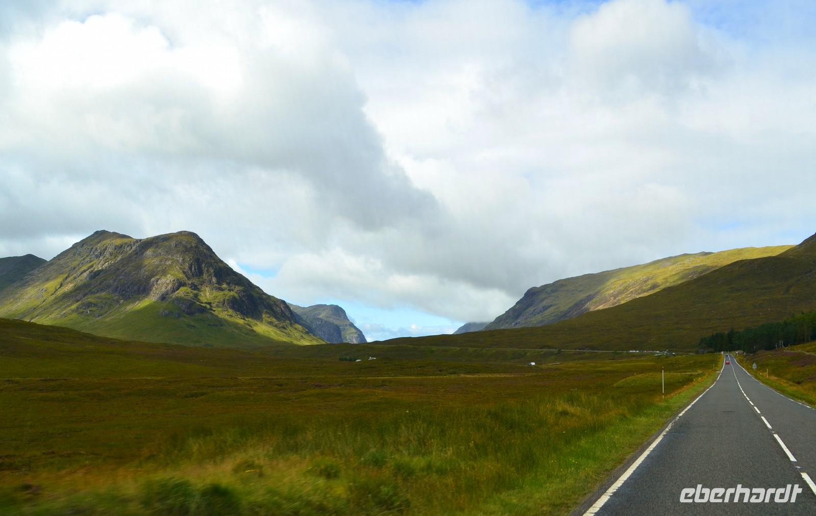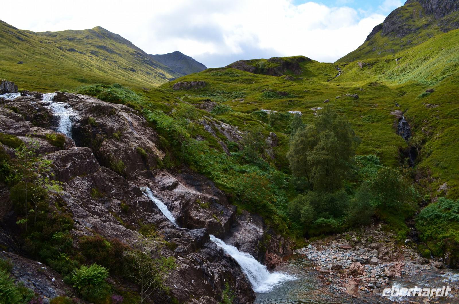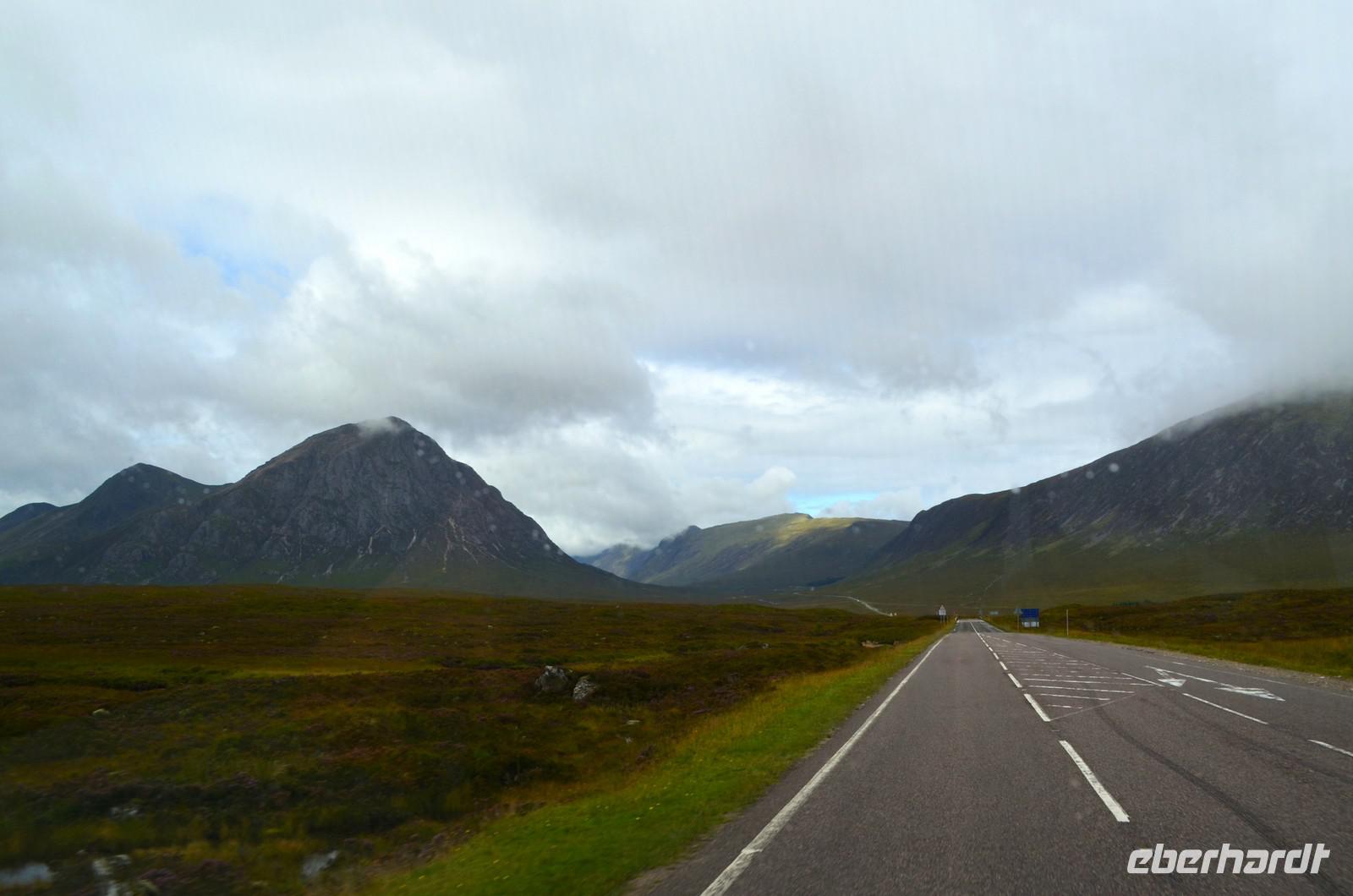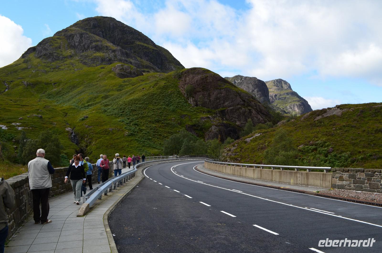 Weiter geht es über die Hochebene vor den Glencoe-Mountains mit ihren Hochmooren und Seen, dann durch das wildromantische „Tal der Hunde" hinunter Richtung Glencoe. An einem Wasserfall und an einem Parkplatz mit wunderschönem Bergpanorama finden wir tolle Fotomotive.