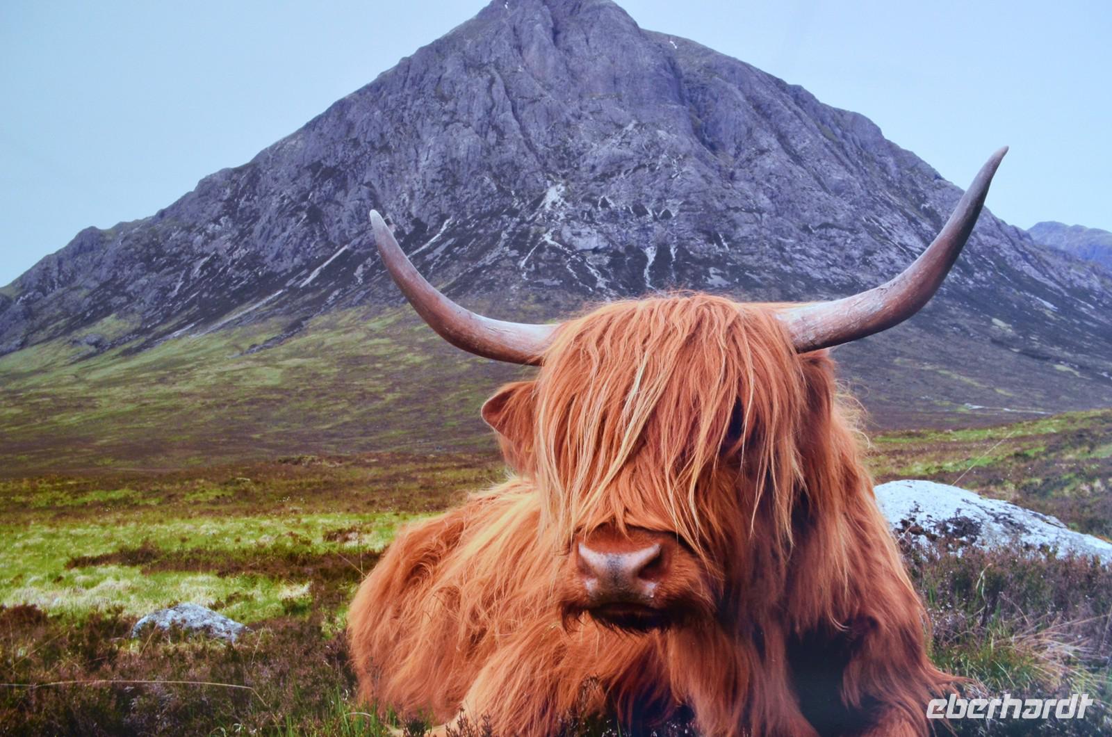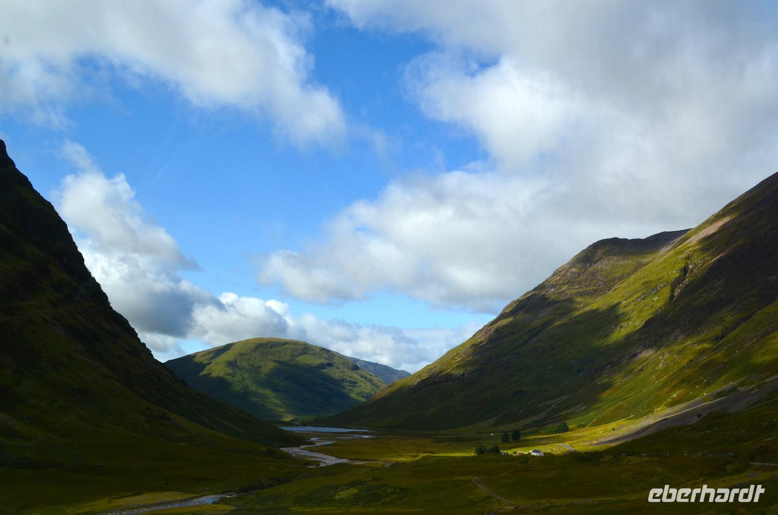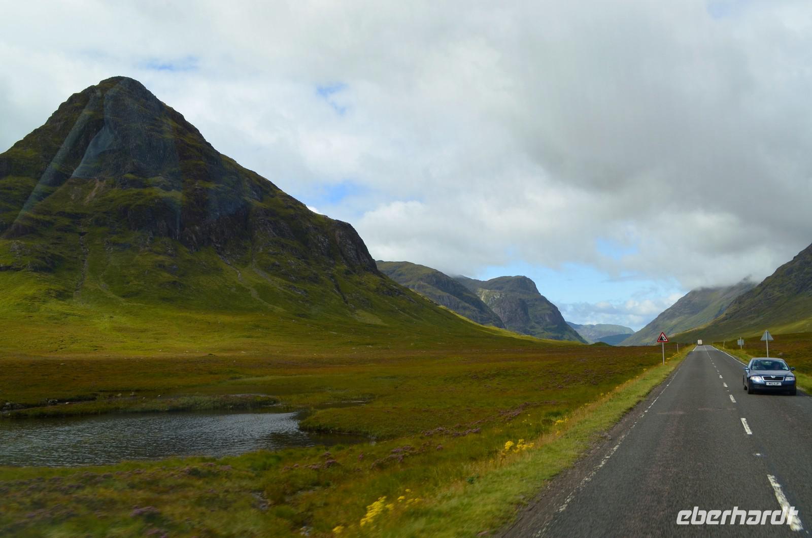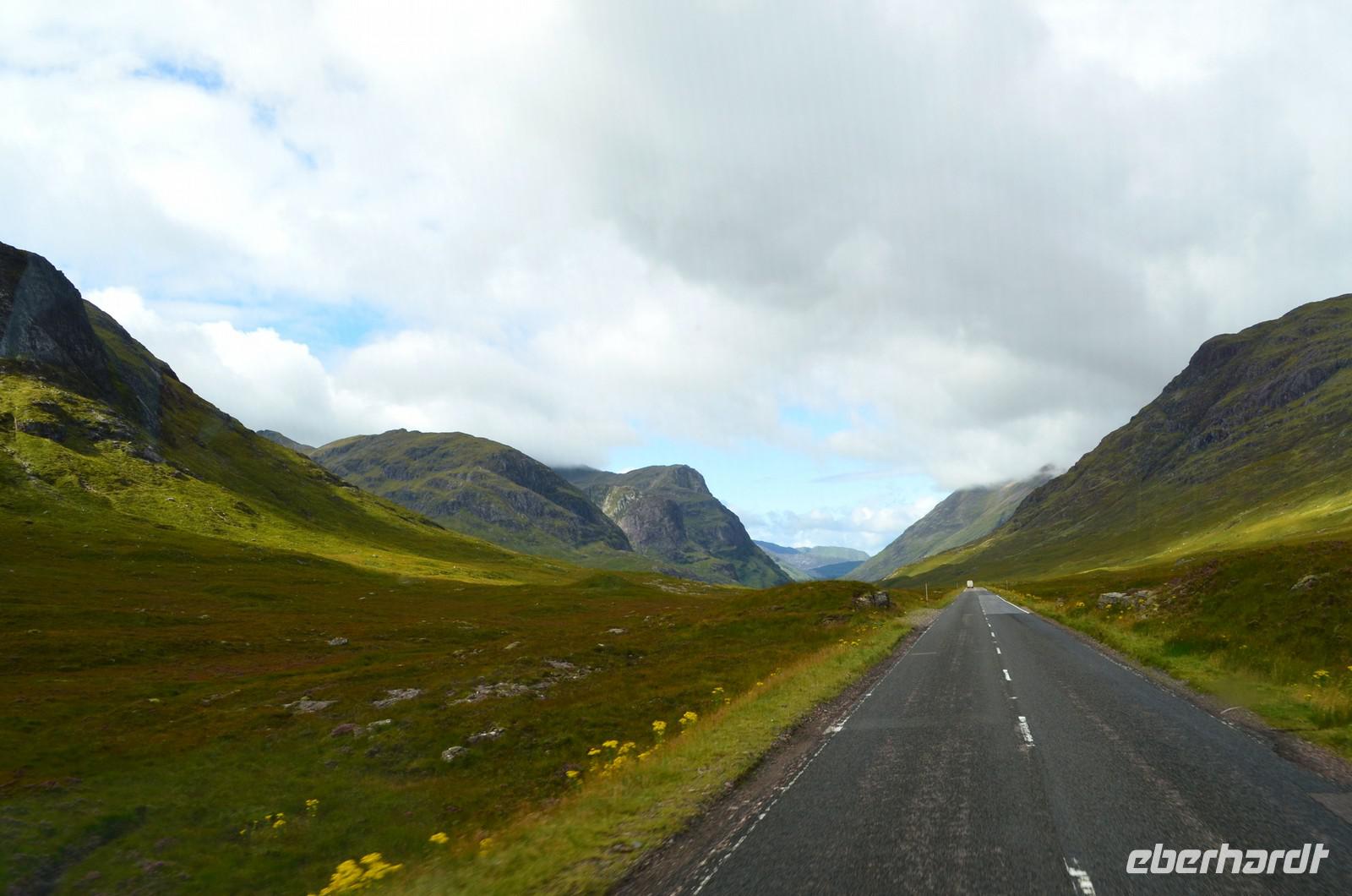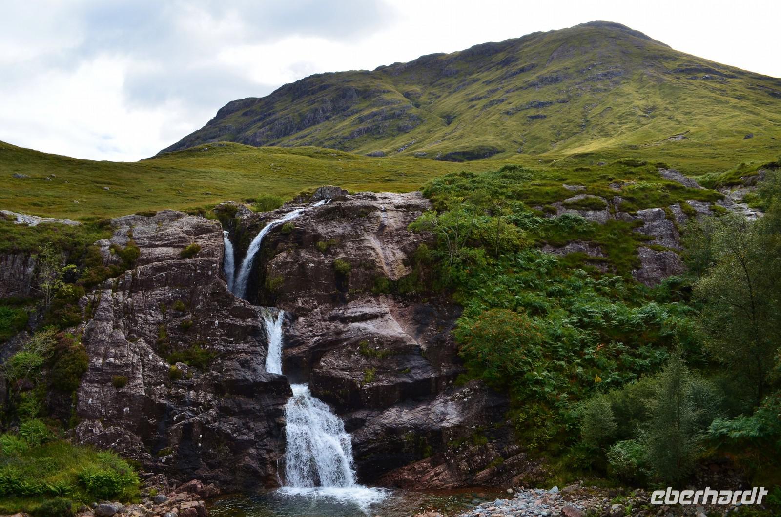 Weiter geht es über die Hochebene vor den Glencoe-Mountains mit ihren Hochmooren und Seen, dann durch das wildromantische „Tal der Hunde" hinunter Richtung Glencoe. An einem Wasserfall und an einem Parkplatz mit wunderschönem Bergpanorama finden wir tolle Fotomotive.
