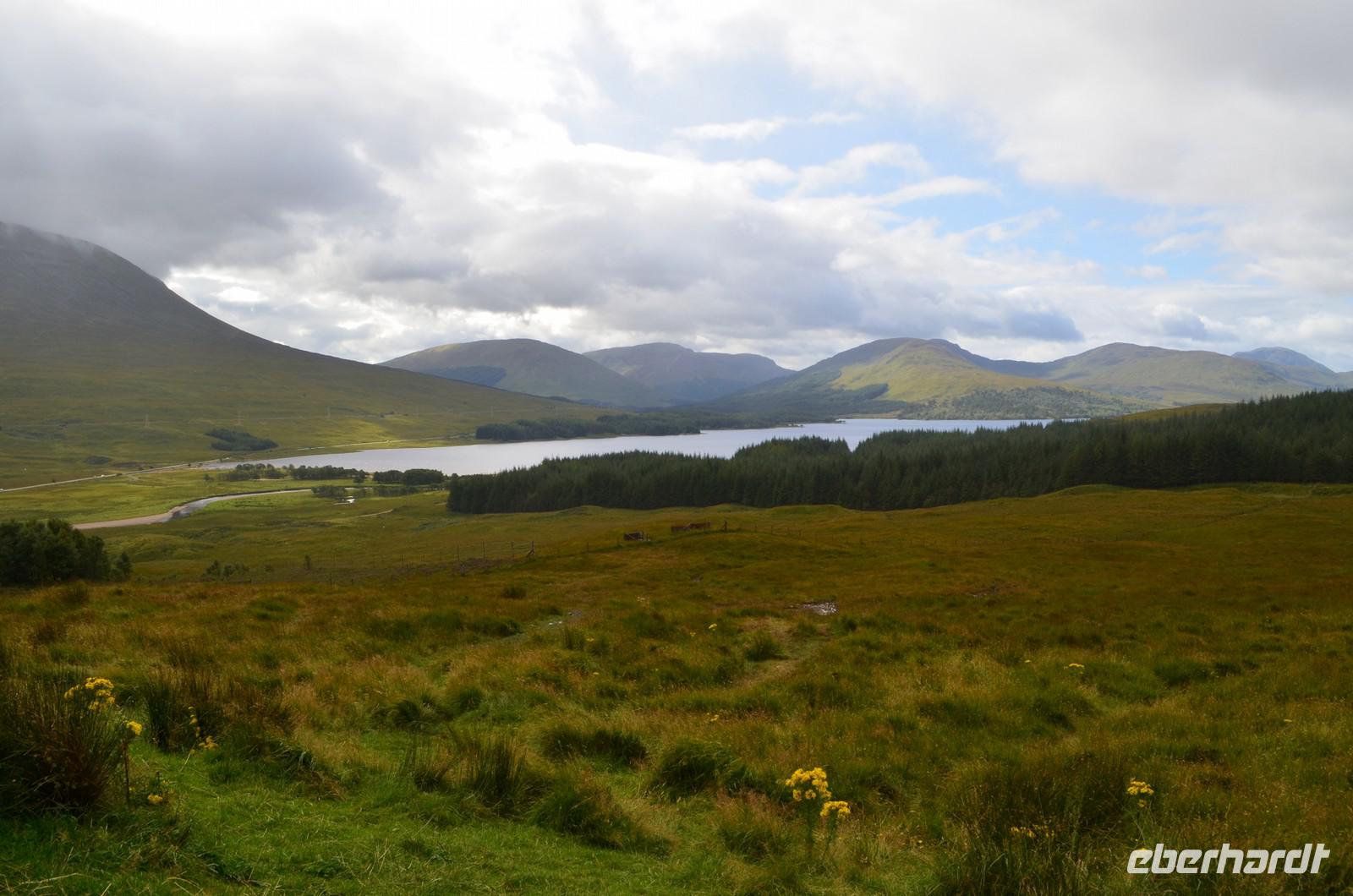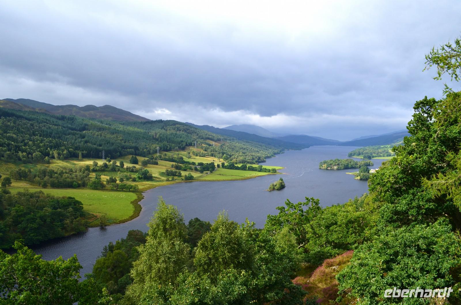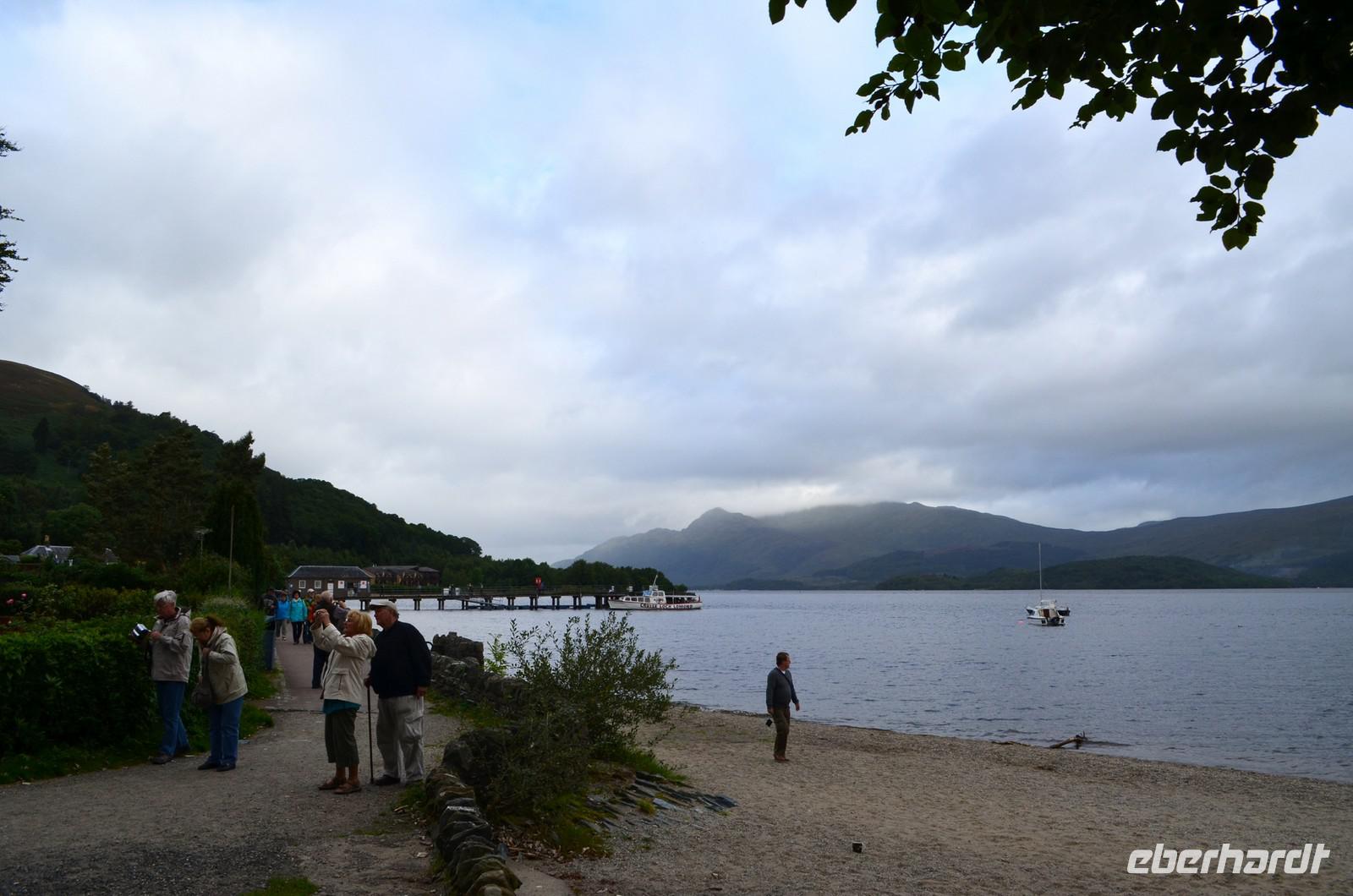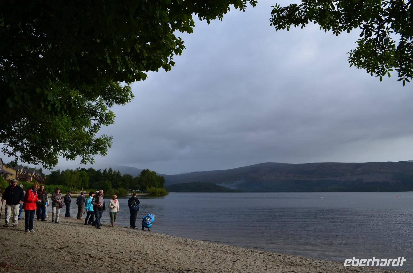Bei wieder schönem Wetter, nur manchmal kurzen Regenschauern fahren wir heute in die Vielfalt der schottischen Landschaften - zuerst zum Loch Lomond. In Luss, einem hübschen Ort am westlichen Seeufer machen einen gemeinsamen Spaziergang zum See und am Strand entlang zur kleinen Seebrücke, weiter am Ufer entlang zur Kirche und durch den Ort Luss mit seinen hübschen Häuschen und Andenkengeschäften zurück zum Parkplatz. Dann fahren wir am See nordwärts. Unser nächster Fotostopp ist nach dem Abzweig aus dem Trossachs in Richtung der Highlands. In einer Straßenkurve hat man hier einen schönen Rückblick ins Tal und auf einen See.
