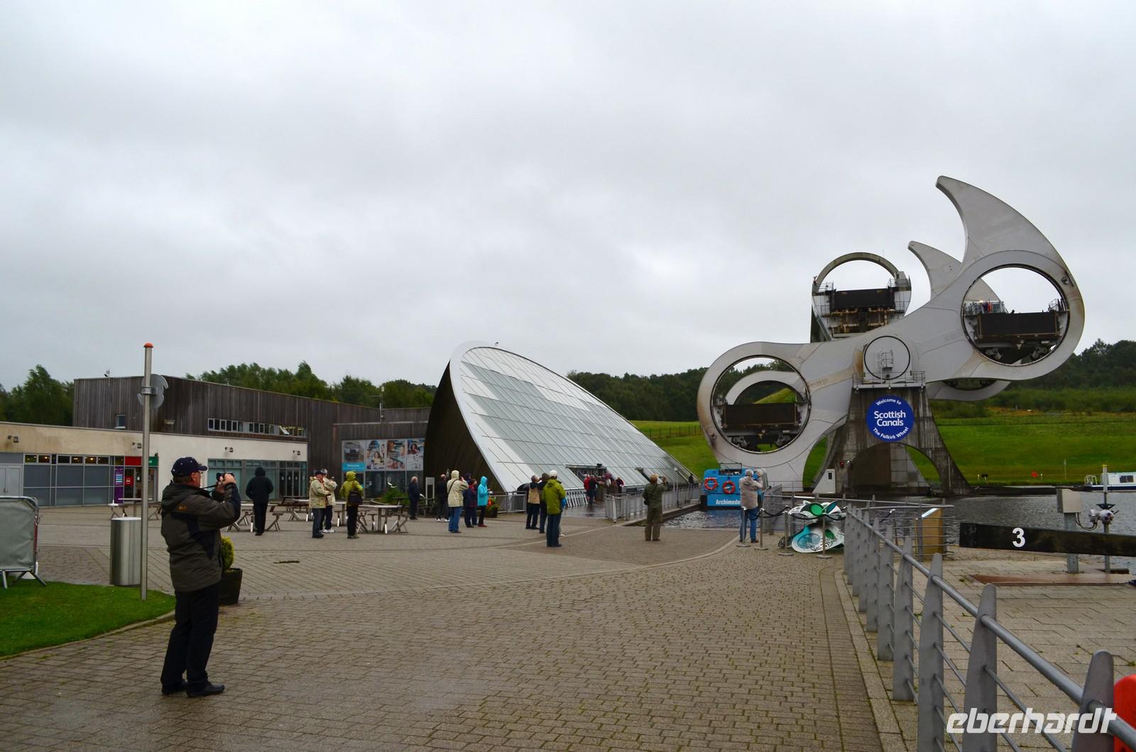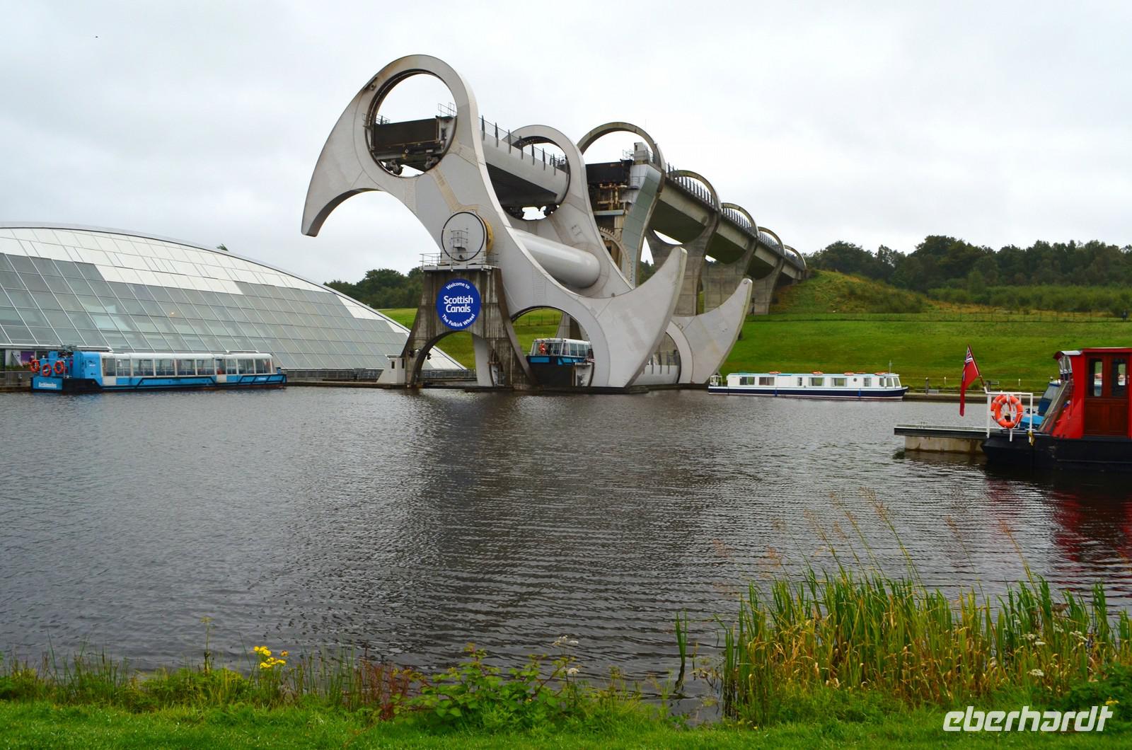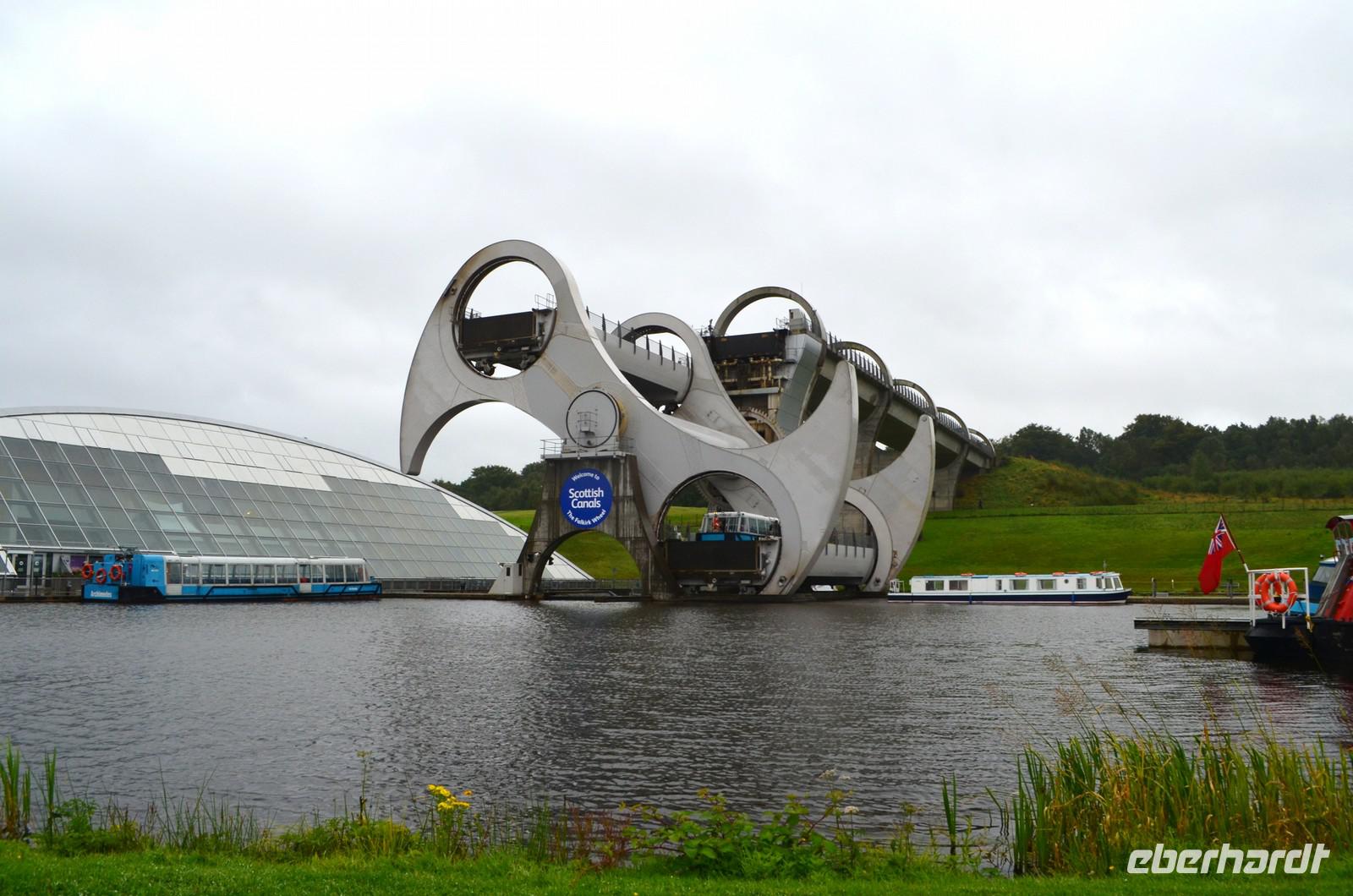 Am späten Mittag dann die Weiterfahrt durch die Trossachs, jetzt regnet es leider und am Loch Tay stürmt es ziemlich stark, sodass wir auf der Fahrt nach Killin die hohen Wellen des aufgewühlten Sees bewundern können. In Killin besichtigen wir die Falls of Dochart, dann fahren wir weiter - über Callander und Stirling. In Stirling machen wir einen Fotostopp unterhalb des berühmten Castle und hören die Lebensgeschichte der Maria Stuart. Doch bald müssen wir Richtung Edinburgh aufbrechen, denn wir wollen noch einen Abstecher zum Falkirk Wheel unternehmen, diesem modernen und durch sein Prinzip einmaligen Schiffshebewerk. Wir haben Glück und können zusehen, wie ein Ausflugsboot abgesenkt wird. Danach fahren wir entlang der Nordseite des Firth of Forth und machen einen kleinen Spaziergang zur nördlichen Aussicht mit Blick auf die Forth Road Bridge und die Railway Bridge. Und danach folgt die Brückenüberfahrt nach Süden. Das Hilton Hotel in Edinburgh ist unser Endziel.