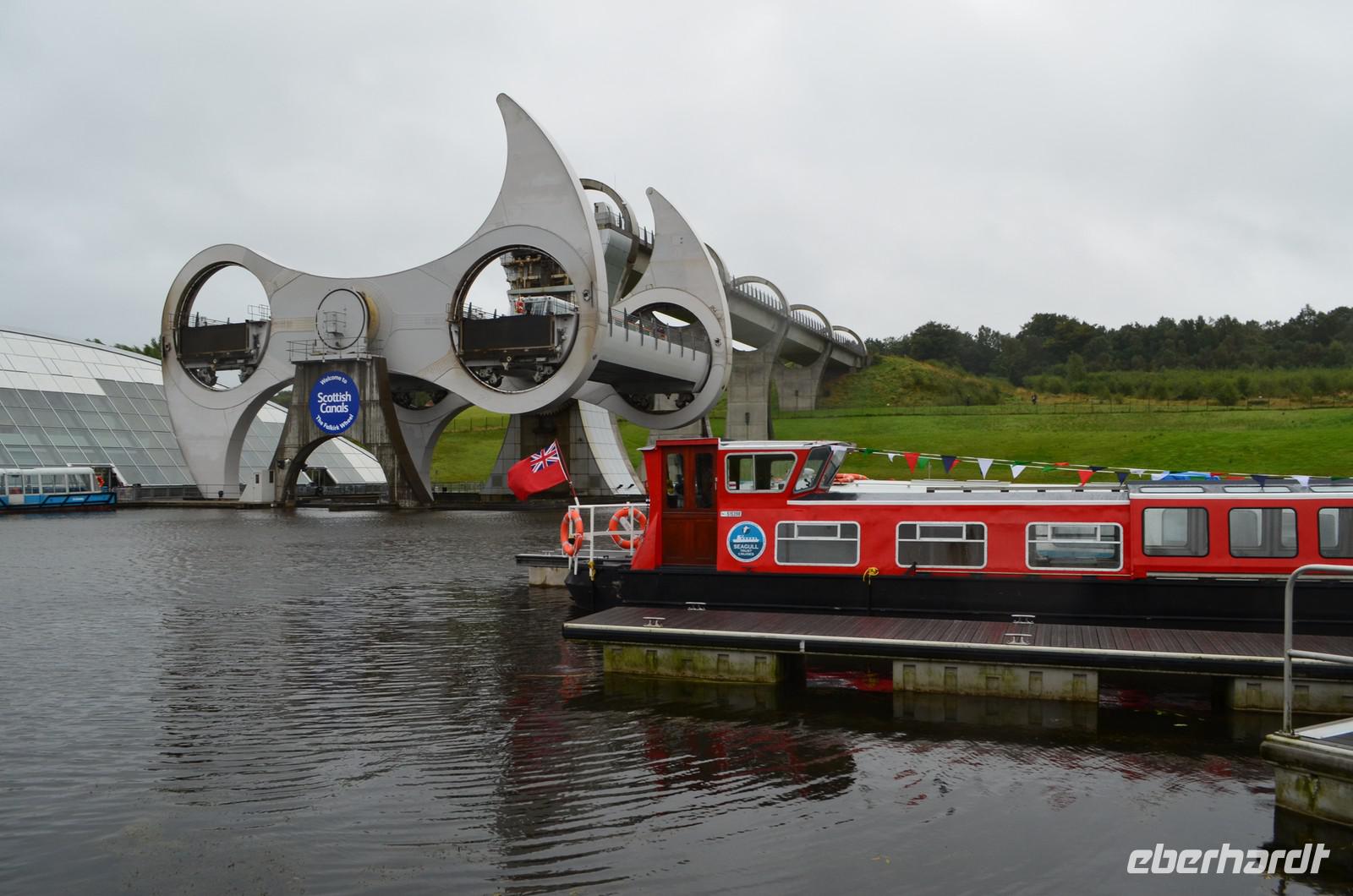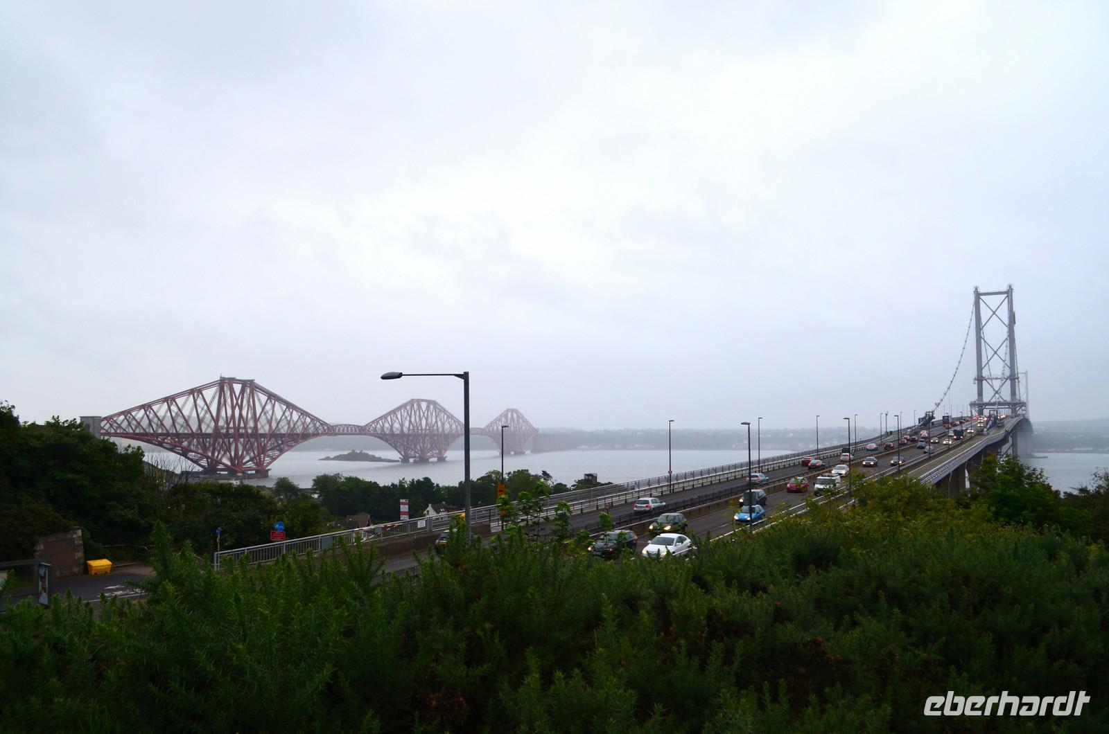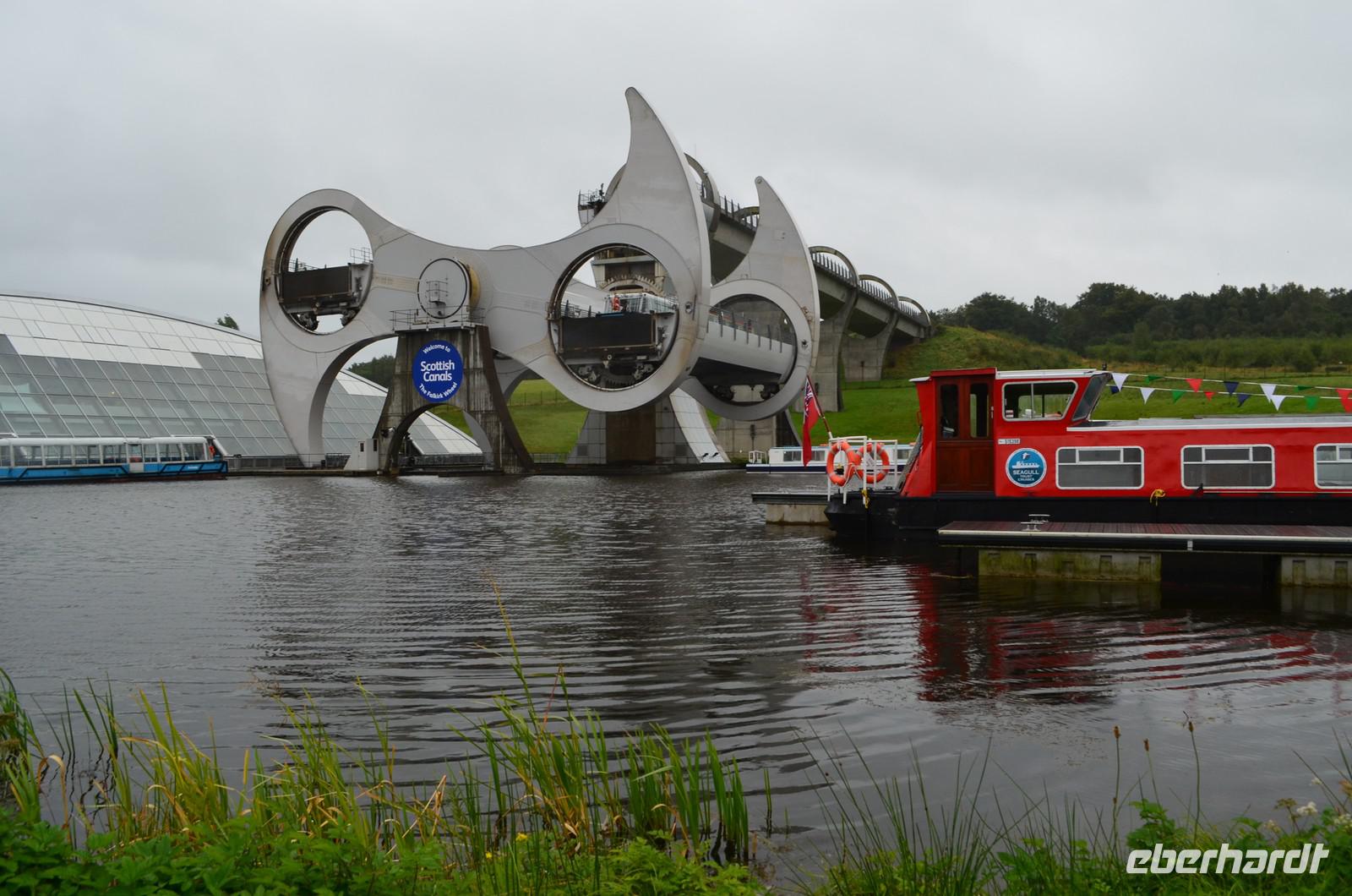 Am späten Mittag dann die Weiterfahrt durch die Trossachs, jetzt regnet es leider und am Loch Tay stürmt es ziemlich stark, sodass wir auf der Fahrt nach Killin die hohen Wellen des aufgewühlten Sees bewundern können. In Killin besichtigen wir die Falls of Dochart, dann fahren wir weiter - über Callander und Stirling. In Stirling machen wir einen Fotostopp unterhalb des berühmten Castle und hören die Lebensgeschichte der Maria Stuart. Doch bald müssen wir Richtung Edinburgh aufbrechen, denn wir wollen noch einen Abstecher zum Falkirk Wheel unternehmen, diesem modernen und durch sein Prinzip einmaligen Schiffshebewerk. Wir haben Glück und können zusehen, wie ein Ausflugsboot abgesenkt wird. Danach fahren wir entlang der Nordseite des Firth of Forth und machen einen kleinen Spaziergang zur nördlichen Aussicht mit Blick auf die Forth Road Bridge und die Railway Bridge. Und danach folgt die Brückenüberfahrt nach Süden. Das Hilton Hotel in Edinburgh ist unser Endziel.
