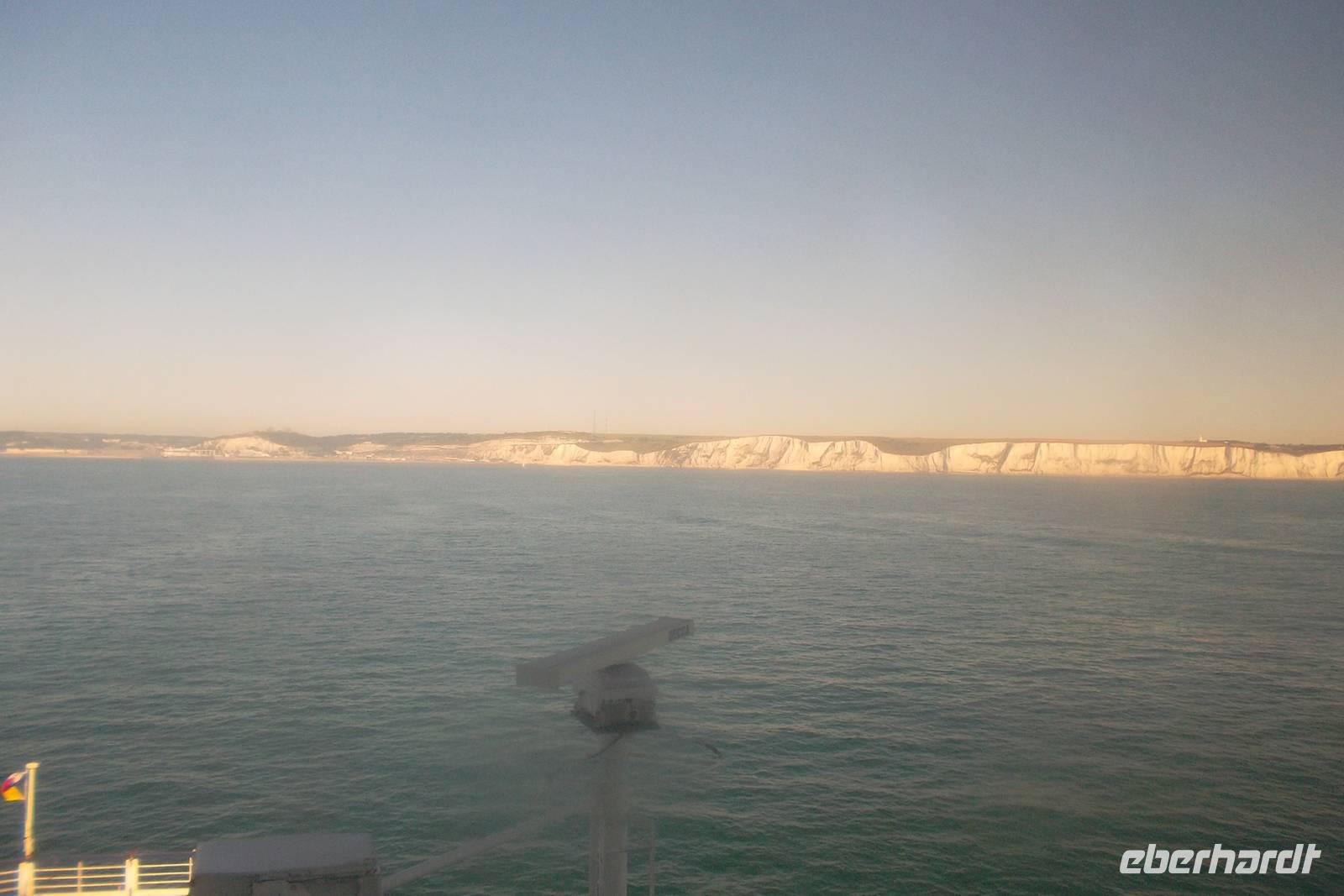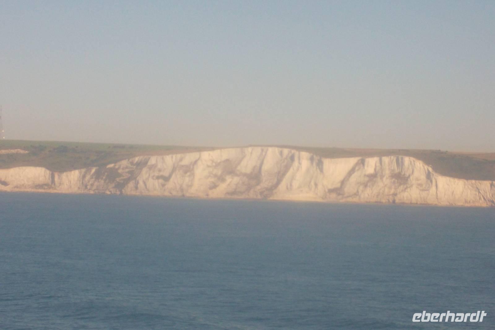 Im Fährhafen liefen wir zunächst durch den Flachbau der britischen Passkontrolle. Aber noch bevor wir uns einschiffen konnten, hielt der französische Zoll eine Überraschung bereit: alle mussten aussteigen und Handgepäck sowie Koffer zur Durchleuchtung vorführen. Fast hätten wir das Fährschiff verpasst, obwohl wir doch eigentlich pünktlich waren. Nur der Geleitschutz durch einen französischen Beamten ermöglichte uns dann noch die knappe Einschiffung: hinter unserem Bus wurde die Fähre geschlossen und ging in See. Nach knapp zwei Stunden erreichten wir dann Großbritannien, nicht ohne auf dem Schiff die Uhr umgestellt zu haben. Imponierend war es wieder einmal, nach der allmählich auftauchenden Kreideküste von Dover Ausschau zu halten. Diese weißen Kreidefelsen sind wohl sogar für den antiken Namen „Albion" für Europas größte Insel verantwortlich.