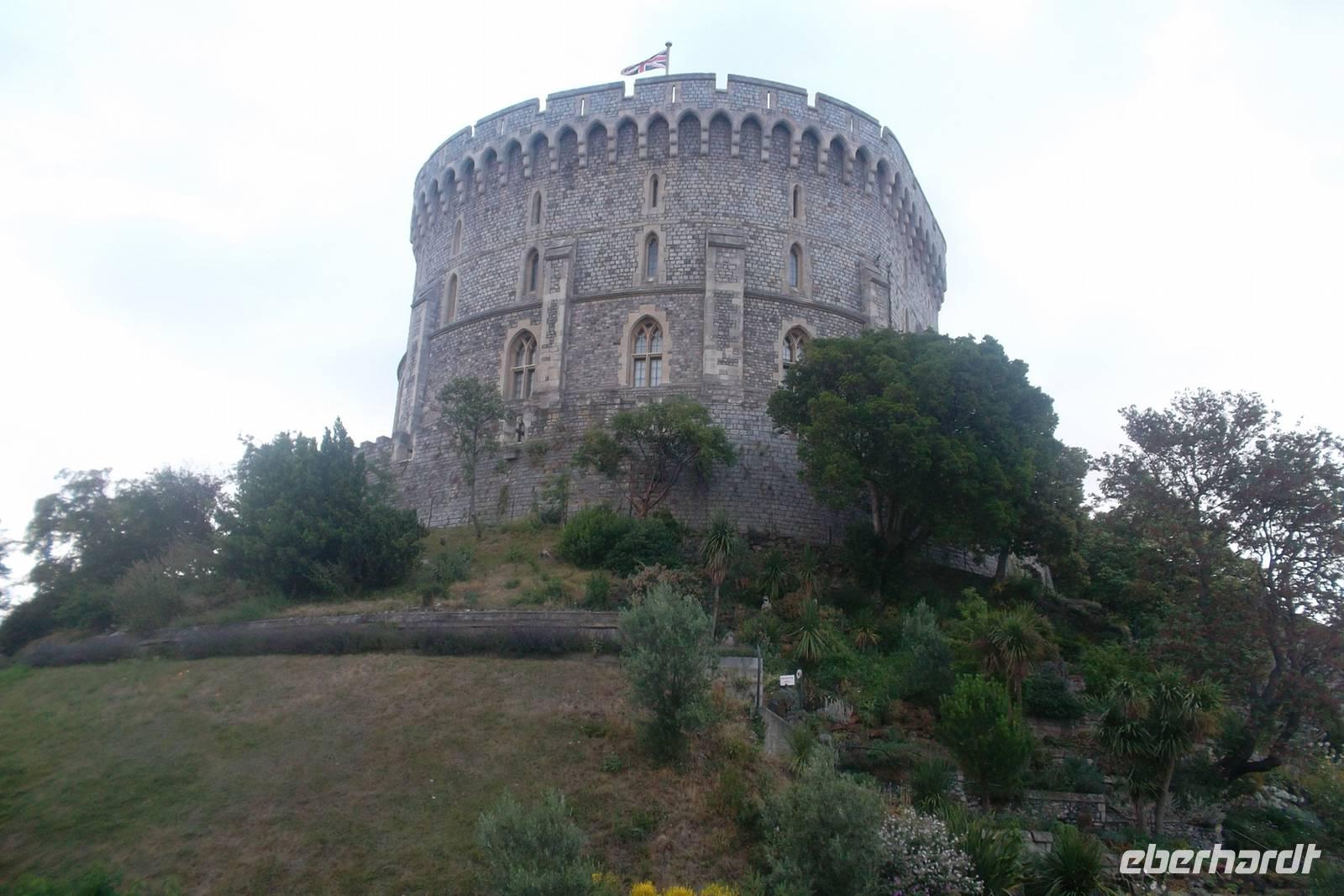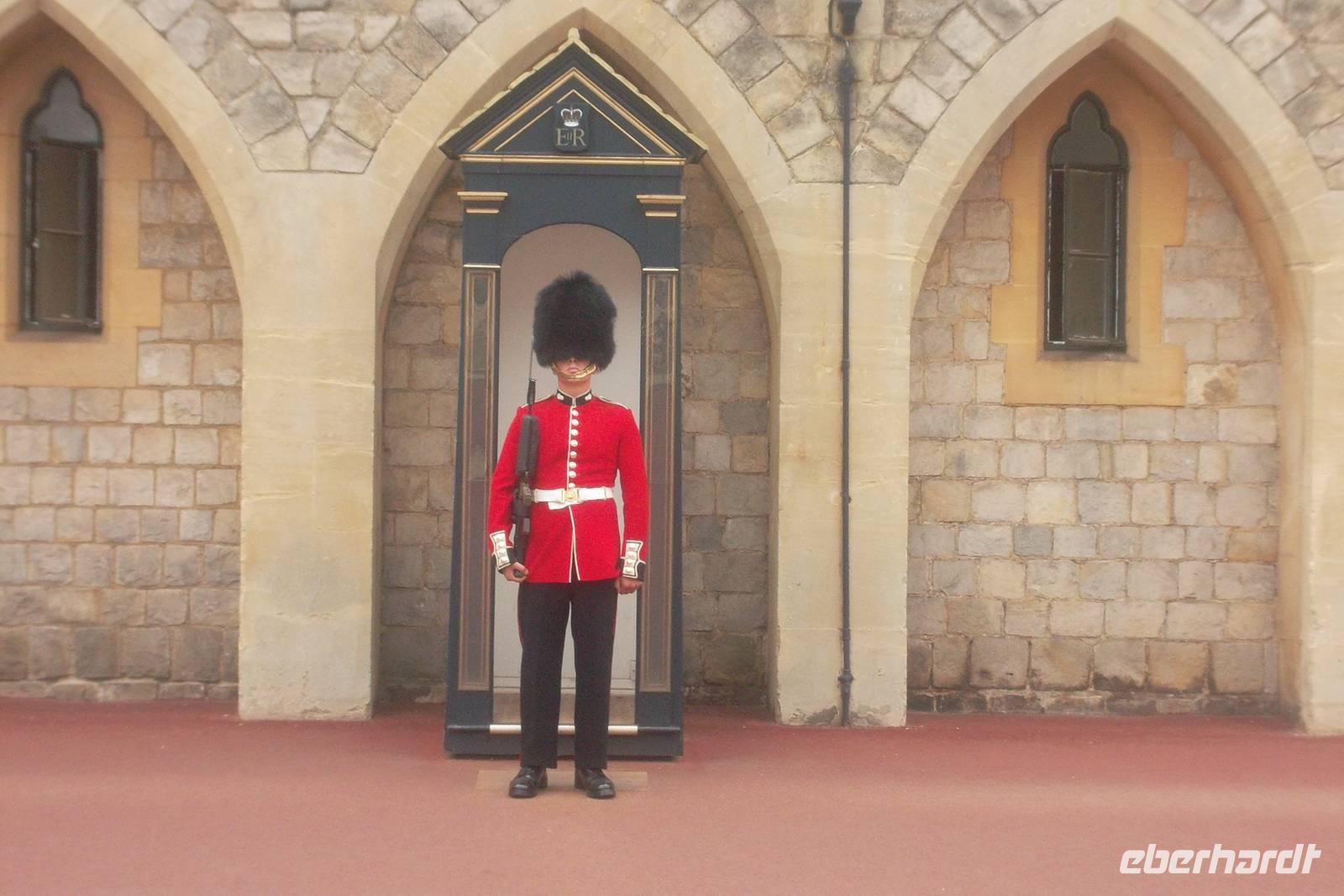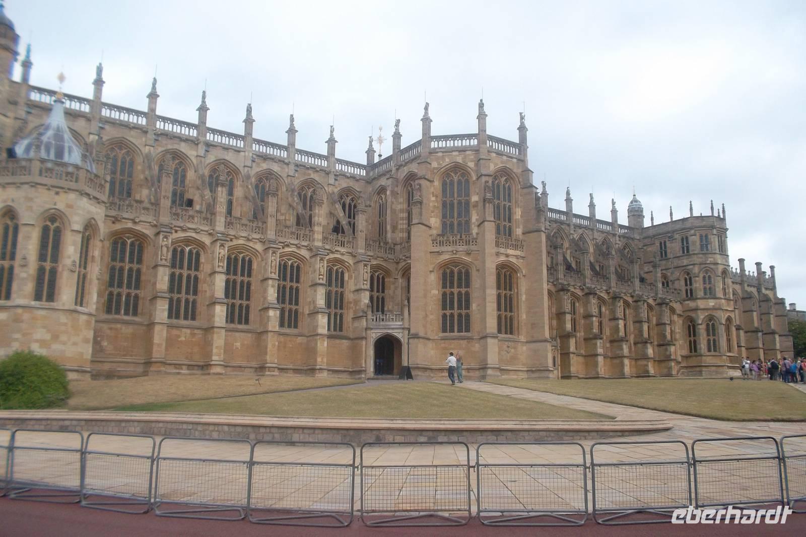 Am bekanntesten von Windsor ist das Schloß, neben dem die winzige Altstadt fast puppenhaft wirkt. Nach kurzem Anstellen passierten wir mit der Gruppe die Sicherheitskontrollen, die wie sonst nur an Flughäfen gestaltet sind und gelangten in die Königsburg. Hier sahen wir uns zunächst die Außenwerke und den als „Motte" erbauten gewaltigen Round Tower an, Von dieser ehemaligen Kernburg gibt es viele Möglichkeiten, um die Besonderheiten von Windsor zu erkunden. Es gibt den Palast mit den Ausstellungsräumen der Staatsgemächer, das Königliche Puppenhaus und nicht zuletzt die Königliche Gemäldesammlung. Auch die reichverzierte Georgskapelle ist einen Besuch wert.