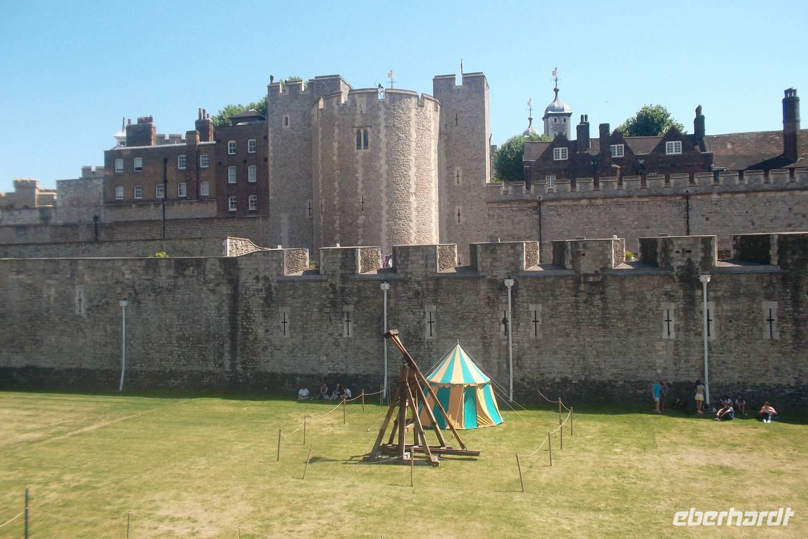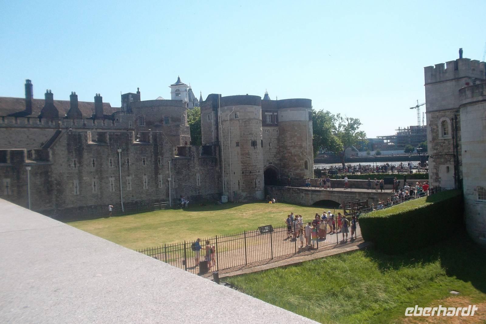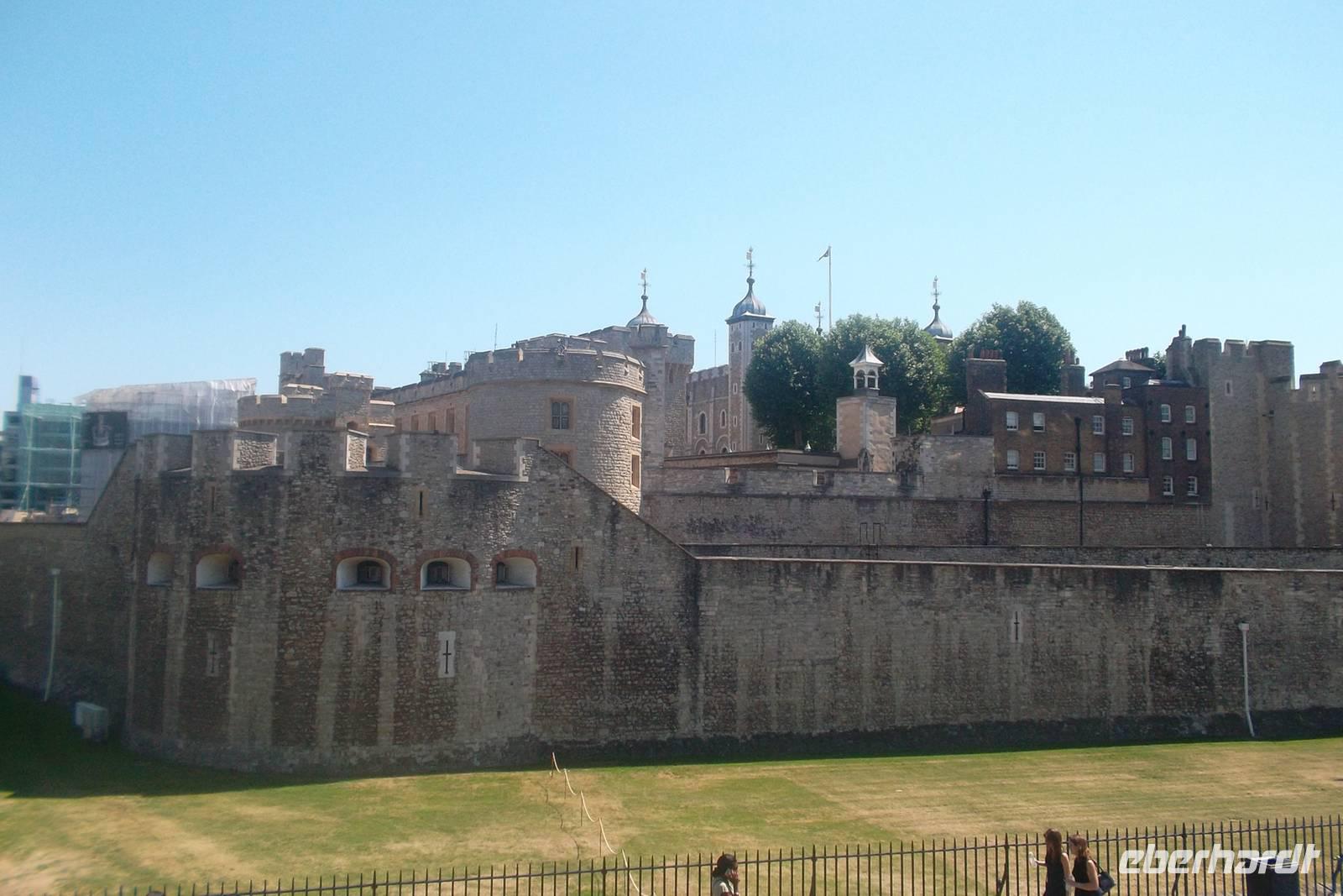 Am bekanntesten von Windsor ist das Schloß, neben dem die winzige Altstadt fast puppenhaft wirkt. Nach kurzem Anstellen passierten wir mit der Gruppe die Sicherheitskontrollen, die wie sonst nur an Flughäfen gestaltet sind und gelangten in die Königsburg. Hier sahen wir uns zunächst die Außenwerke und den als „Motte" erbauten gewaltigen Round Tower an, Von dieser ehemaligen Kernburg gibt es viele Möglichkeiten, um die Besonderheiten von Windsor zu erkunden. Es gibt den Palast mit den Ausstellungsräumen der Staatsgemächer, das Königliche Puppenhaus und nicht zuletzt die Königliche Gemäldesammlung. Auch die reichverzierte Georgskapelle ist einen Besuch wert.