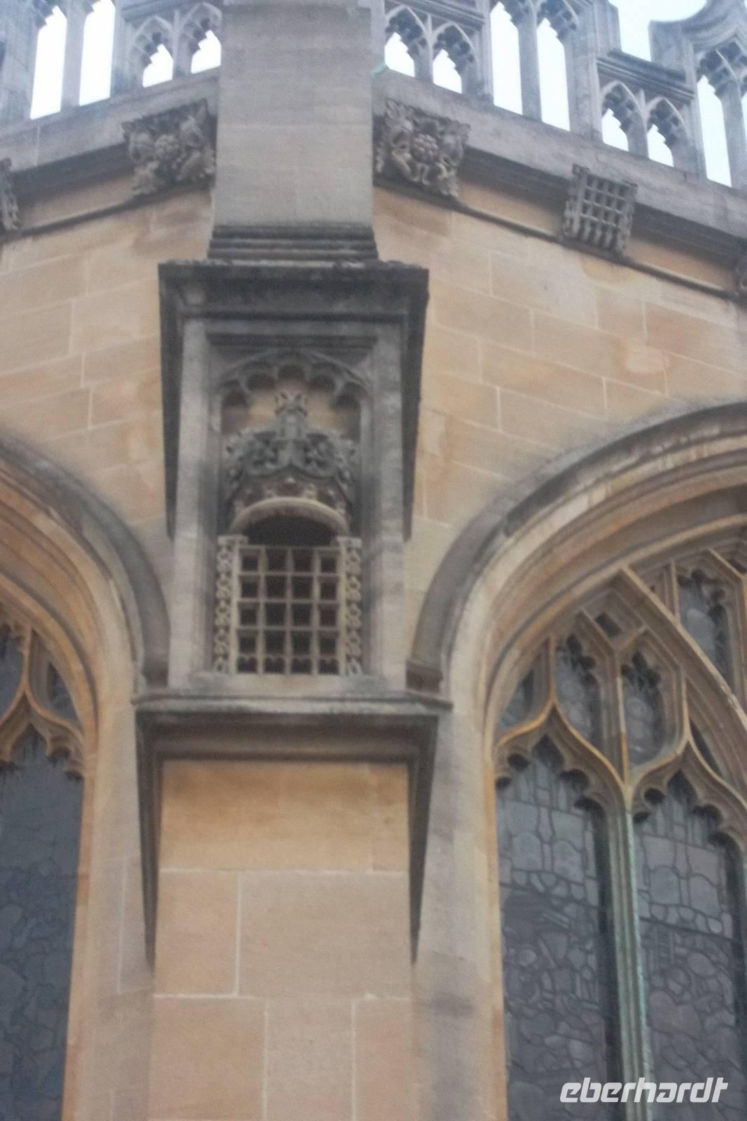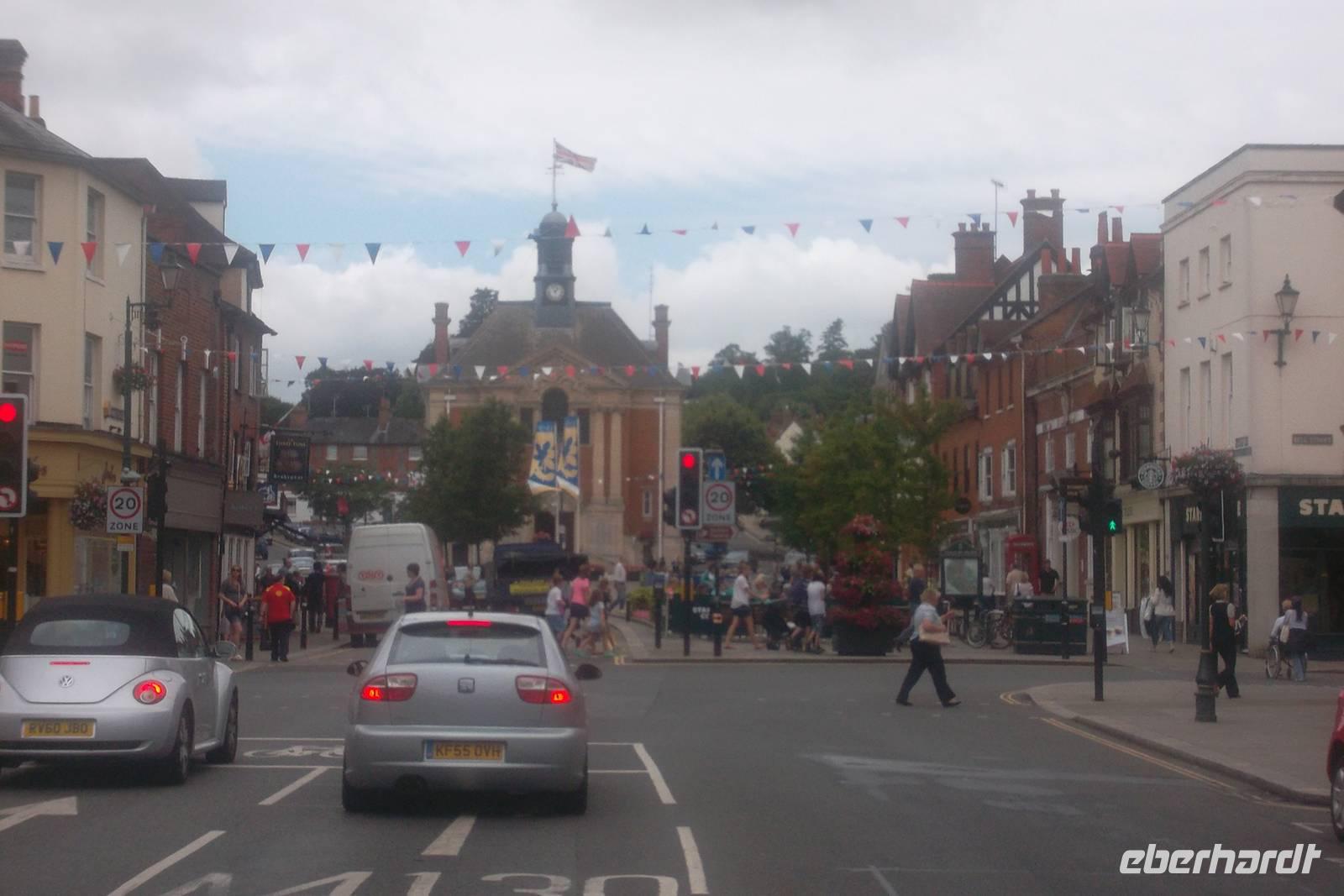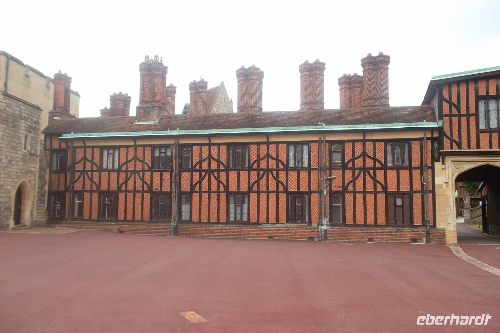 Nicht allzuweit war es heut nach Windsor. Etwa eine halbe Stunde vor Öffnung der Burg erreichten wir den Ort, wo wir zunächst den viktorianischen Bahnhof anschauen konnten. Dann gingen wir noch kurz durch die winzige Altstadt: Neben dem Schloss gelegen breiten sich zwei winzige Straßen mit dem berühmten Pub aus, in dem William Shakespeare seine „Lustigen Weiber von Windsor" geschrieben haben soll, und es findet sich die „Guildhall", das von Christopher Wren, dem Urheber der St.Pauls-Kathedrale errichtete Rathaus, Daneben gibt es mit dem „old crooked house" das vielleicht schiefste Bauwerk Englands.