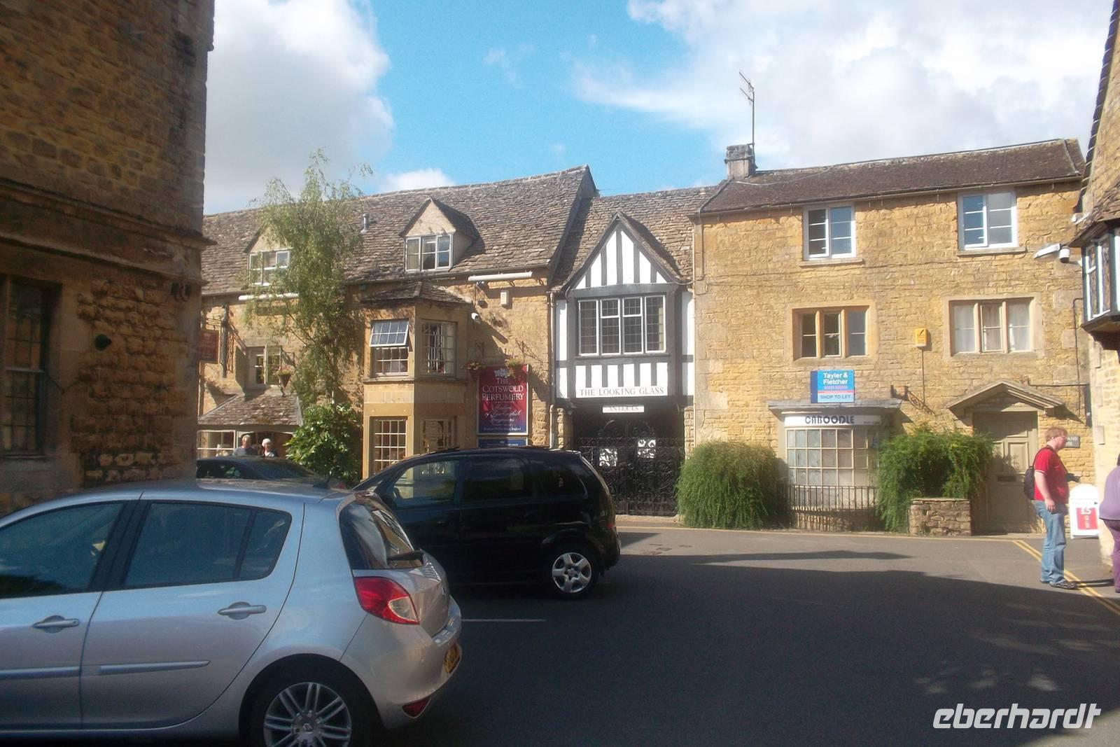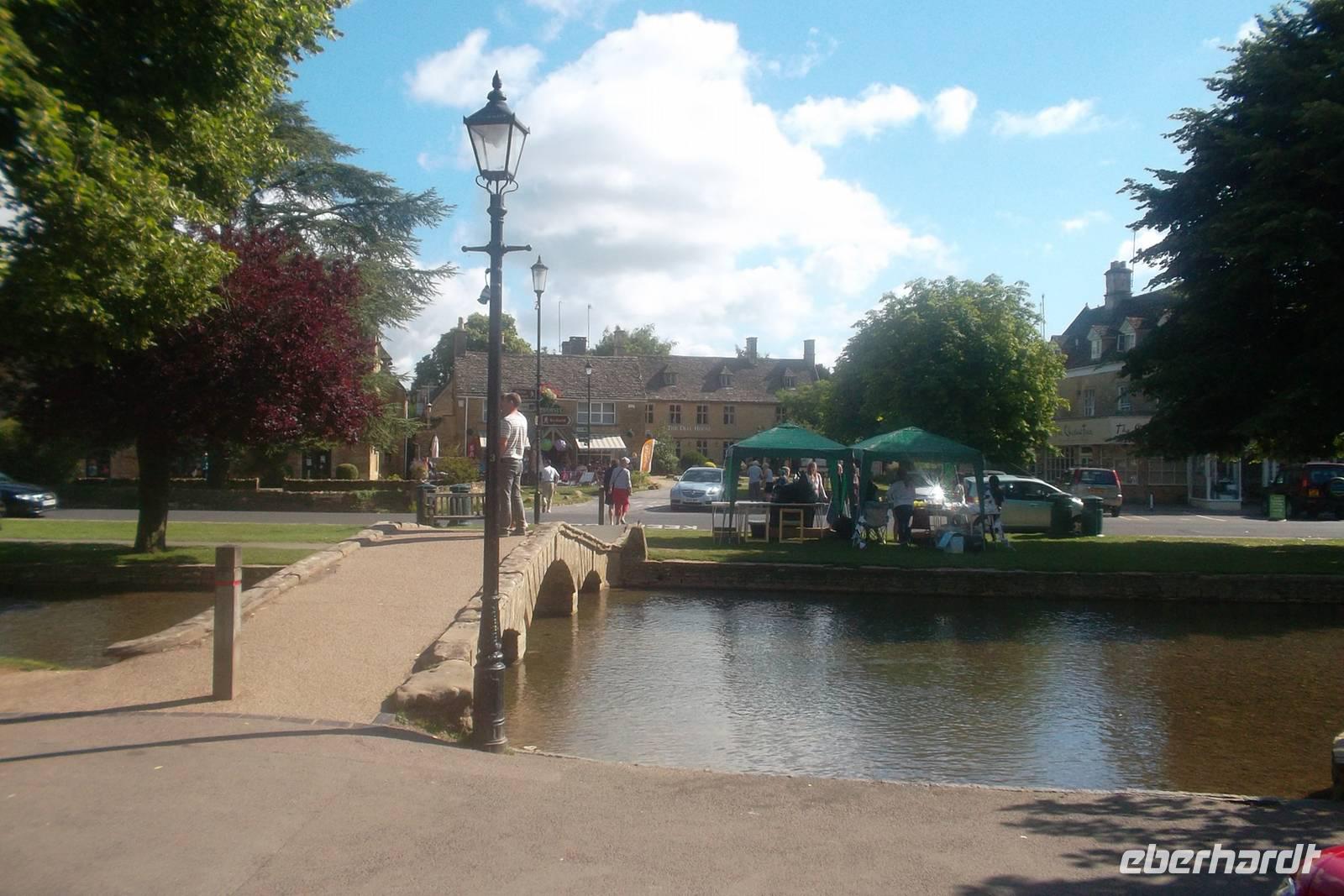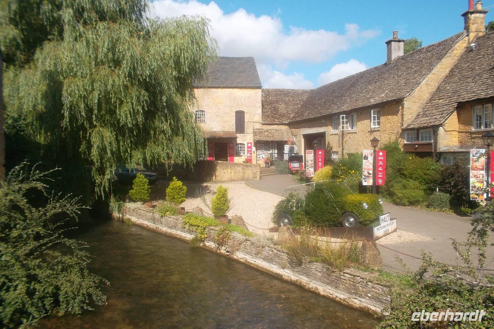 Iim Sinne der Eberhardt-Philosophie „Richtig Reisen" konnten wir ein kleines Reise-Extra einbauen und fuhren bei schönem Wetter - durch die Cotswolds. Das Naherholungsgebiet ist in England sehr beliebt: eine Hügelkette mit intensiver Schafzucht und Wollproduktion. Das hat schon im Mittelalter dem Landstrich gediegenen Reichtum beschert, den man in den schmucken Dörfern und Marktstädtchen in honiggelbem einheimischem Sandstein -Oolith - ablesen kann. Über Moreton-in-Marsh fuhren wir weiter zum Aufenthalt in Burton-on-the-Water. Hier gibt es noch das traditionelle Leben und den in England üblichen Samstag-Ansturm der Ausflügler