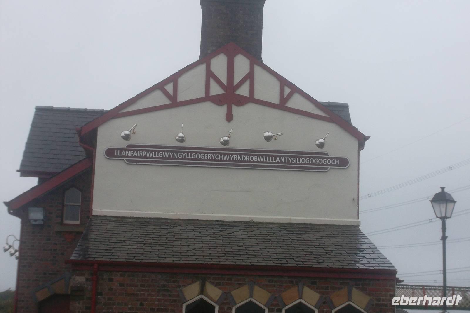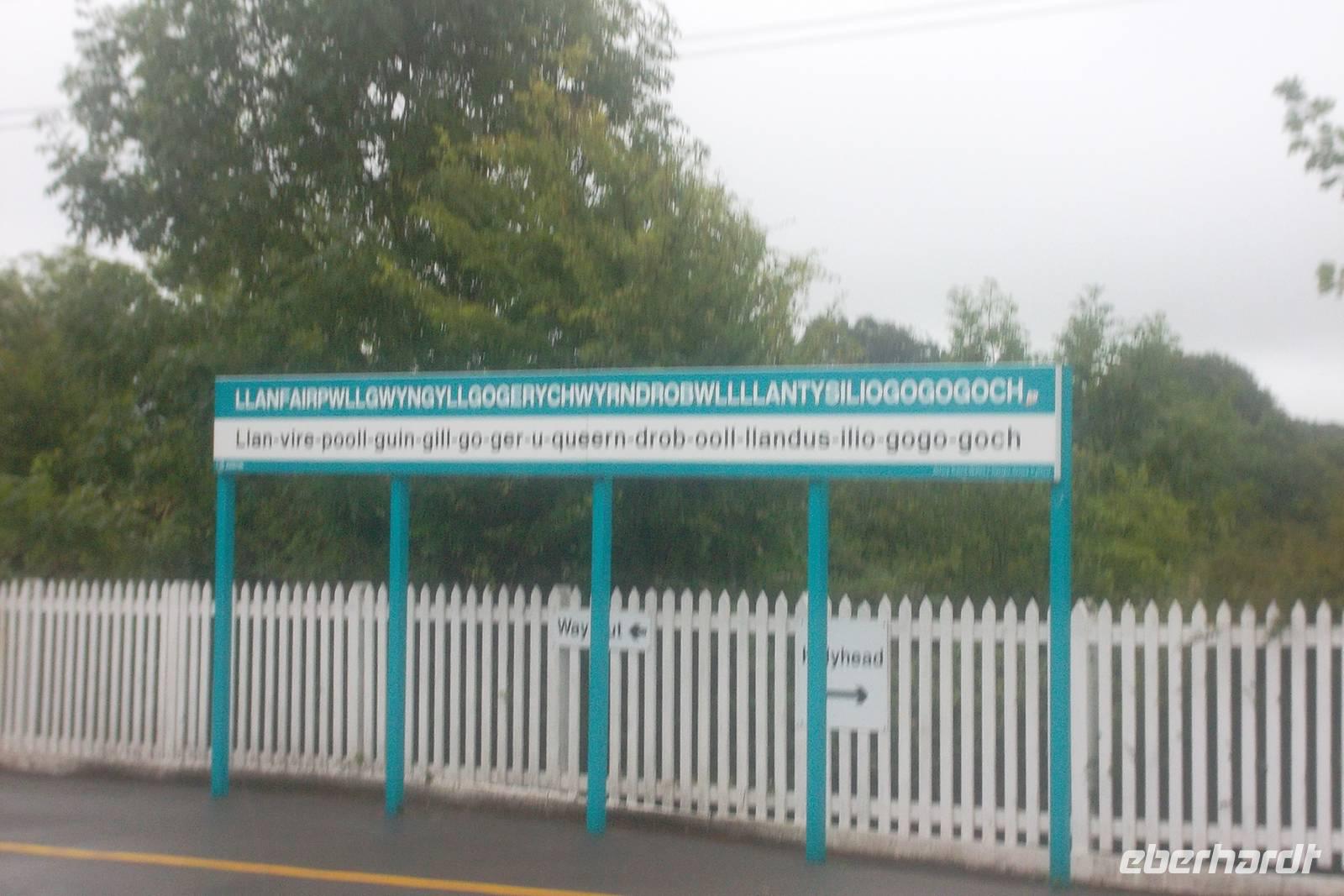 Heute fuhren wir nicht als erstes zum ausgeschriebenen Ziel Caernarfon, sondern machten einen „RichtigReisen"-Abstecher Auf der historischen Brücke überquerten wir die malerische Meerenge Menai-Strait und reisten auf Großbritannens zweitgrößte Insel Anglesey. Die Überquerung vom walisischen Festland war ursprünglich im 19. Jahrhundert eine Brücke von Ingenieur Telfort die in den 50er Jahren des 20. Jahrhunderts von der neuen Britannia-Bridge ersetzt wurde. Nach dieser Brücke folgte ein Stopp im vielleicht ungewöhnlichsten Ort des Vereinigten Königreiches: Llanfair PG auf Anglesey ist der Ort mit dem längsten Ortsnamen Europas. Man kann diesen am Besucherzentrum, aber auch an der Eisenbahnstation fotografieren: nirgendwo hat ein Ortsname mehr Buchstaben und ist schwerer auszusprechen: Llanfairpwllgwyngyllgogerychwyrndrobwllllantysiliogogogoch.
