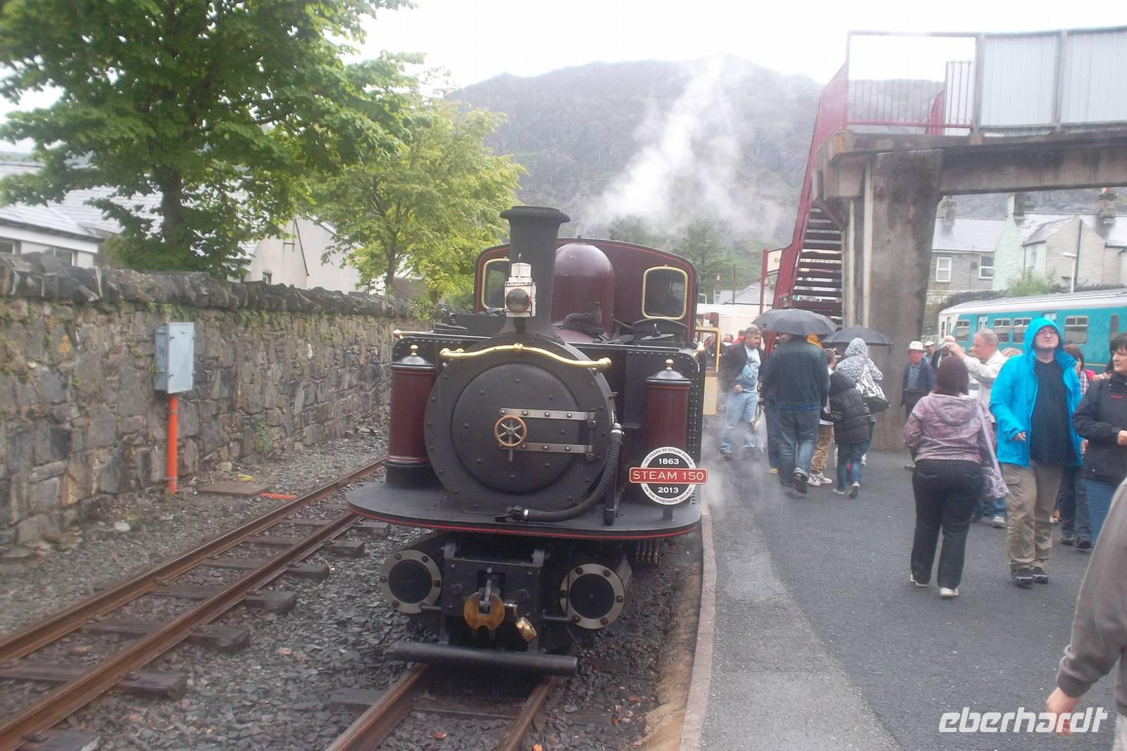 Die bezaubernde Berglandschaft von Snowdonia konnten wir aufgrund des schlechten Wetters diesmal weniger genießen - zwar fuhren wir durch die nach dem höchsten walisischen Berg Snowdon benannten Gebiete hindurch, aber Regen und tiefhängende Wolken ließen nicht zuviel „Landschaftsblick" zu. Wir erreichten pünktlich das Hafenstädtchen Portmadog, von dessen Bahnhof wir im historischen Dampfzug in die Bergbaustadt Blaenau Ffestiniog reisten. Die Lokomotiven sind Eigenbauten der zur „Ffestiniog Railway" gehörenden Reparaturwerkstatt und transportierten ursprünglich Schiefer, auch bekannt als das „schwarze Gold von Wales" aus den Schieferbrüchen des Tals von Blaenau zur Verschiffung in den Hafen. Als Touristenattraktion dampfen die Züge heute noch durch die wundervolle walisische Landschaft. Nur ein paar Teile von dieserr konnten wir sehen, denn auch während der Zugfahrt regnete es. Nach anderthalbstündiger Zugfahrt stiegen wir wieder in unseren Bus und hatten bald danach eine Pause im Wanderort Bews-y-Coed. Hier, wo drei Täler aufeinandertreffen, wurde der Ort zur beliebten Sommerfrische und zum Ausgangspunkt vieler Ausflüge. Hier sind die Souvenirläden die bestsortierten in Wales - z.B, gibt es hier die traditionellen Liebeslöffel. In alter Tradition haben früher verliebte Waliser ihrer Angebeteten einen Holzlöffel geschnitzt und ihr damit Botschaften übermittelt. Vielleicht sind diese Löffel bis heute das authentischste und besonderste Souvenir aus Wales..