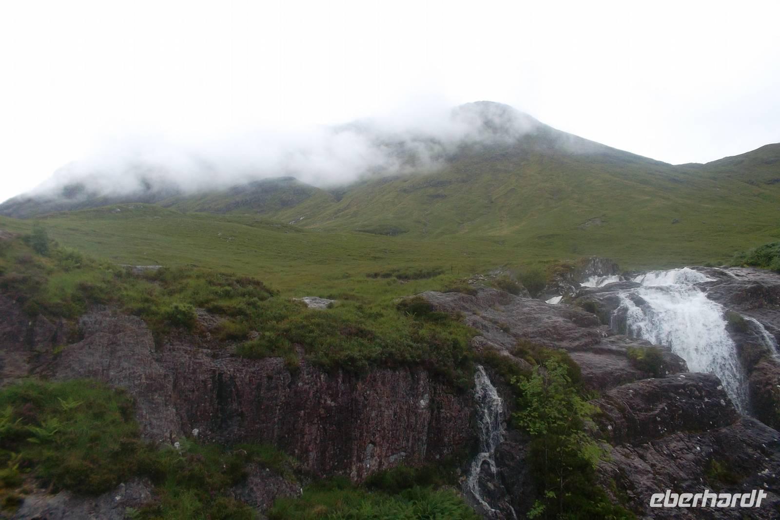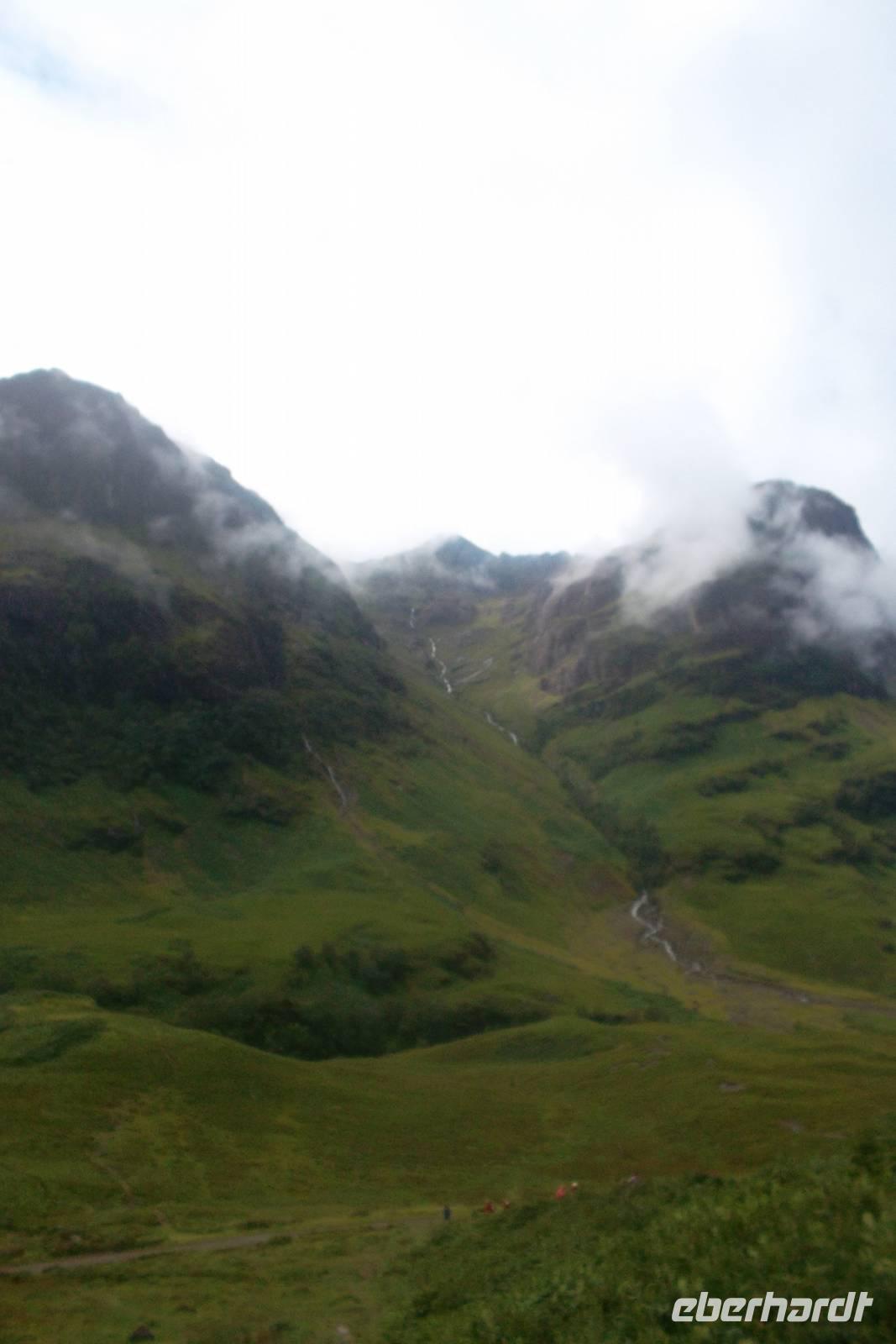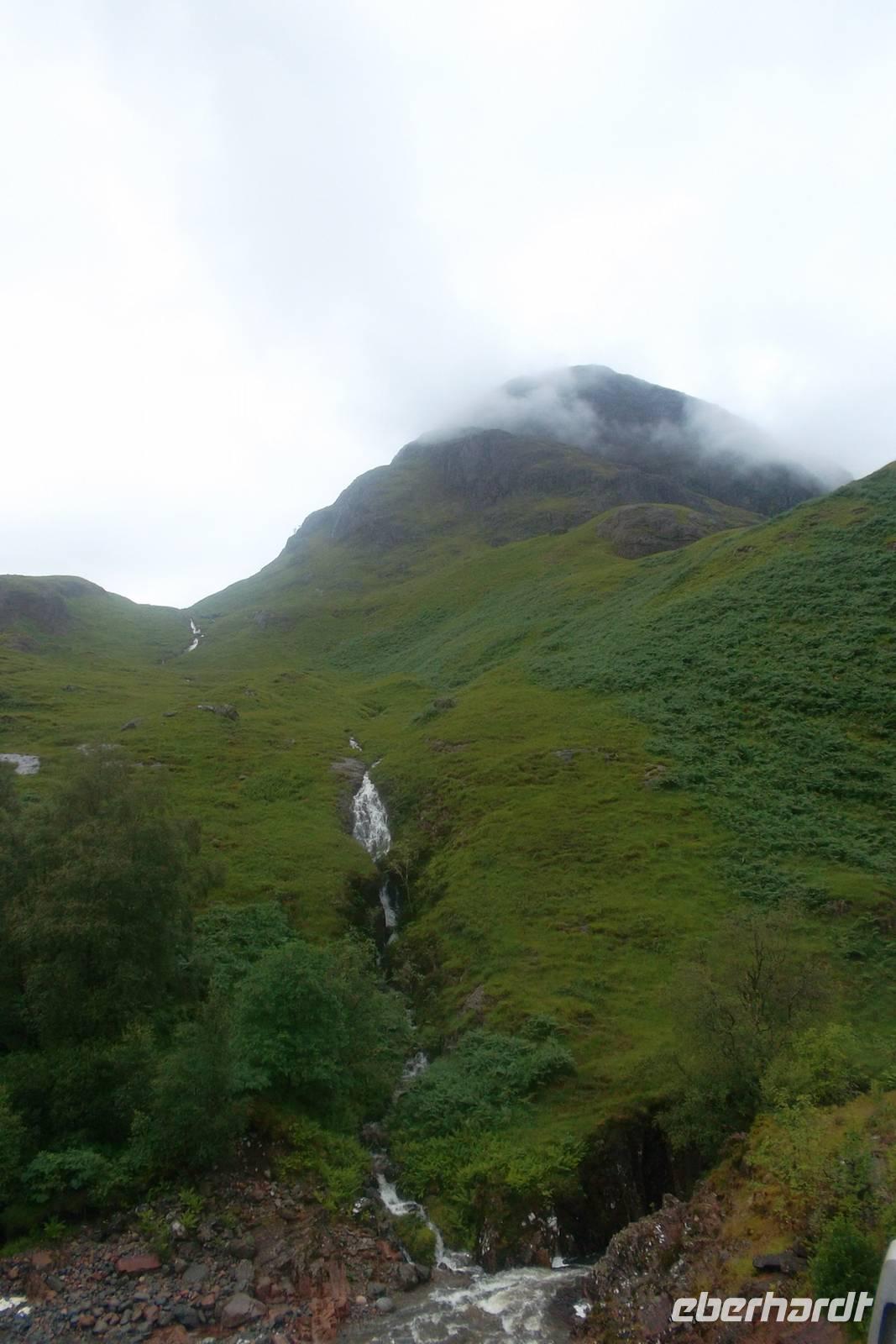 Der heutige Tag, der mit einem Besuch am herrlichen See Loch Lomond begann, würde recht lang werden. Die Witterung war zunächst äußerst schottisch: bei strömendem Regen macht nicht einmal Loch Lomond mit seinen kleinen Inseln jedem Reisenden Spaß. Mit einer Fläche von etwa 71 km² erstreckt sich der größte See Schottlands fast 40 Kilometer in die Länge und ist zwischen einem und acht Kilometern breit. Seine beachtliche Tiefe reicht bis 190 m - ist er immerhin halb so tief wie das sagenumwobene Loch Ness. Natürlich hörten wir auch das berühmte Lied vom Loch Lomond und versuchten dann, weiter nördlich besseres Wetter zu finden. Tatsächlich passierten wir noch das nordwärts vom See führende Tal, die Grenze zwischen Lowlands und Highlands, bei immer noch schlechtem Wetter, aber dann kamen - nach einem verregneten Blick ins Tal die ersten richtigen herrlichen Highland-Eindrücke im Tal von Glencoe. Es klarte auf, blauer Himmel war streifenweise zu sehen und die gewaltigen Berge, die mitunter noch die ursprünglichen Formen der Vulkankegel, zeigten, waren entweder ganz oder zumindest „fast ganz" mit Wolken- und Nebelfetzen zu sehen. Dazwischen fuhren wir durch gerundete Trogtäler mit ihrem spärlichem Waldbewuchs und den Zwischenetappen aus Moos und Heidekraut, folgten bewachsenen Hängen und Talsohlen und hatten auch Gelegenheit, einen hübschen Wasserfall zu fotografieren. Glencoe, immer wieder durch Bäche und Rinnsale unterbrochen, steht auch für eines der tragischsten Ereignisse aus der schottischen Geschichte. Natürlich konnte ich meinen Gästen diese Fakten über das landschaftlich herrliche, kaum zu beschreibende Tal nicht vorenthalten: Im Februar 1693 war hier der Schauplatz eines am schottischen McDonald-Clan verübten Massakers, im Auftrag des englischen Königs und ausgeführt von im Dienste der englischen Krone stehenden Soldaten. Wir hörten uns das bekannte Lied „the massacre of Glencoe" über die CD-Bordanlage an und machten natürlich, bei nun immer besser werdendem Wetter, schöne Fotostopps.