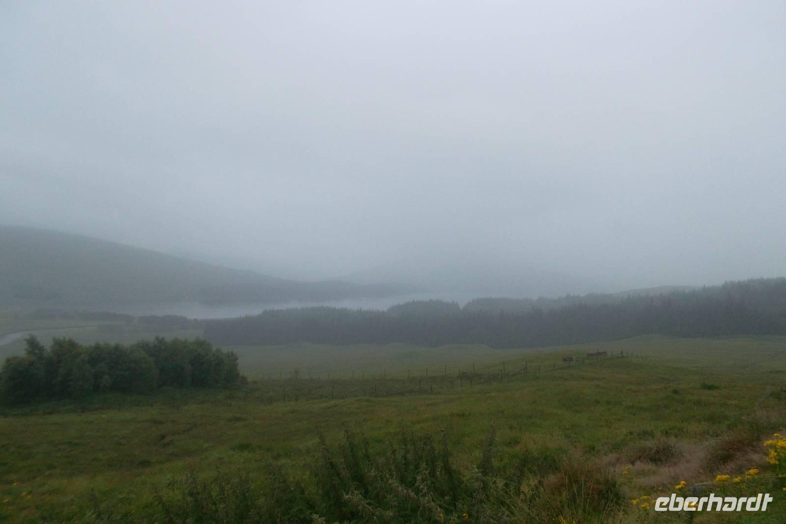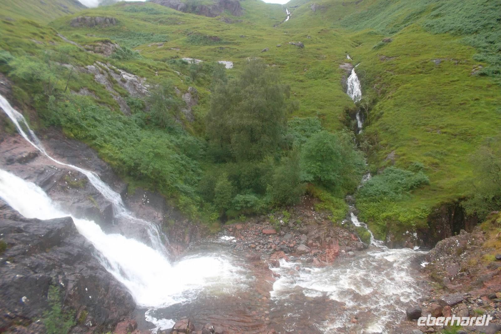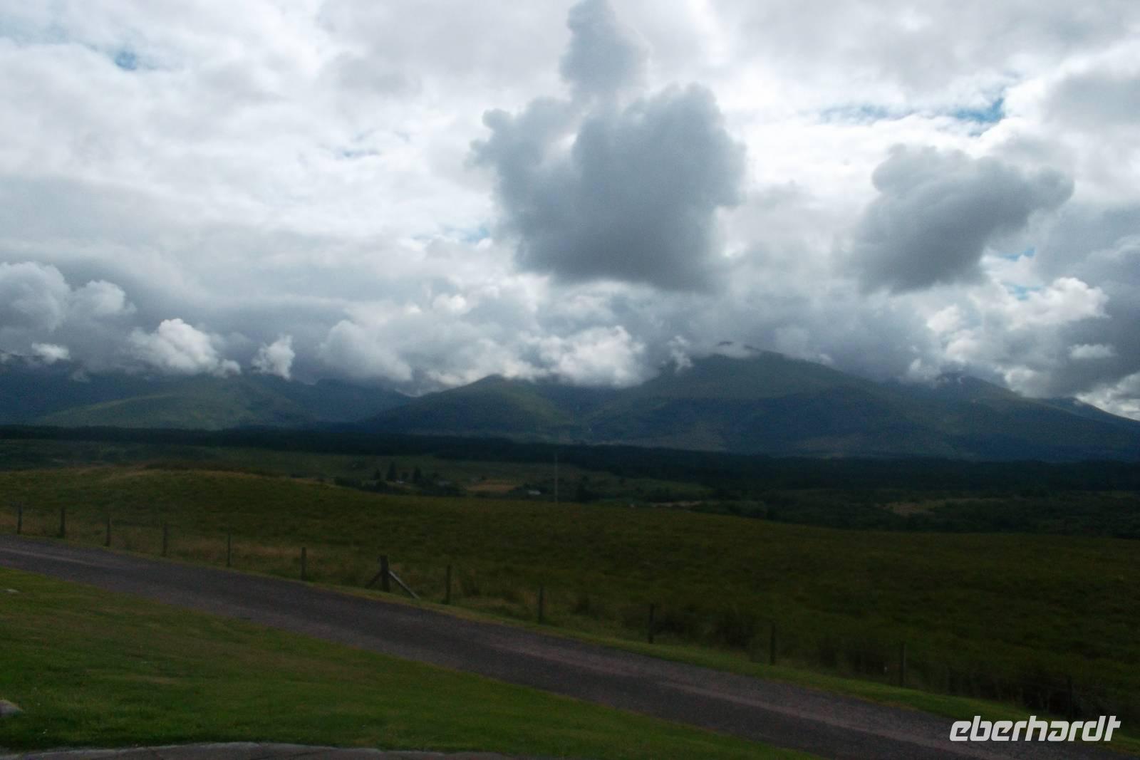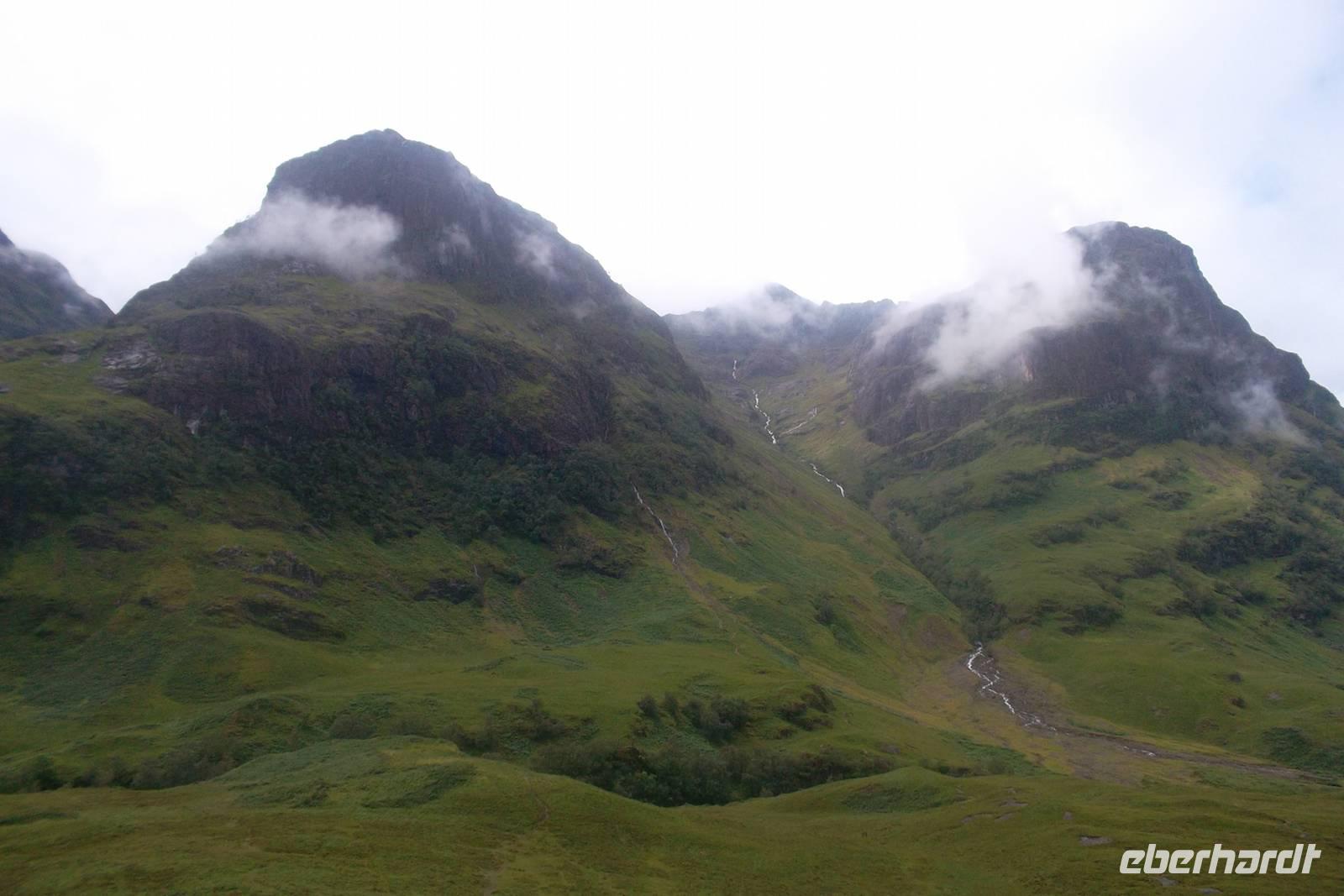 Der heutige Tag, der mit einem Besuch am herrlichen See Loch Lomond begann, würde recht lang werden. Die Witterung war zunächst äußerst schottisch: bei strömendem Regen macht nicht einmal Loch Lomond mit seinen kleinen Inseln jedem Reisenden Spaß. Mit einer Fläche von etwa 71 km² erstreckt sich der größte See Schottlands fast 40 Kilometer in die Länge und ist zwischen einem und acht Kilometern breit. Seine beachtliche Tiefe reicht bis 190 m - ist er immerhin halb so tief wie das sagenumwobene Loch Ness. Natürlich hörten wir auch das berühmte Lied vom Loch Lomond und versuchten dann, weiter nördlich besseres Wetter zu finden. Tatsächlich passierten wir noch das nordwärts vom See führende Tal, die Grenze zwischen Lowlands und Highlands, bei immer noch schlechtem Wetter, aber dann kamen - nach einem verregneten Blick ins Tal die ersten richtigen herrlichen Highland-Eindrücke im Tal von Glencoe. Es klarte auf, blauer Himmel war streifenweise zu sehen und die gewaltigen Berge, die mitunter noch die ursprünglichen Formen der Vulkankegel, zeigten, waren entweder ganz oder zumindest „fast ganz" mit Wolken- und Nebelfetzen zu sehen. Dazwischen fuhren wir durch gerundete Trogtäler mit ihrem spärlichem Waldbewuchs und den Zwischenetappen aus Moos und Heidekraut, folgten bewachsenen Hängen und Talsohlen und hatten auch Gelegenheit, einen hübschen Wasserfall zu fotografieren. Glencoe, immer wieder durch Bäche und Rinnsale unterbrochen, steht auch für eines der tragischsten Ereignisse aus der schottischen Geschichte. Natürlich konnte ich meinen Gästen diese Fakten über das landschaftlich herrliche, kaum zu beschreibende Tal nicht vorenthalten: Im Februar 1693 war hier der Schauplatz eines am schottischen McDonald-Clan verübten Massakers, im Auftrag des englischen Königs und ausgeführt von im Dienste der englischen Krone stehenden Soldaten. Wir hörten uns das bekannte Lied „the massacre of Glencoe" über die CD-Bordanlage an und machten natürlich, bei nun immer besser werdendem Wetter, schöne Fotostopps.