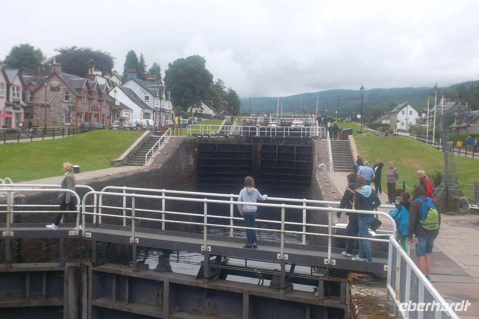 Später hatten wir in Fort Augustus Gelegenheit, eine von „Neptunes staircases" zu besichten, eine „Neptuns Treppenhaus" genannte Schleusentreppe. Hier in Fort Augustus geht es um eine Abfolge von fünf direkt hintereinander liegenden Schleusen. Auf einer Gesamtlänge von 200 m überwinden sie per Ausgleich ihrer Wasserstände einen insgesamten Höhenunterschied von immerhin 17 m. Diese Schleusentreppe gehört mit mehreren anderen Ablagen zum „Kaledonischen Kanal", den schon Theodor Fontane als „seltenes Wunderwerk der Technik" gefeiert hatte, der aber heute nur noch von Freizeitkapitänen genutzt wird..