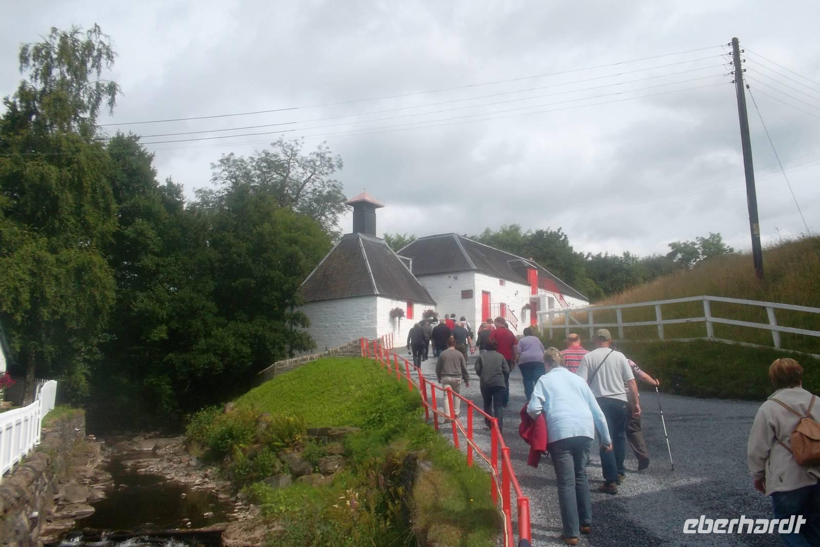 Auf der weiteren Fahrt erlebten wir dann die Edradour Distillery, die kleinste Whiskybrennerei Schottlands. Sie hat nur einen kleinen Produktionsumfang und nur wenige Beschäftigte, gehört aber zu den erlesensten Whisky-Produzenten, deren Prdukte gerade wegen ihrer Seltenheit begehrt und teuer sind. Die Herstellung von „uisghe beatha", „Lebenswasser" enthält Malzen, Stoppen des Vorganges über Torfrauch, Herstellen und schließlich Destillieren eines Gerstenbieres. - das in verschiedenen Methoden des Whiskybrennens und per Fass-Lagerung letztlich den unverkennbaren torfigen Geschmack eines „Single Malt Scotch Whisky" erhält.