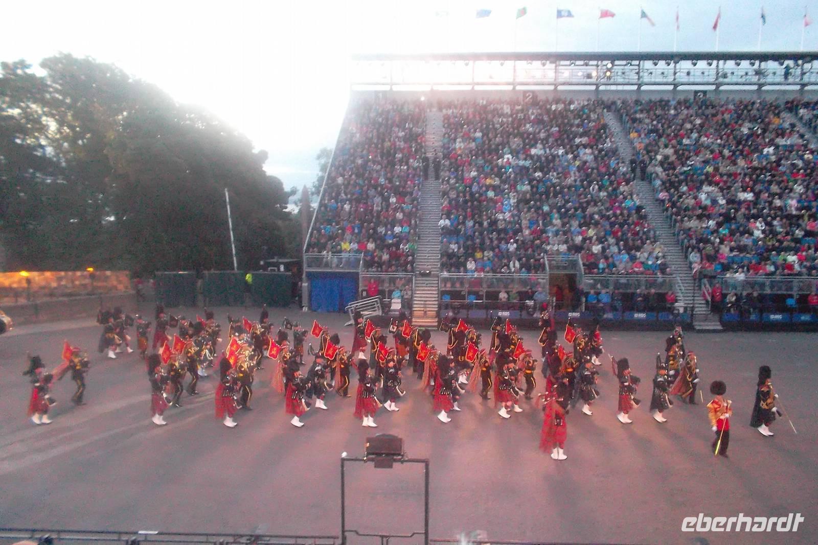 Das Military Tattoo am Abend, eigentlich eine holländische Bezeichnung, mit der man früher - „tap toe" (Zapfhahn zu) - bei den Kasernen jeglichen Ausschank beendete, war dann der echte Tageshöhepunkt. Dieses bunte Militärfestival hat in Schottland mit Dutzenden Dudelsäcken, bunt kostümierten Militärkapellen und den besonderen Darbietungen von Gästen aus aller Welt eine besondere Tradition. Immer neue interessante Showeinlagen mit hunderten Mitwirkenden ließen die Gäste des Taatoos nicht aus dem Stauen herauskommen und alle unsere Mitreisenden waren von der umgebenden Atmosphäre der Burg von Edinburgh und den Einlagen des Tattoo restlos begeistert.