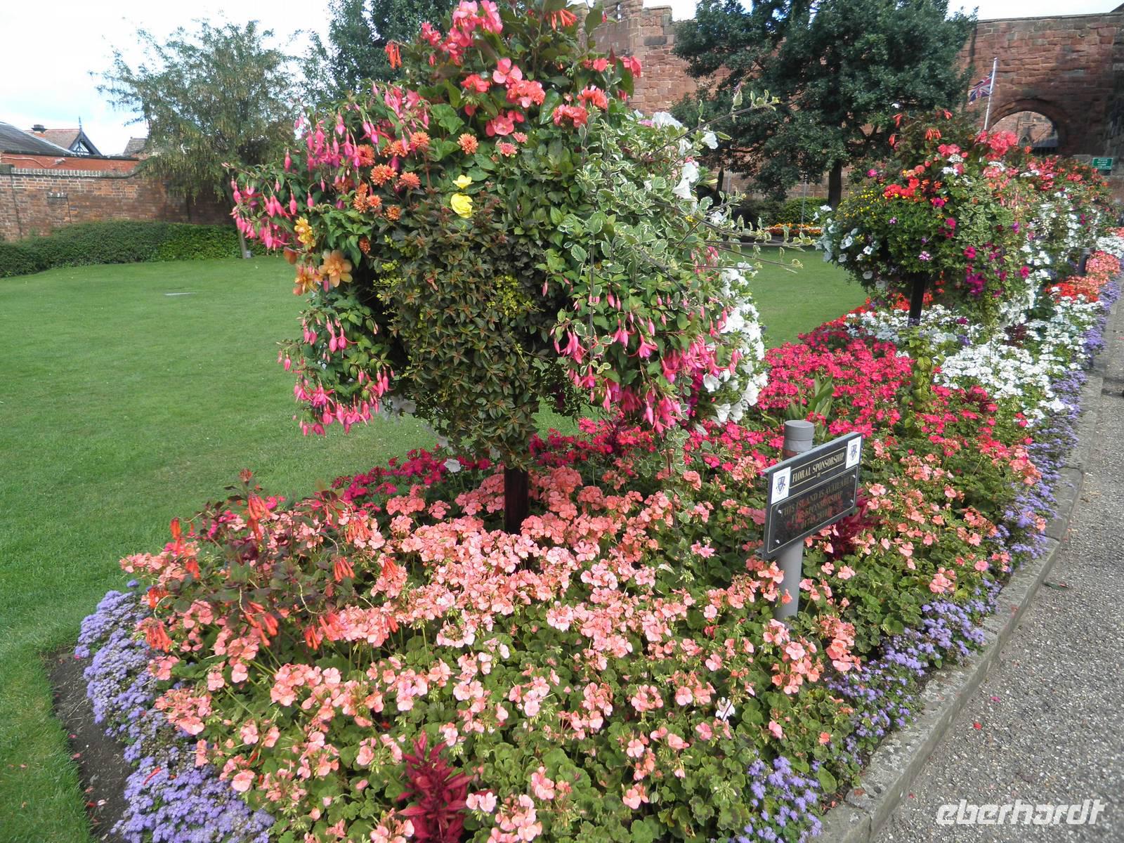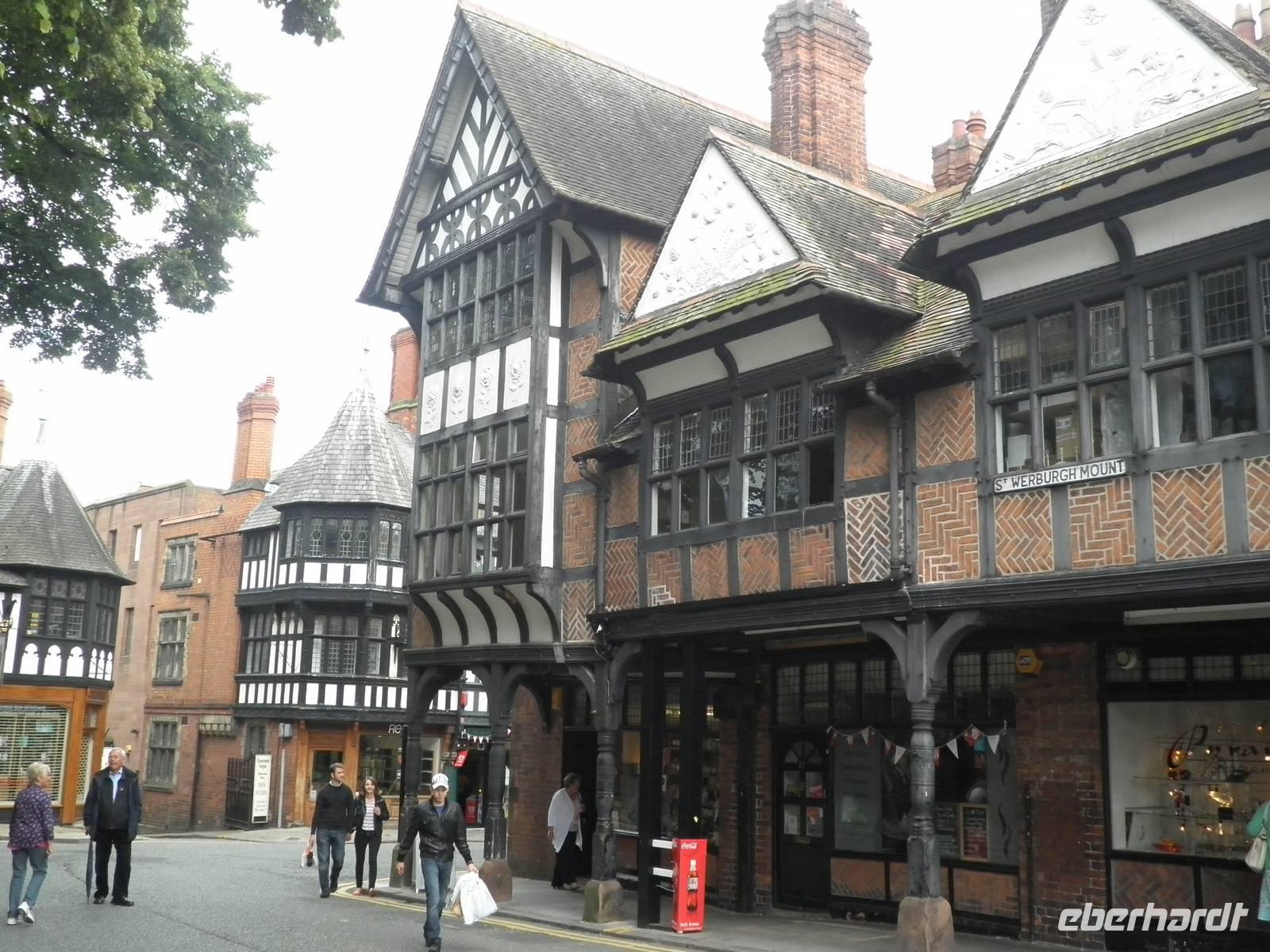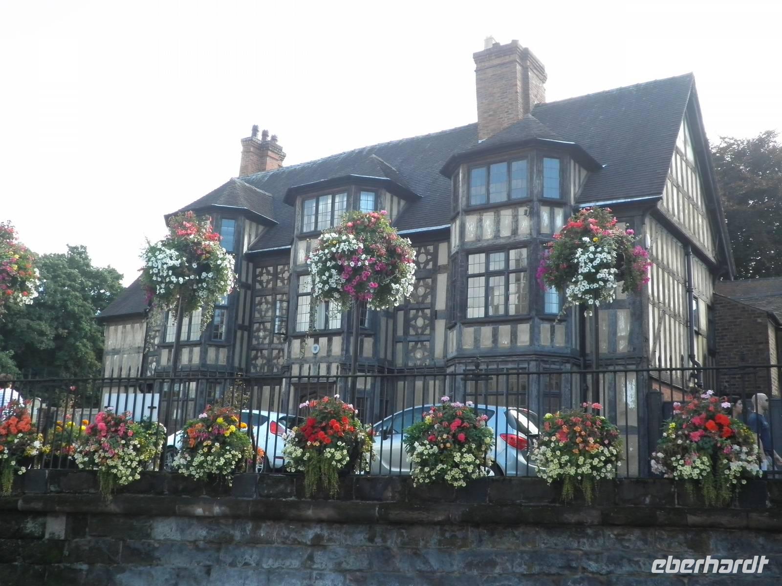 Die erste Sehenswürdigkeit des Tages führte uns nach Ironbridge, einem kleinen Ort, der nach seiner Hauptattraktion, einer eisernen Brücke, benannt worden ist. Die gleichnamige Brücke erinnert an die industrielle Revolution und die Anfänge der Architektur mit Eisen, denn sie ist die erste Eisenbrücke der Welt. Das Bauwerk wird ständig gewartet, um korrodierte Stellen zu beheben. So macht die Brücke auch heute einen soliden Eindruck, so dass man gern darüber hinweg spaziert und den Fluss Severn unter sich dahinströmen sieht. Weiter ging's nach Shrewsbury, einer Stadt mit vielen Fachwerkhäusern, wunderschönen Blumenarrangements, einem Castle und darüber hinaus ist sie die Geburtsstadt Charles Darwins. Hier bot sich ein kleiner Spaziergang durch die Altstadt an. Wir gingen bis zum Castle und zur Bibliothek, vor der Charles Darwins Statue auf einem Sockel sitzt und in einer Zeitung blättert. In Anschluss fuhren wir nach Chester, wo unsere Gruppe von zwei Stadtführern abgeholt wurde. Bei einem Spaziergang durch Chester zeigten und erklärten sie uns auf amüsante Weise diese herrliche Stadt. Wir hörten Anekdoten aus Chesters Vergangenheit und Gegenwart. Einer der Höhepunkte dieses Tages war ein landestypischer Besuch in einem traditionellen Tearoom, wir probierten englischen Tee mit Scones (leckeres Gebäck), clotted cream (Schlagrahm), Erdbeermarmelade und englischen Tee. Nach dem Stadtrundgang und der Teestunde fuhren wir in unser Hotel in Mold und genossen ein leckeres Abendessen.