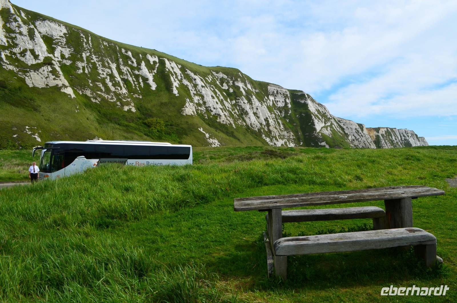 Schönes, aber kühles Wetter ließ uns eine ruhige und interessante Überfahrt nach Dover erwarten. Schon vom Festland aus konnten wir deutlich die Kreidefelsen an der englischen Küste erkennen. Nach dem Frühstück fahren wir zuerst in das sehenswerte Zentrum von Calais, vorbei am Theater zum Rathaus, wo wir einen Fotostopp machten, bevor es dann weiter zum Fährhafen ging. Das Schiff von P&O Ferrys legte pünktlich ab und brachte uns über den dichtbefahrenen Ärmelkanal sicher nach Dover. Hier ging es zuerst einmal um das Castle herum und zum kleinen Landschafts-biotop Samphire Hoe, mit schönem Blick auf die Kreideküste. Danach erst fuhren wir auf der Autobahn M2 Richtung London, vorbei an Canterbury und Leeds Castle nach Greenwich, wo wir am Greenwich Park unser Mittag machten. Anschließend spazierten wir gemeinsam durch den Haupteingang die Hauptallee entlang zum Royal Observatory und zum Flamsteed House. Wir besichtigten den mit einer Eisenschiene gekennzeichneten Nullmeridian im Hof. An dessen Verlängerung etwas unterhalb, wurden die Erinnerungsfotos geschossen und vom nahen Aussichtspunkt rechts daneben genossen wir den ersten, sehr schönen Blick auf die Londoner City. Danach führte uns die Reise von Greenwich durch den Blackwell-Tunnel in die Londoner Innenstadt, wo uns Heike Forde zur Stadtrundfahrt erwartete. Mit Stopps an der St. Pauls Cathedral und Vorbeifahrten an allen großen Sehenswürdigkeiten der Stadt, erfuhren wir eine Menge über die Struktur, die Gebäude und das Leben in der Hauptstadt Großbritanniens.
