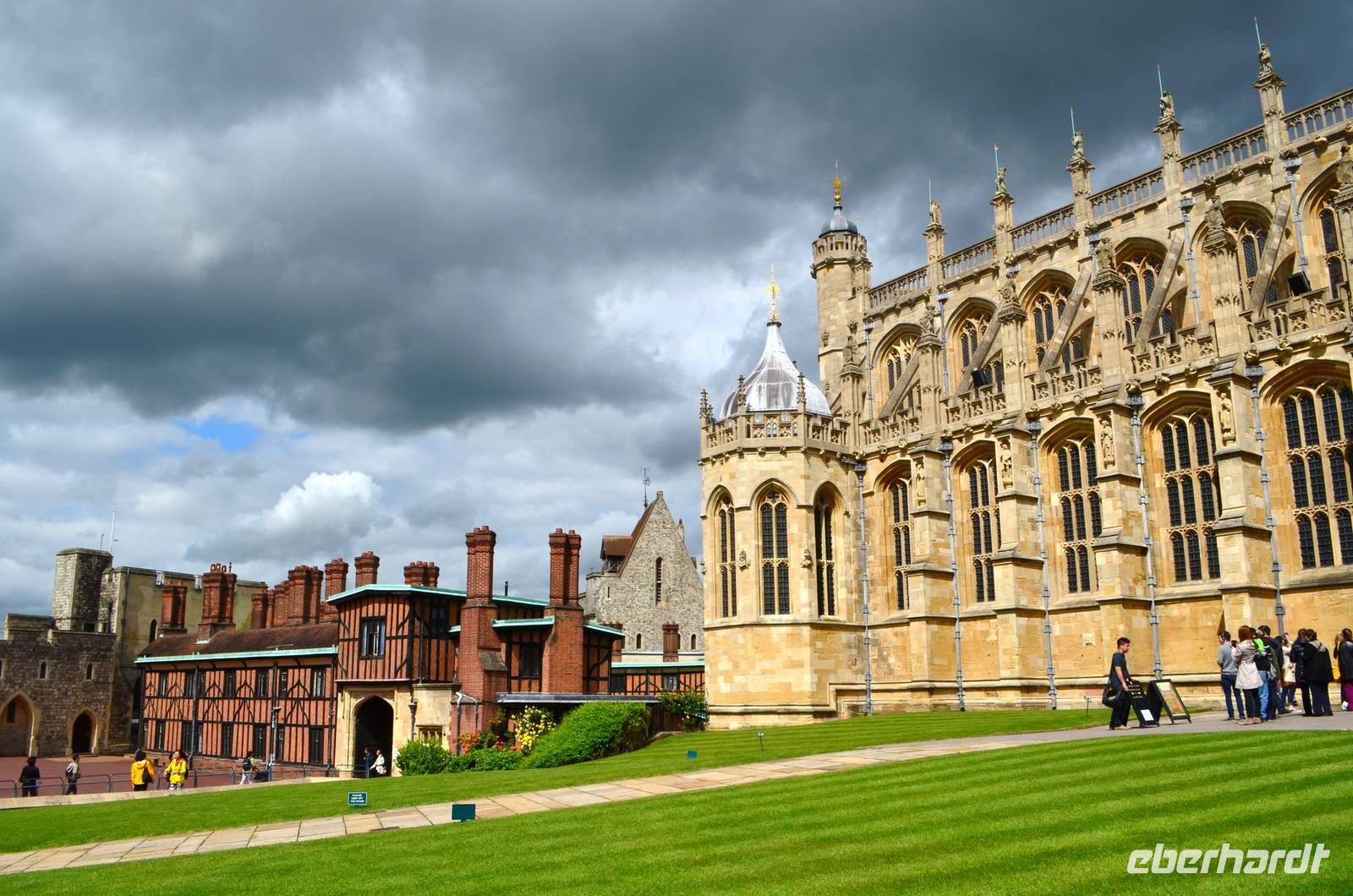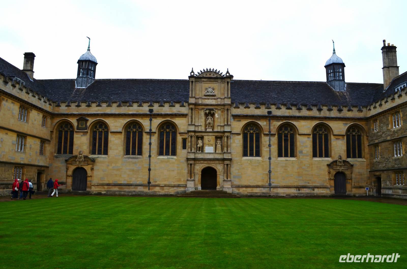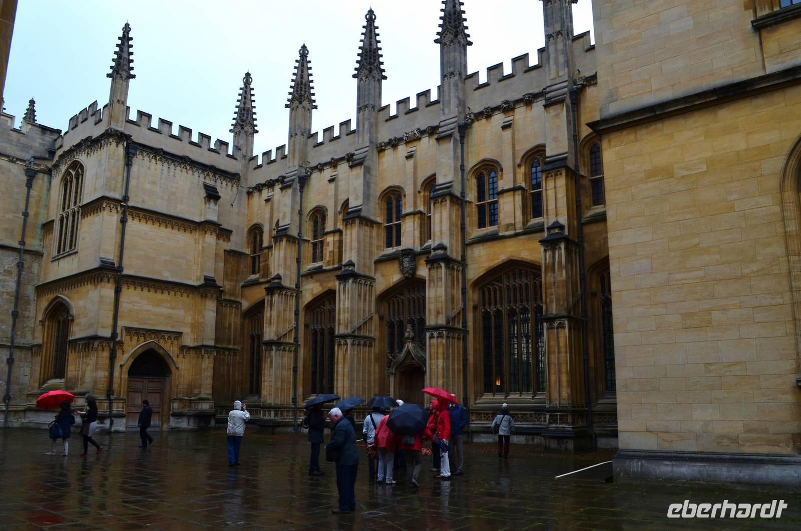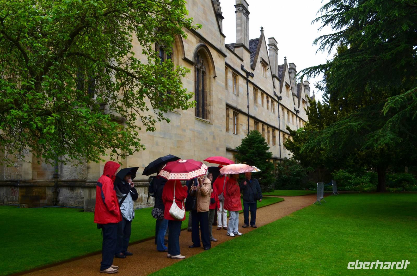 An diesem Morgen war der Himmel teils heiter, teils mit dicken Wolken bedeckt und es herrschte kühles Wetter, aber glücklicherweise kein Regen und Tendenz zu Sonnenschein. Wir fuhren nach dem Frühstück hinüber nach Windsor. Vom Coach-Parkplatz liefen wir gemeinsam zum Bahnhof hinauf, den Bahnsteig entlang bis zur alten Lok des Regierungszuges von Queen Victoria und weiter durch Fußgängerzone Richtung Castle. Die hübschen Gassen der Stadt waren erstes Ziel unseres Spazierganges. Über das Besucherzentrum betraten wir danach die weitläufige Schlossanlage, Orientierungspläne wurden verteilt und deutsch-sprachige Audioguides besorgt. Dann spazierten wir durch die Festungsanlagen zuerst zu den Innenräumen des Schlosses und begannen hier die individuelle Besichtigung. Die Schlosswache trug die Paradeuniform. Mittags, zurück am Bus, starteten wir zu unserem nächsten Reiseziel, der Stadt Oxford. Am Trinity College trafen wir unsere Stadtführerin Ursula, die uns dort, trotz Regen freudig in Empfang nahm. Sie führten uns wunderbar durch die Stadt der Colleges. Wir besichtigten zuerst das Trinity College, mit seinem Speiseraum, der Kapelle und dem Garten. Den Eintritt finanzierten wir vom eberhardt-Wow. Danach sahen wir uns die Gebäude der Universität an, die alte Bibliothek, die Universitätskirche, die Seufzerbrücke und erfuhren viel über die britischen Bildungswege und die möglichen Abschlüsse. Als Nächstes folgte der Besuch des Wadham Colleges mit seiner Kapelle und dem schönen Garten. Bevor wir uns am Ashmolon Museum führ die Weiterfahrt trafen, spazierten wir noch durch die Markthalle von Oxford.
