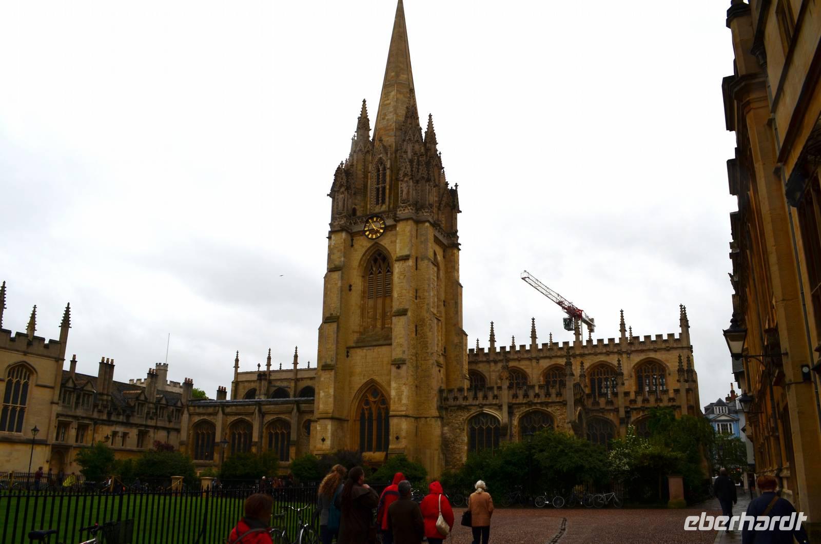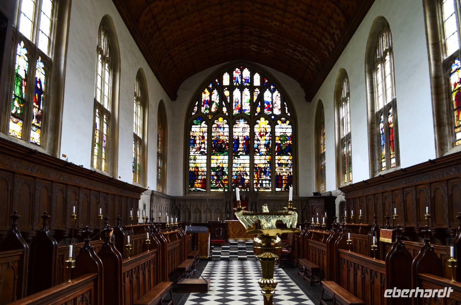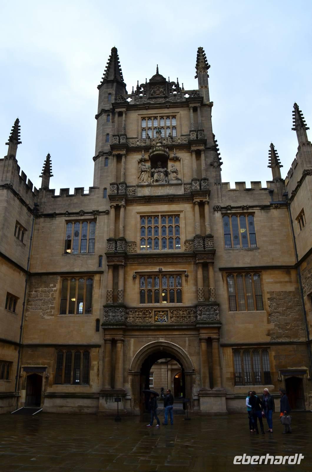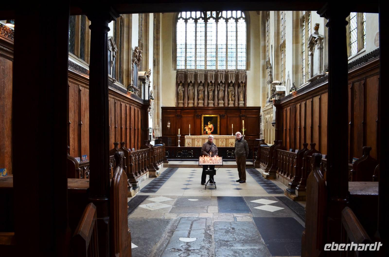 An diesem Morgen war der Himmel teils heiter, teils mit dicken Wolken bedeckt und es herrschte kühles Wetter, aber glücklicherweise kein Regen und Tendenz zu Sonnenschein. Wir fuhren nach dem Frühstück hinüber nach Windsor. Vom Coach-Parkplatz liefen wir gemeinsam zum Bahnhof hinauf, den Bahnsteig entlang bis zur alten Lok des Regierungszuges von Queen Victoria und weiter durch Fußgängerzone Richtung Castle. Die hübschen Gassen der Stadt waren erstes Ziel unseres Spazierganges. Über das Besucherzentrum betraten wir danach die weitläufige Schlossanlage, Orientierungspläne wurden verteilt und deutsch-sprachige Audioguides besorgt. Dann spazierten wir durch die Festungsanlagen zuerst zu den Innenräumen des Schlosses und begannen hier die individuelle Besichtigung. Die Schlosswache trug die Paradeuniform. Mittags, zurück am Bus, starteten wir zu unserem nächsten Reiseziel, der Stadt Oxford. Am Trinity College trafen wir unsere Stadtführerin Ursula, die uns dort, trotz Regen freudig in Empfang nahm. Sie führten uns wunderbar durch die Stadt der Colleges. Wir besichtigten zuerst das Trinity College, mit seinem Speiseraum, der Kapelle und dem Garten. Den Eintritt finanzierten wir vom eberhardt-Wow. Danach sahen wir uns die Gebäude der Universität an, die alte Bibliothek, die Universitätskirche, die Seufzerbrücke und erfuhren viel über die britischen Bildungswege und die möglichen Abschlüsse. Als Nächstes folgte der Besuch des Wadham Colleges mit seiner Kapelle und dem schönen Garten. Bevor wir uns am Ashmolon Museum führ die Weiterfahrt trafen, spazierten wir noch durch die Markthalle von Oxford.