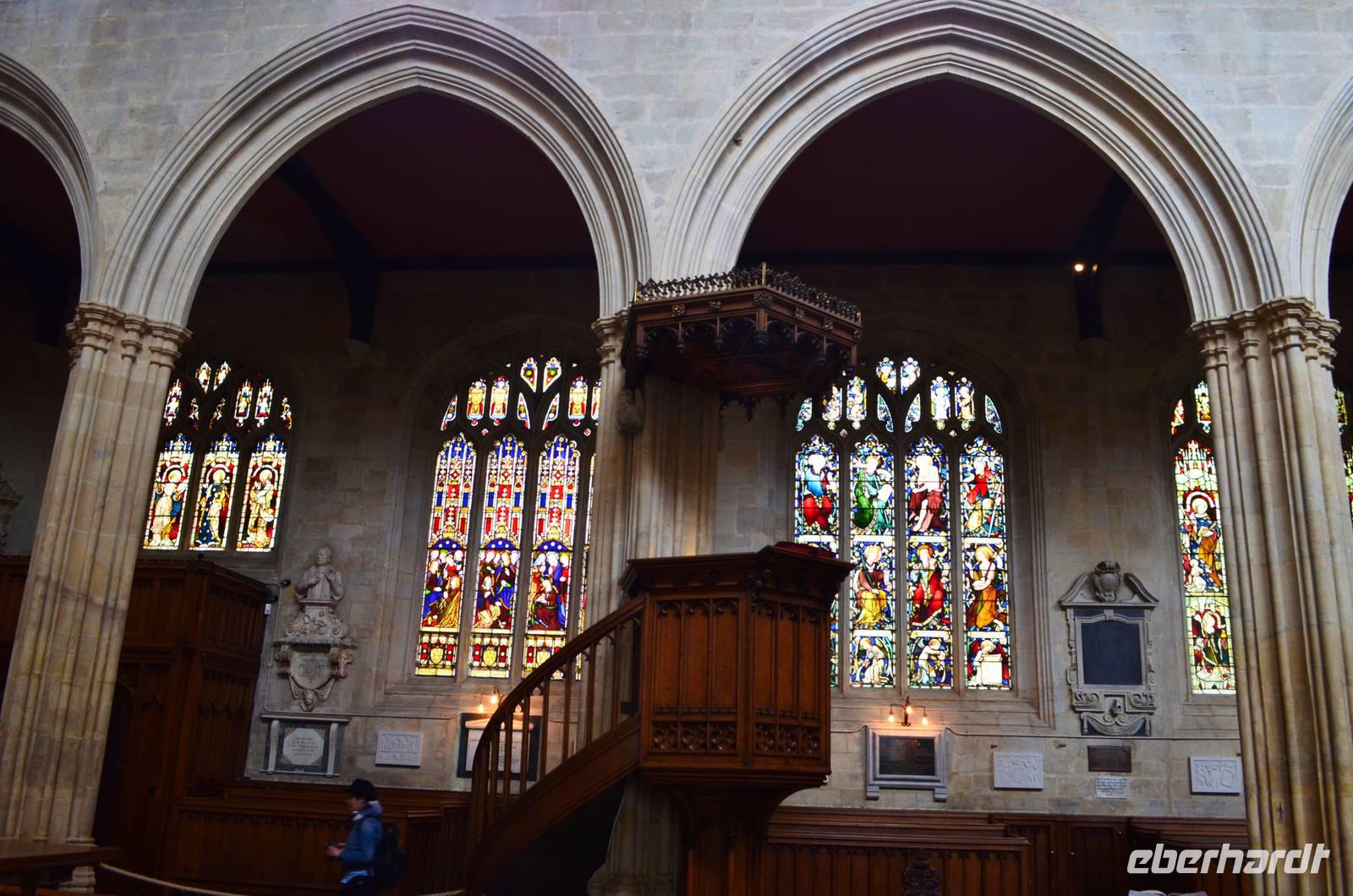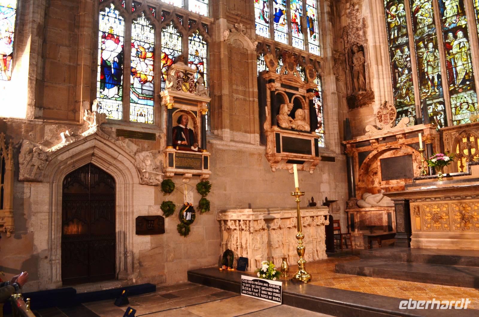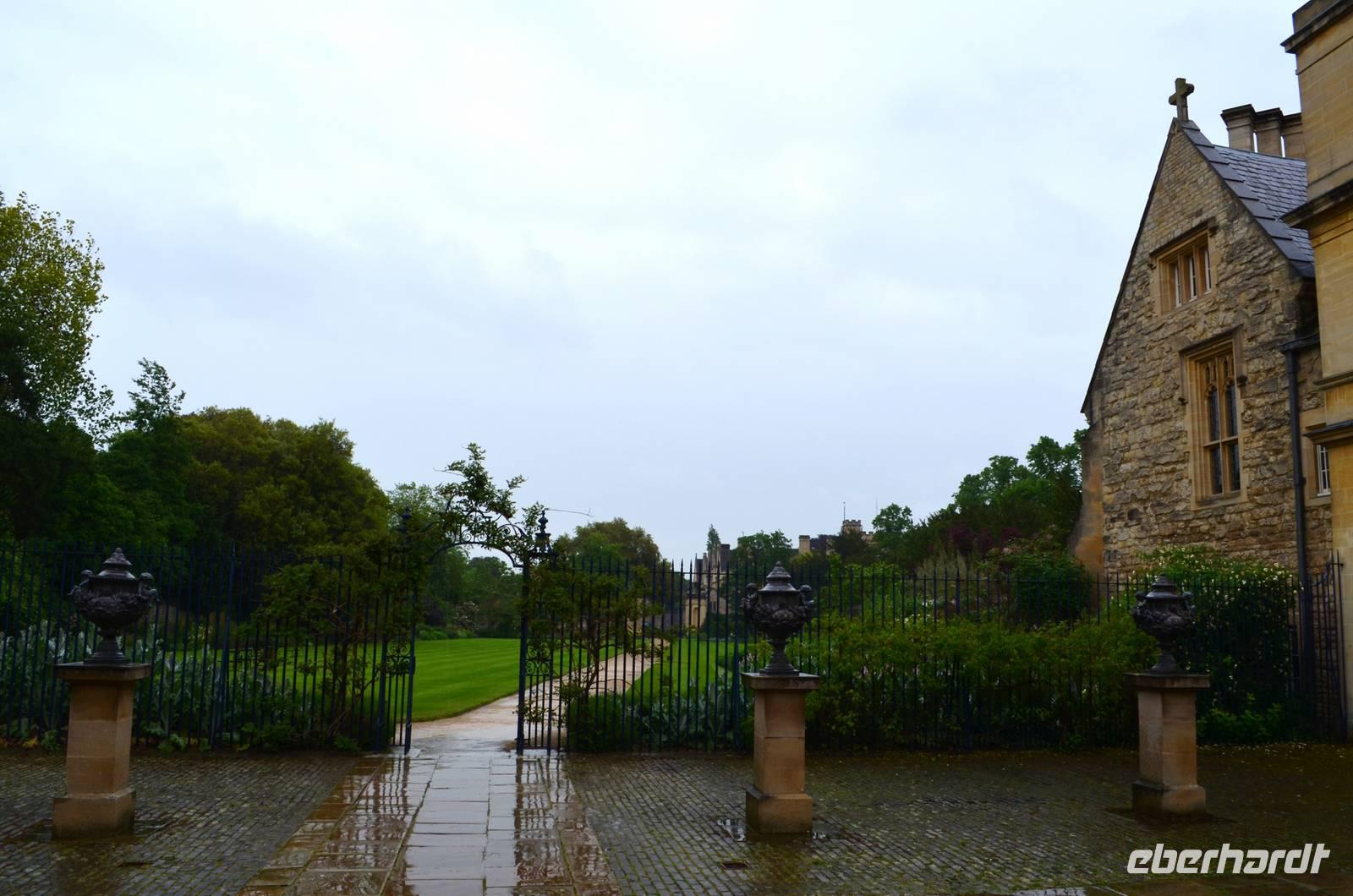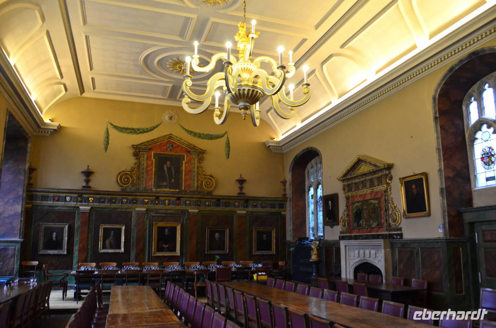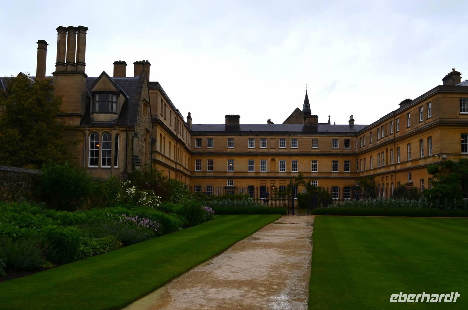 An diesem Morgen war der Himmel teils heiter, teils mit dicken Wolken bedeckt und es herrschte kühles Wetter, aber glücklicherweise kein Regen und Tendenz zu Sonnenschein. Wir fuhren nach dem Frühstück hinüber nach Windsor. Vom Coach-Parkplatz liefen wir gemeinsam zum Bahnhof hinauf, den Bahnsteig entlang bis zur alten Lok des Regierungszuges von Queen Victoria und weiter durch Fußgängerzone Richtung Castle. Die hübschen Gassen der Stadt waren erstes Ziel unseres Spazierganges. Über das Besucherzentrum betraten wir danach die weitläufige Schlossanlage, Orientierungspläne wurden verteilt und deutsch-sprachige Audioguides besorgt. Dann spazierten wir durch die Festungsanlagen zuerst zu den Innenräumen des Schlosses und begannen hier die individuelle Besichtigung. Die Schlosswache trug die Paradeuniform. Mittags, zurück am Bus, starteten wir zu unserem nächsten Reiseziel, der Stadt Oxford. Am Trinity College trafen wir unsere Stadtführerin Ursula, die uns dort, trotz Regen freudig in Empfang nahm. Sie führten uns wunderbar durch die Stadt der Colleges. Wir besichtigten zuerst das Trinity College, mit seinem Speiseraum, der Kapelle und dem Garten. Den Eintritt finanzierten wir vom eberhardt-Wow. Danach sahen wir uns die Gebäude der Universität an, die alte Bibliothek, die Universitätskirche, die Seufzerbrücke und erfuhren viel über die britischen Bildungswege und die möglichen Abschlüsse. Als Nächstes folgte der Besuch des Wadham Colleges mit seiner Kapelle und dem schönen Garten. Bevor wir uns am Ashmolon Museum führ die Weiterfahrt trafen, spazierten wir noch durch die Markthalle von Oxford.