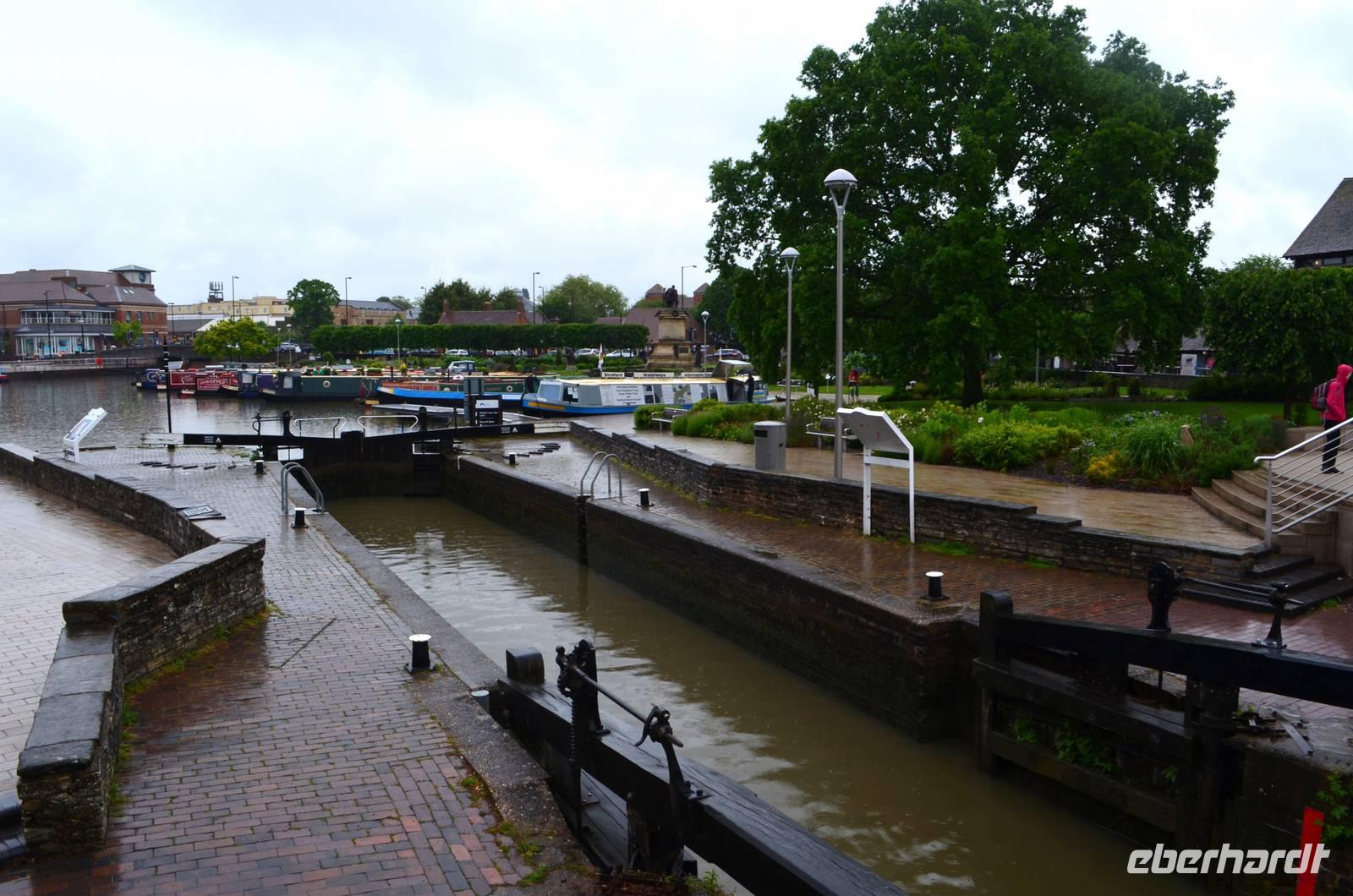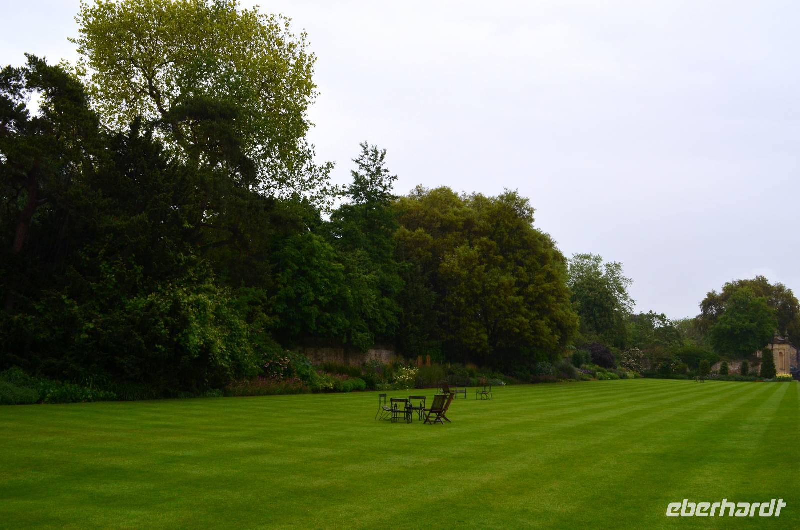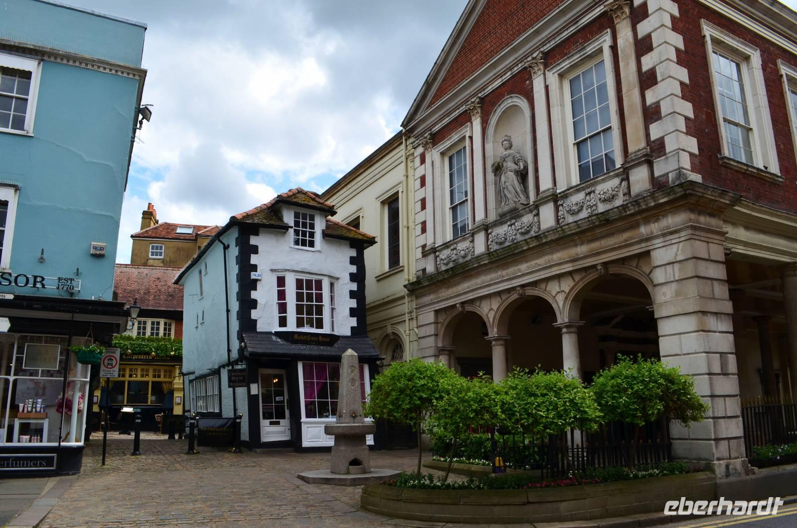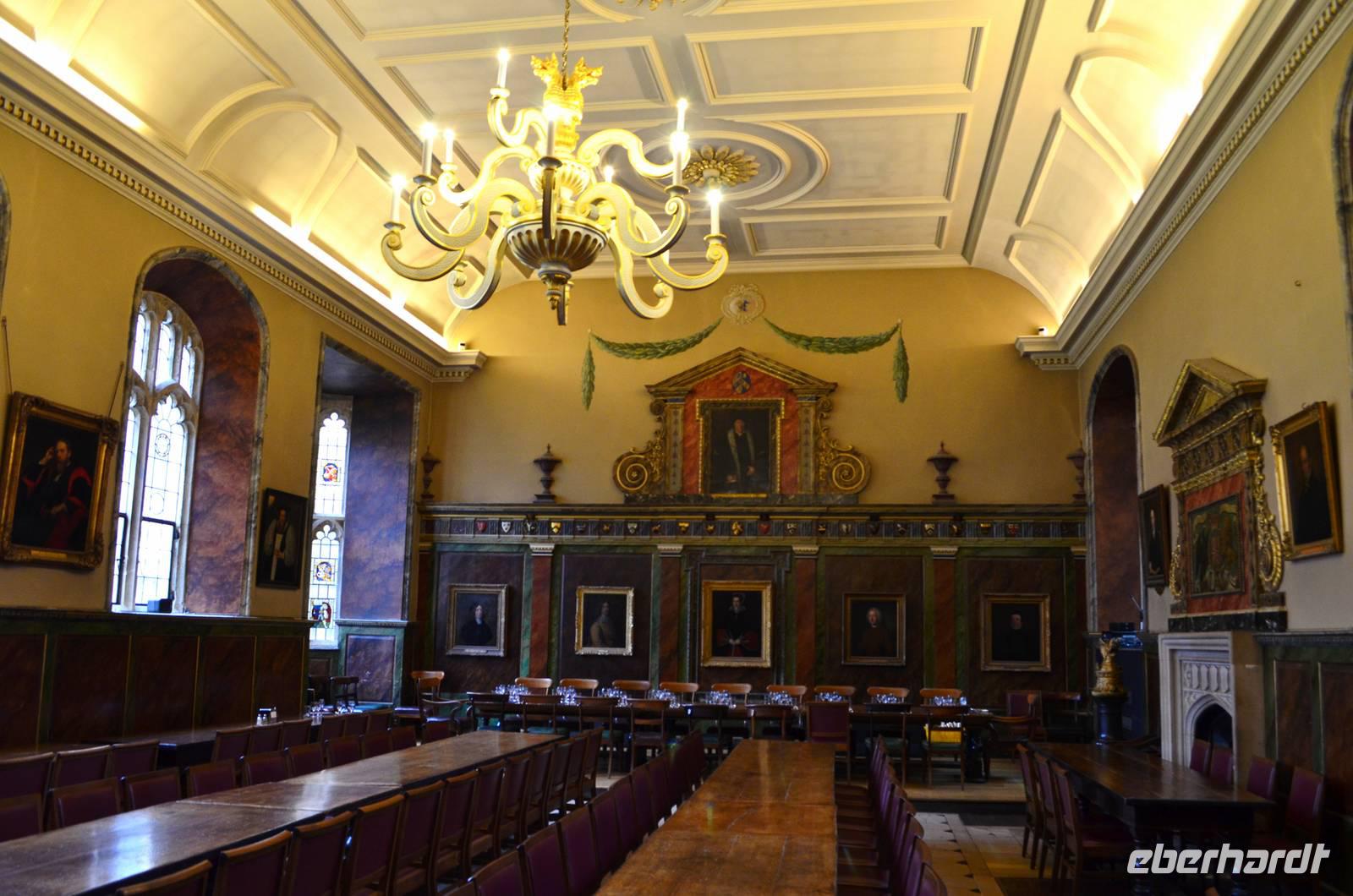 An diesem Morgen war der Himmel teils heiter, teils mit dicken Wolken bedeckt und es herrschte kühles Wetter, aber glücklicherweise kein Regen und Tendenz zu Sonnenschein. Wir fuhren nach dem Frühstück hinüber nach Windsor. Vom Coach-Parkplatz liefen wir gemeinsam zum Bahnhof hinauf, den Bahnsteig entlang bis zur alten Lok des Regierungszuges von Queen Victoria und weiter durch Fußgängerzone Richtung Castle. Die hübschen Gassen der Stadt waren erstes Ziel unseres Spazierganges. Über das Besucherzentrum betraten wir danach die weitläufige Schlossanlage, Orientierungspläne wurden verteilt und deutsch-sprachige Audioguides besorgt. Dann spazierten wir durch die Festungsanlagen zuerst zu den Innenräumen des Schlosses und begannen hier die individuelle Besichtigung. Die Schlosswache trug die Paradeuniform. Mittags, zurück am Bus, starteten wir zu unserem nächsten Reiseziel, der Stadt Oxford. Am Trinity College trafen wir unsere Stadtführerin Ursula, die uns dort, trotz Regen freudig in Empfang nahm. Sie führten uns wunderbar durch die Stadt der Colleges. Wir besichtigten zuerst das Trinity College, mit seinem Speiseraum, der Kapelle und dem Garten. Den Eintritt finanzierten wir vom eberhardt-Wow. Danach sahen wir uns die Gebäude der Universität an, die alte Bibliothek, die Universitätskirche, die Seufzerbrücke und erfuhren viel über die britischen Bildungswege und die möglichen Abschlüsse. Als Nächstes folgte der Besuch des Wadham Colleges mit seiner Kapelle und dem schönen Garten. Bevor wir uns am Ashmolon Museum führ die Weiterfahrt trafen, spazierten wir noch durch die Markthalle von Oxford.