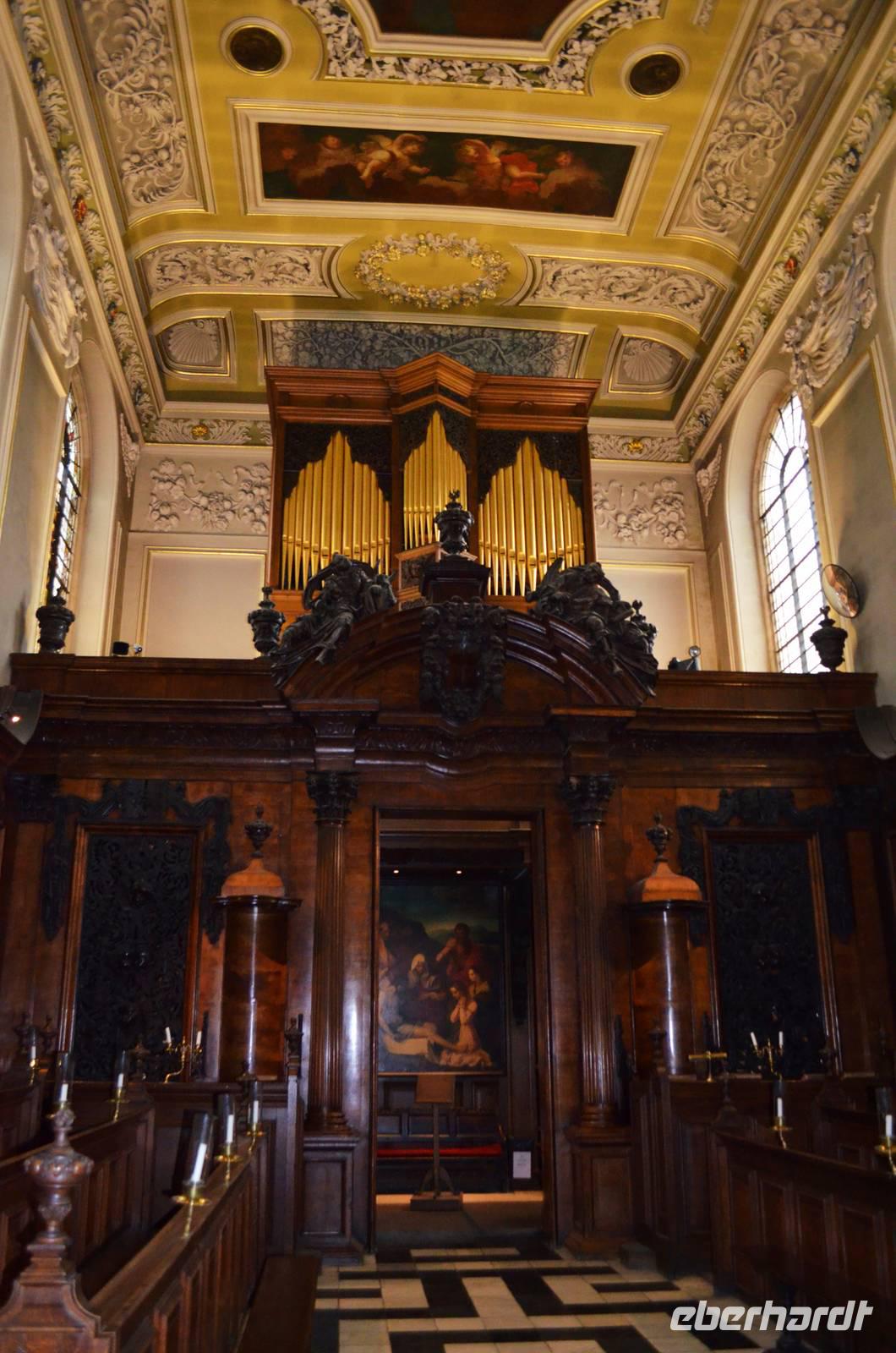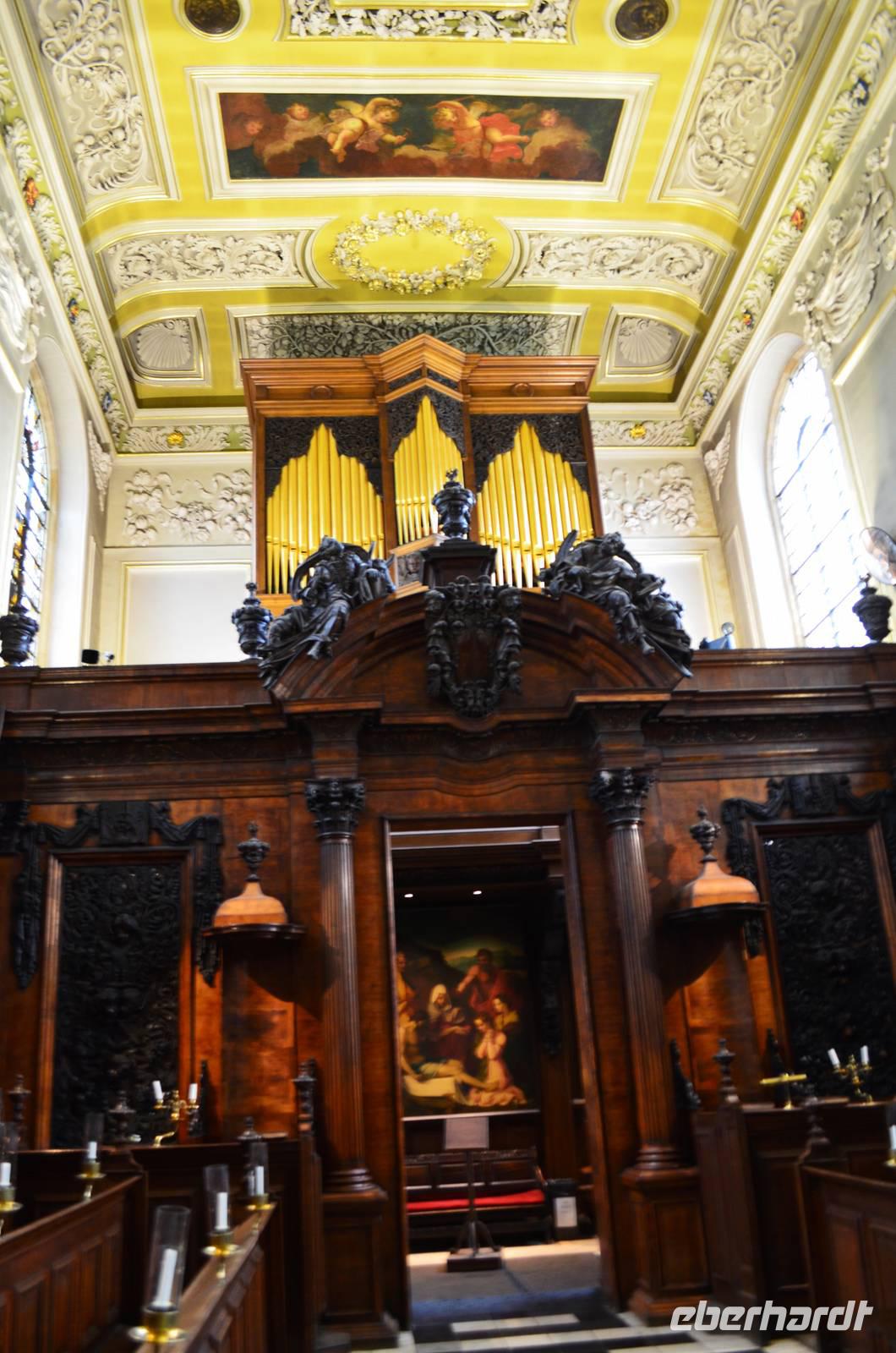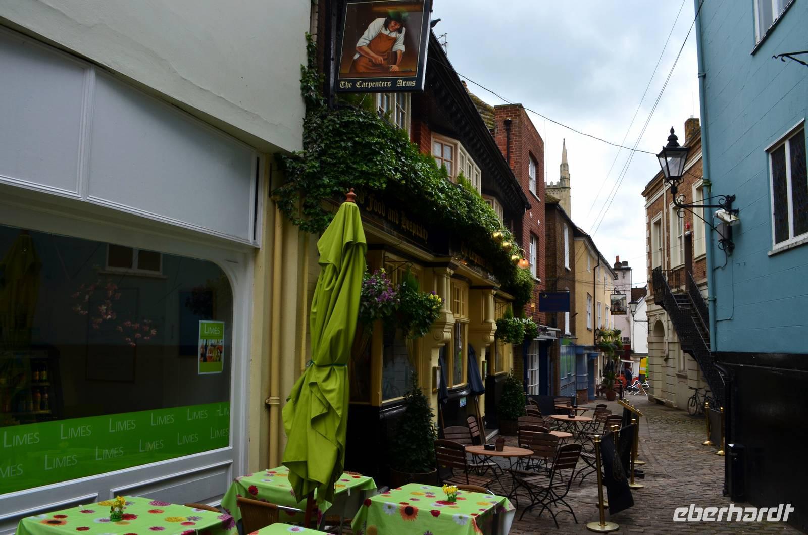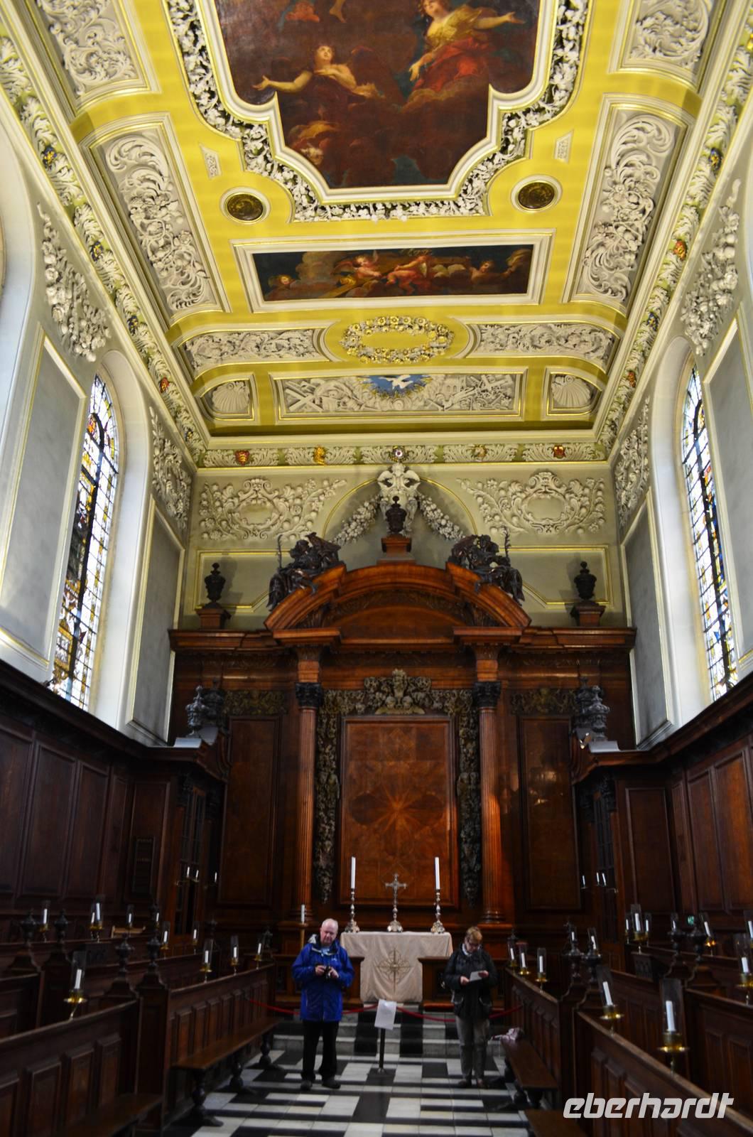 An diesem Morgen war der Himmel teils heiter, teils mit dicken Wolken bedeckt und es herrschte kühles Wetter, aber glücklicherweise kein Regen und Tendenz zu Sonnenschein. Wir fuhren nach dem Frühstück hinüber nach Windsor. Vom Coach-Parkplatz liefen wir gemeinsam zum Bahnhof hinauf, den Bahnsteig entlang bis zur alten Lok des Regierungszuges von Queen Victoria und weiter durch Fußgängerzone Richtung Castle. Die hübschen Gassen der Stadt waren erstes Ziel unseres Spazierganges. Über das Besucherzentrum betraten wir danach die weitläufige Schlossanlage, Orientierungspläne wurden verteilt und deutsch-sprachige Audioguides besorgt. Dann spazierten wir durch die Festungsanlagen zuerst zu den Innenräumen des Schlosses und begannen hier die individuelle Besichtigung. Die Schlosswache trug die Paradeuniform. Mittags, zurück am Bus, starteten wir zu unserem nächsten Reiseziel, der Stadt Oxford. Am Trinity College trafen wir unsere Stadtführerin Ursula, die uns dort, trotz Regen freudig in Empfang nahm. Sie führten uns wunderbar durch die Stadt der Colleges. Wir besichtigten zuerst das Trinity College, mit seinem Speiseraum, der Kapelle und dem Garten. Den Eintritt finanzierten wir vom eberhardt-Wow. Danach sahen wir uns die Gebäude der Universität an, die alte Bibliothek, die Universitätskirche, die Seufzerbrücke und erfuhren viel über die britischen Bildungswege und die möglichen Abschlüsse. Als Nächstes folgte der Besuch des Wadham Colleges mit seiner Kapelle und dem schönen Garten. Bevor wir uns am Ashmolon Museum führ die Weiterfahrt trafen, spazierten wir noch durch die Markthalle von Oxford.