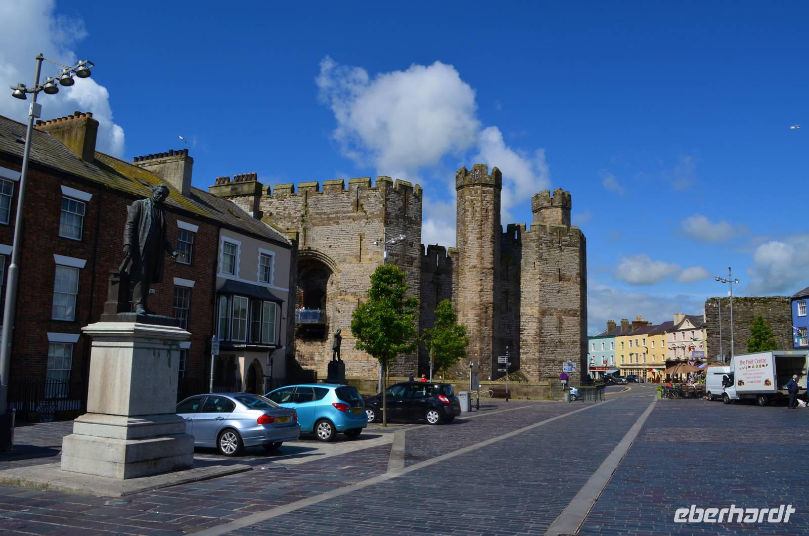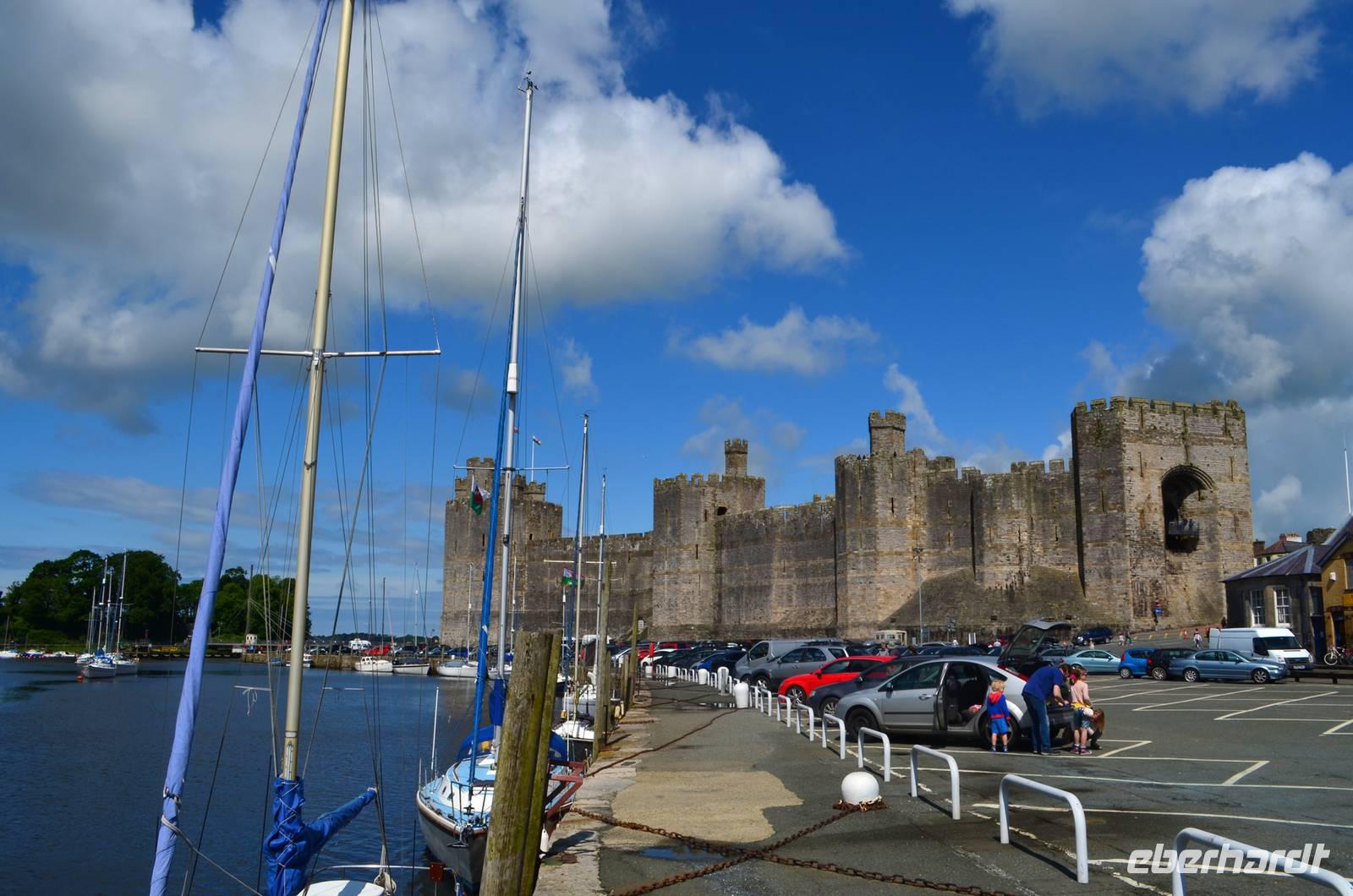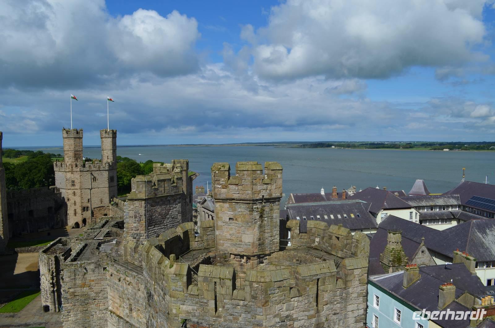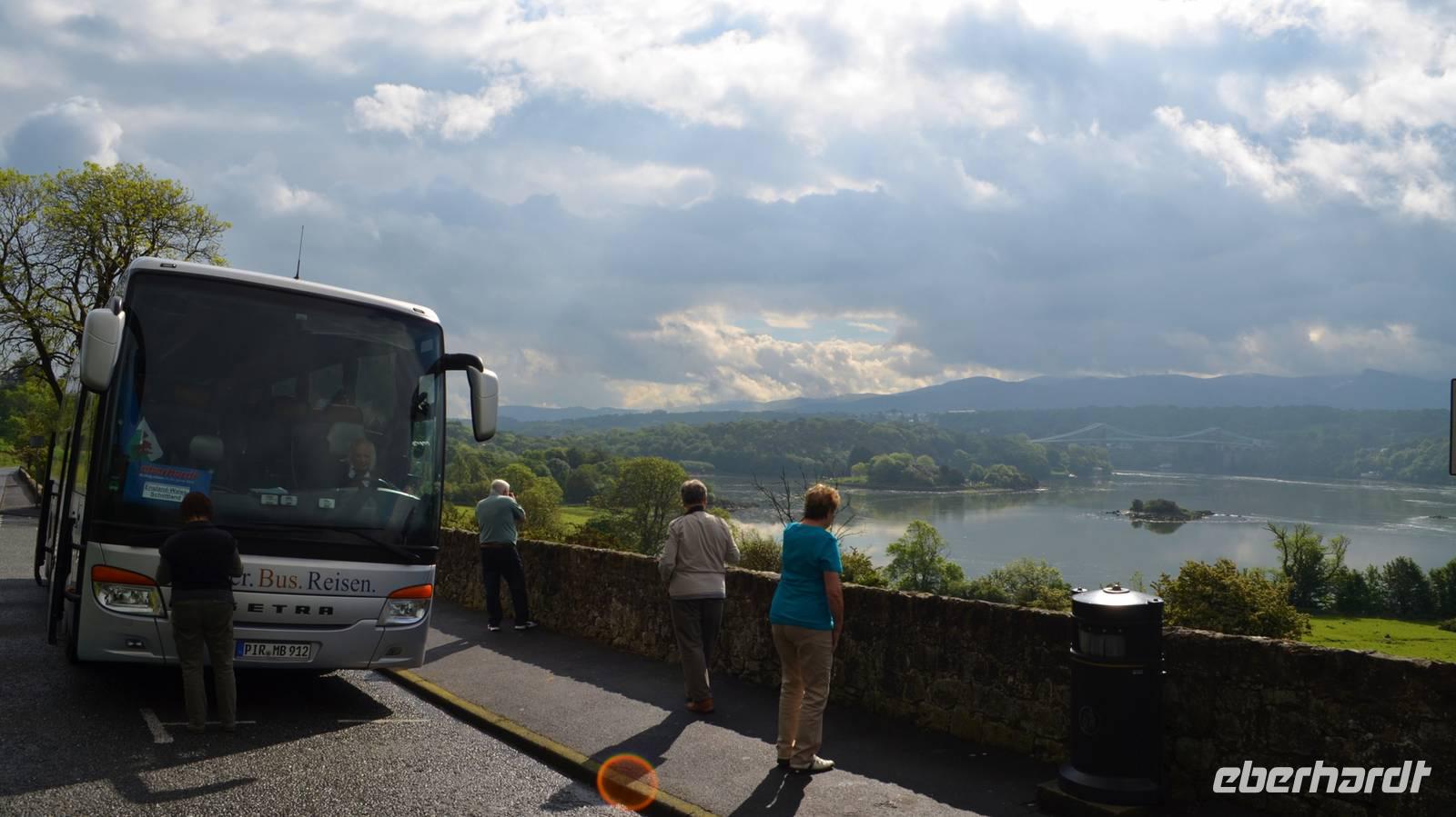 Insel Anglesey. Wir fahren über Telford's Menai Bridge nach Llanfairpwllgwyngyllgogerychwyrndrobwllllantysiliogogogoch, dem Ort mit dem längsten Namen der Welt, den uns die nette Dame vom Visitor Center gern mehrmals wiederholend aufsagt. Über die Britannia Bridge fahren wir anschließend nach Caernarfon. Hier gehen wir gemeinsam durch das Stadttor hinein in die Stadt und hinüber zu den hohen Mauern der mächtigen Burg. Wir besichtigen diese gewaltige Anlage, mit ihren Ausstellungen in den verschiedenen Türmen und Gebäuden. Die schwarzen, rund angeordnete