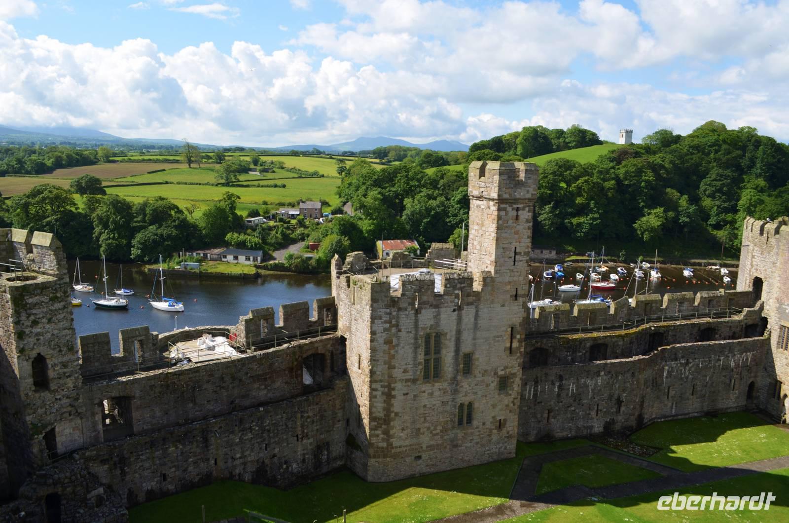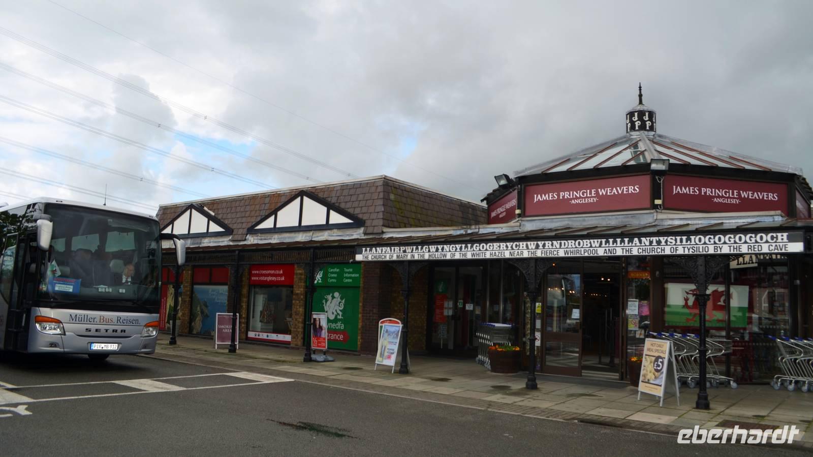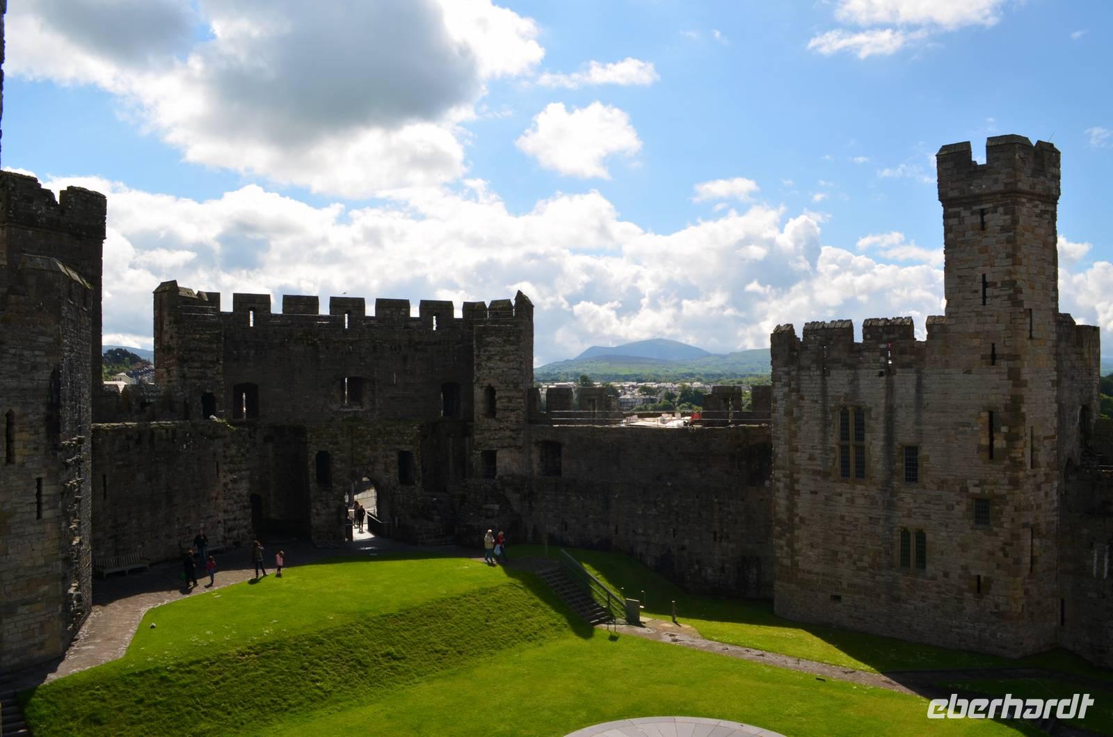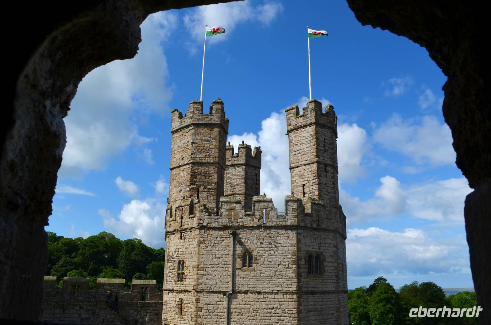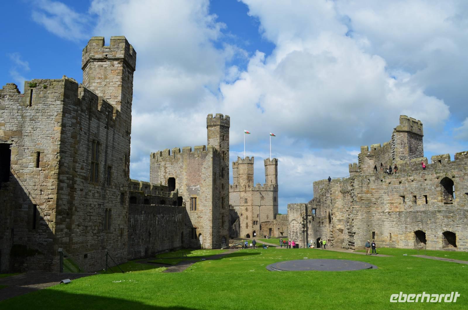 Insel Anglesey. Wir fahren über Telford's Menai Bridge nach Llanfairpwllgwyngyllgogerychwyrndrobwllllantysiliogogogoch, dem Ort mit dem längsten Namen der Welt, den uns die nette Dame vom Visitor Center gern mehrmals wiederholend aufsagt. Über die Britannia Bridge fahren wir anschließend nach Caernarfon. Hier gehen wir gemeinsam durch das Stadttor hinein in die Stadt und hinüber zu den hohen Mauern der mächtigen Burg. Wir besichtigen diese gewaltige Anlage, mit ihren Ausstellungen in den verschiedenen Türmen und Gebäuden. Die schwarzen, rund angeordnete