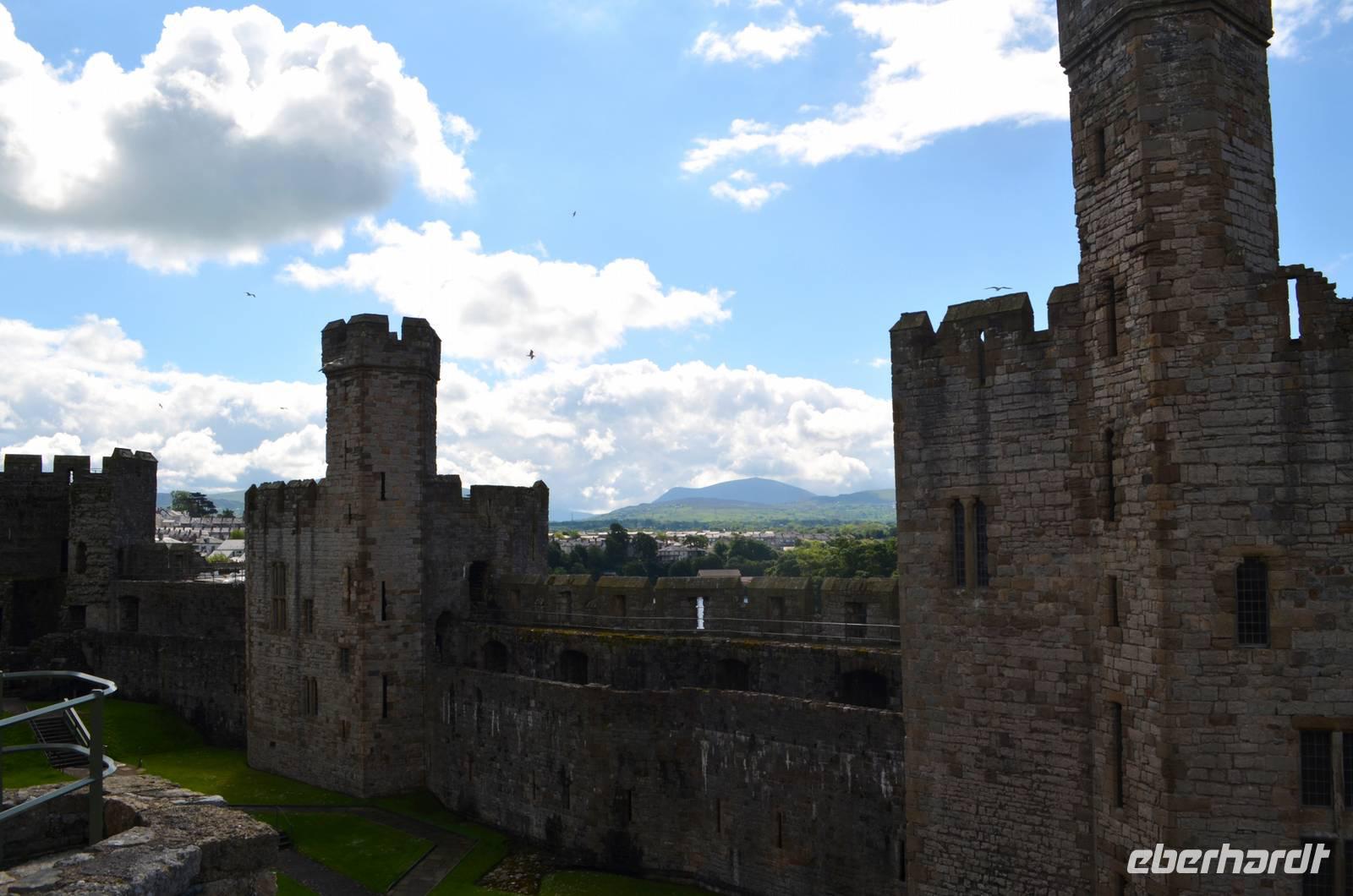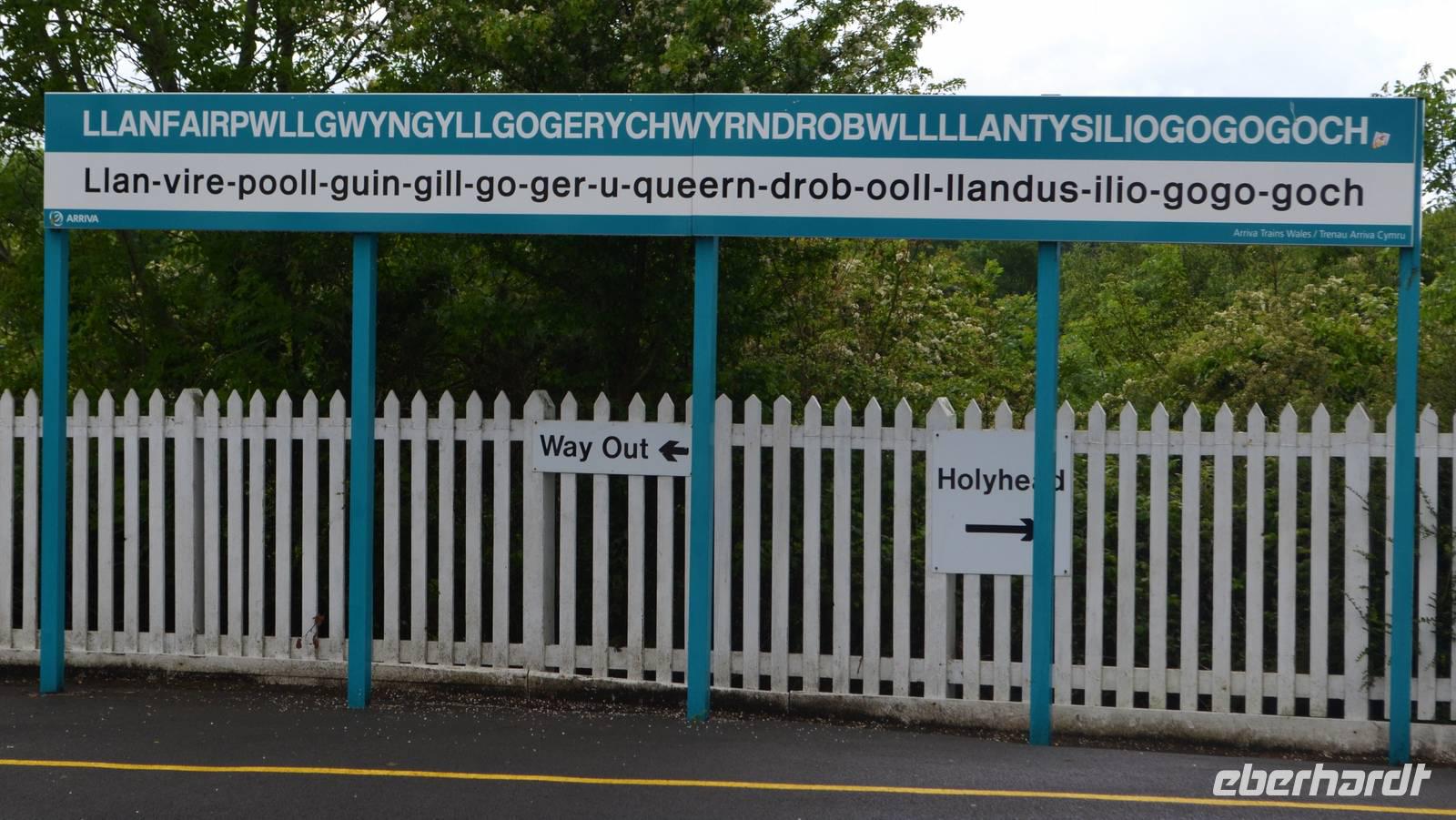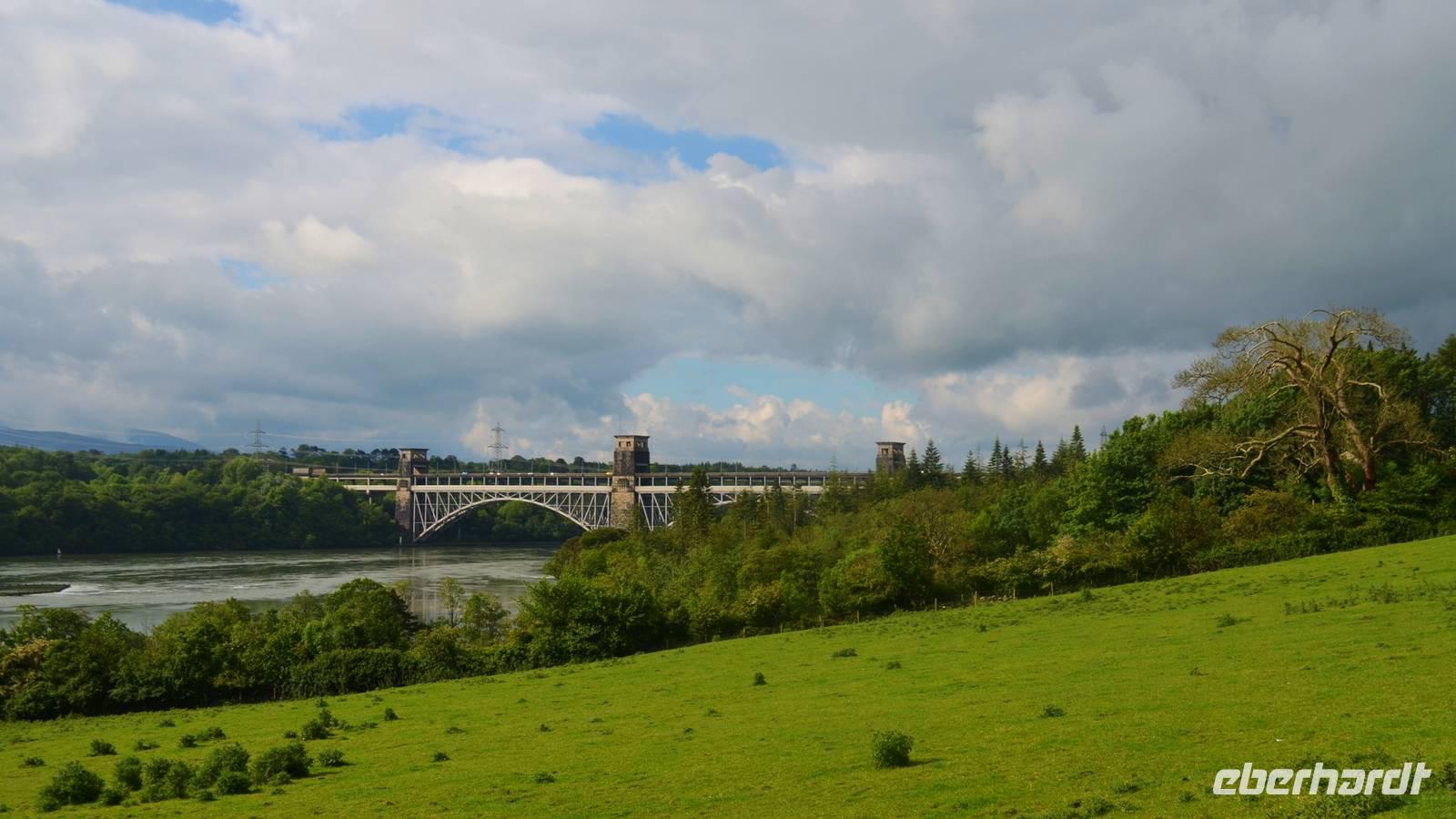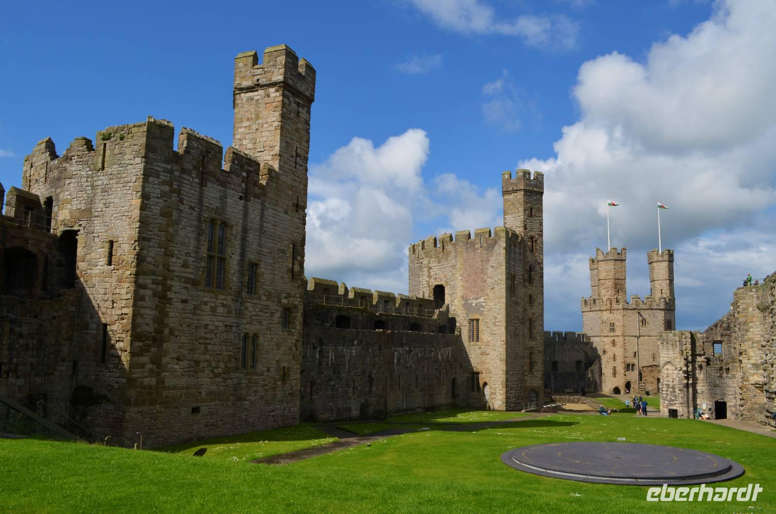 Insel Anglesey. Wir fahren über Telford's Menai Bridge nach Llanfairpwllgwyngyllgogerychwyrndrobwllllantysiliogogogoch, dem Ort mit dem längsten Namen der Welt, den uns die nette Dame vom Visitor Center gern mehrmals wiederholend aufsagt. Über die Britannia Bridge fahren wir anschließend nach Caernarfon. Hier gehen wir gemeinsam durch das Stadttor hinein in die Stadt und hinüber zu den hohen Mauern der mächtigen Burg. Wir besichtigen diese gewaltige Anlage, mit ihren Ausstellungen in den verschiedenen Türmen und Gebäuden. Die schwarzen, rund angeordnete