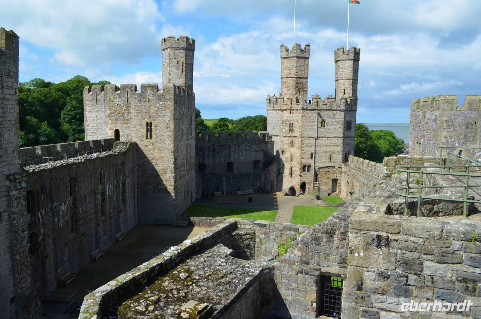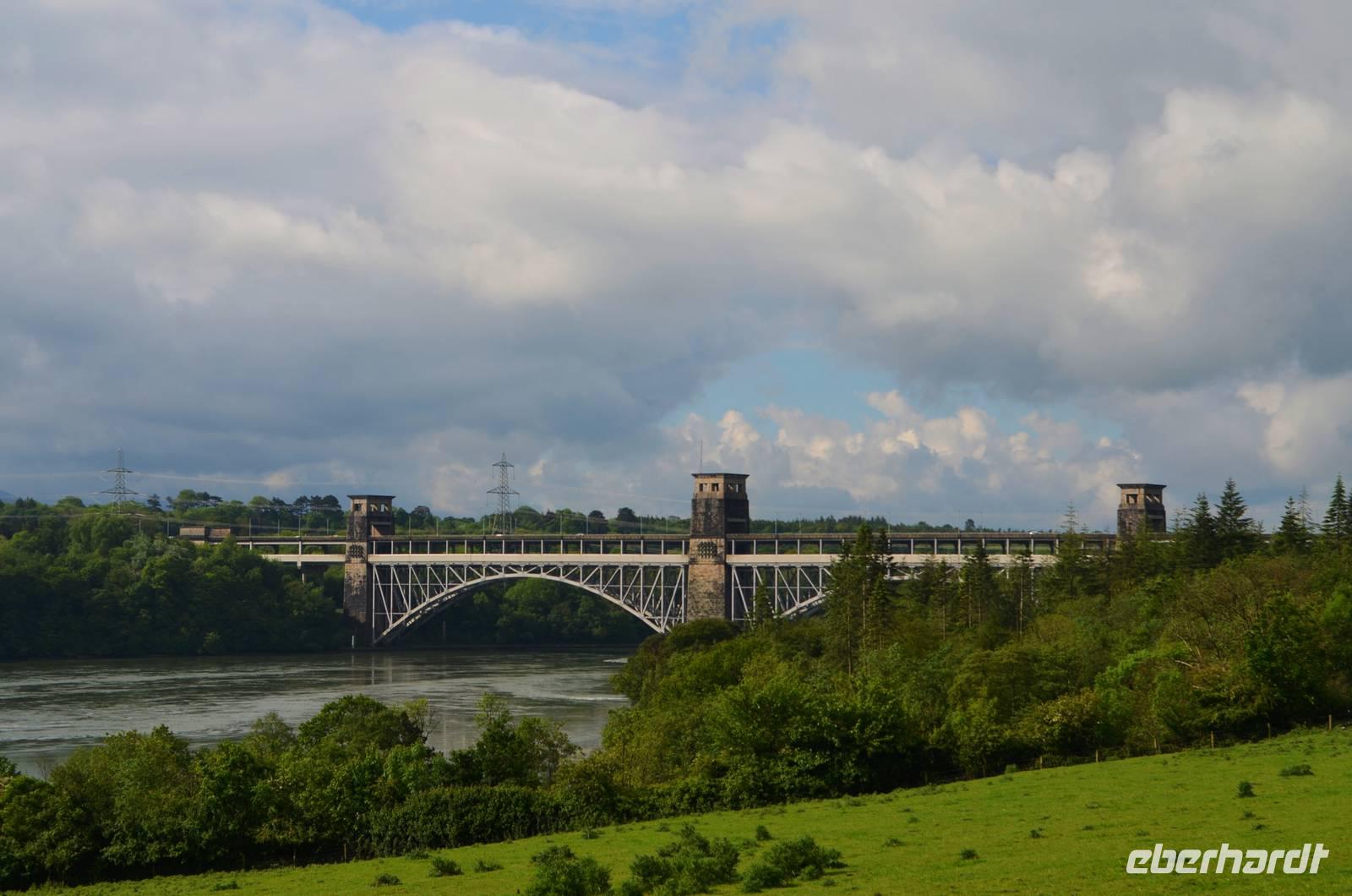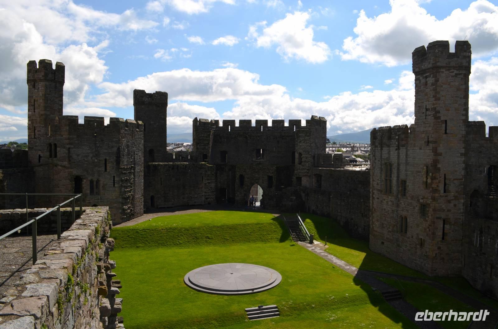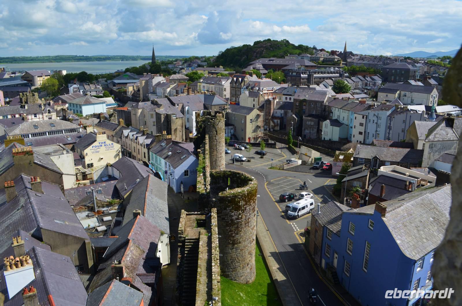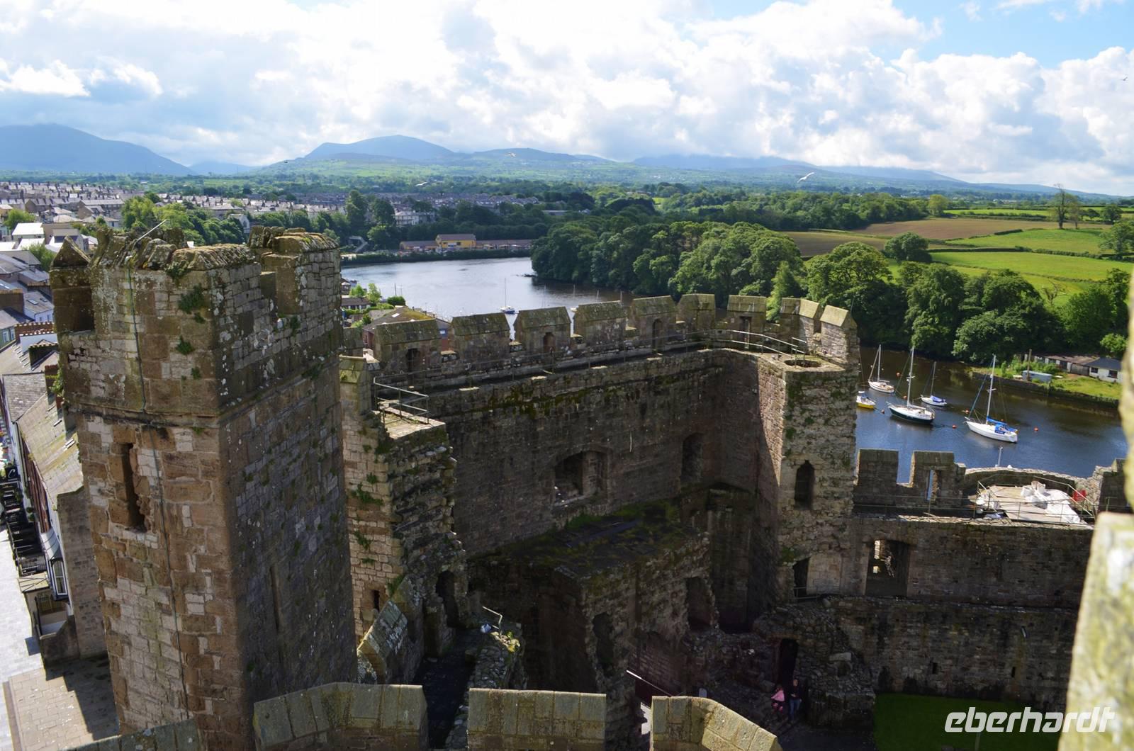 Insel Anglesey. Wir fahren über Telford's Menai Bridge nach Llanfairpwllgwyngyllgogerychwyrndrobwllllantysiliogogogoch, dem Ort mit dem längsten Namen der Welt, den uns die nette Dame vom Visitor Center gern mehrmals wiederholend aufsagt. Über die Britannia Bridge fahren wir anschließend nach Caernarfon. Hier gehen wir gemeinsam durch das Stadttor hinein in die Stadt und hinüber zu den hohen Mauern der mächtigen Burg. Wir besichtigen diese gewaltige Anlage, mit ihren Ausstellungen in den verschiedenen Türmen und Gebäuden. Die schwarzen, rund angeordnete